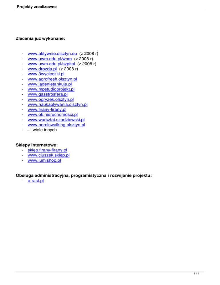Projekty zrealizowne Zlecenia już wykonane: - www.aktywnie.olsztyn.eu (z 2008 r) - www.uwm.edu.pl/wnm (z 2008 r) - www.uwm.edu.pl/szpital (z 2008 r) - www.drozda.pl (z 2008 r) - www.3wycieczki.pl - www.agrofresh.olsztyn.pl - www.jadenietankuje.pl - www.mpstudioprojekt.pl - www.gasstrosfera.pl - www.ogryzek.olsztyn.pl - www.naukaplywania.olsztyn.pl - www.firany-firany.pl - www.ok.nieruchomosci.pl - www.warsztat.szadziewski.pl - www.nordicwalking.olsztyn.pl - ...i wiele innych Sklepy internetowe: - sklep.firany-firany.pl - www.ciuszek.sklep.pl - www.lumishop.pl Obsługa administracyjna, programistyczna i rozwijanie projektu: - e-rast.pl 1/1