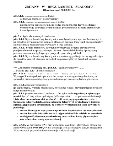 ZMIANY W REGULAMINIE SLALOMU Obowiązują od 30.03.2011r. pkt.3.1.1. po pozycji -Kierownik techniczny dodać: - sędziowie bramkowi koordynatorzy, pkt. 3.2.2. ..po zapisie -.."zezwala zawodnikowi" podpkt. 5 dodać: - na podstawie zapisu oficjalnego wideo może zmienić decyzję sędziego bramkowego dotyczącą oceny bramki, po konsultacji z sędzią bramkowym i koordynatorem. pkt.3.4. Sędzia bramkowy koordynator. pkt. 3.4.1. Sędzia bramkowy koordynator koordynuje pracą sędziów bramkowych na przydzielonym mu przez sędziego głównego odcinku trasy i jest odpowiedzialny za prawidłowe przekazywanie wyników z tego odcinka. pkt. 3.4.2. Sędzia bramkowy koordynator obserwuje i ocenia prawidłowość przejazdu bramek na przydzielonym odcinku. Prowadzi dokładną i przejrzystą pisemną dokumentację dotyczącą przejazdu przez dany odcinek. pkt. 3.4.3. Sędzia bramkowy koordynator wyraźnie sygnalizuje tarczą sygnalizującą ile punktów karnych otrzymał zawodnik na poszczególnych bramkach danego odcinka. *** Zmieniamy numerację pkt.: pkt.3.5.” Sędzia bramkowy” ....... ... i tak do pkt. 3.13. „Funkcjonariusze”. pkt. 3.11.1 (stara nr 3.10.1) po słowach..."przepisów pkt.2.1.8." - dodać W przypadku niezgodności parametrów sprzętu z wymogami regulaminowymi, sporządza pisemną notatkę, którą niezwłocznie przekazuje sędziemu głównemu. pkt. 5.1.2. dodajemy podpunkt : g). zapewnienie, w miarę możliwości, oficjalnego widea przynajmniej na zwodach rangi mistrzowskiej. pkt. 5.3.2. po słowach(wzór nr1) zmienić ... Do zgłoszenia organizacja zgłaszająca musi dołączyć listę zbiorczą drużyny (alfabetycznie) ...... –z podaniem ich funkcji. Lista zbiorcza musi również zawierać treść następującego oświadczenia: „ Świadomy odpowiedzialności za składanie fałszywych oświadczeń w imieniu zgłaszającego klubu oświadczam, że wszyscy wymienieni na liście zawodnicy posiadają: - ważną licencję na wyczynowe uprawianie kajakarstwa i są ubezpieczeni, - ważne badania lekarskie stwierdzające zdolność do udziału w zawodach, - umiejętność pływania potwierdzoną powszechną kartą pływacką lub oświadczeniem osoby upoważnionej . pkt. 6.7.13. W przypadku DNF przy obliczaniu wyników i klasyfikacji stosuje się zapis 999 sekund. Przy DSQ-R nie dokonuje się klasyfikacji w danym przejeździe. W pozostałych przypadkach nie dokonuje się klasyfikacji. pkt. 6.9. 4 dodać zdanie: O zamiarze złożenia protestu należy powiadomić sędziego głównego do 5-ciu minut, po ogłoszeniu wyników. Na str. 53 –IV wzory druków: Wzór nr 1 zmienić, zamiast nr leg. zawodniczej wpisać „ nr licencji”. Pod tabelką zmienić tekst na : „ Świadomy odpowiedzialności za składanie fałszywych oświadczeń w imieniu zgłaszającego klubu oświadczam, że wszyscy wymienieni na liście zawodnicy posiadają: - ważną licencję na wyczynowe uprawianie kajakarstwa i są ubezpieczeni, - ważne badania lekarskie stwierdzające zdolność do udziału w zawodach, - umiejętność pływania potwierdzoną powszechną kartą pływacką lub oświadczeniem osoby upoważnionej . .............................. ...................................... organizacja zgłaszająca nazwisko, imię i podpis osoby zgłaszającej Do wzorów dodać –wzór nr 7: „Protest” Data....................... Czas....................... Kierownik ekipy............................. Klub................................................ Zgłaszam protest zawodnika..................................................... Punkty karne ................... zostały przydzielone na bramce nr ....., podczas przejazdu I / II kategorii ............ zawodnikowi z numerem .............. . Proszę o zmianę decyzji z .......... na ............... punktów karnych. UZASADNIENIE: 1.A) Zawodnik z numerem ...... miał utrudniony przejazd bramki przez zawodnika z numerem ..........., podczas przejazdu ........................................... ............................................................................................................................ B) Inne powody: ............................................................................................... ............................................................................................................................ ............................................................................................................................ .................................................................................................................................. 2. Nie dotyczące oceny na bramce: - nie ustąpienie drogi ............................................................................................. - niewłaściwy pomiar czasu.................................................................................... - inne powody......................................................................................................... Dodać wzór nr 8 Karta kontrolera łodzi Wyniki pomiaru łodzi Nr Nazwisko i imię start owy klub 1 2 3 4 Uwagi ....................................... sędzia kontroler łodzi ZMIANY W REGULAMINIE ZJAZDU pkt. 5.3.2. po słowach(wzór nr1)zmienić ... Do zgłoszenia organizacja zgłaszająca musi dołączyć listę zbiorczą drużyny (alfabetycznie) ...... –z podaniem ich funkcji. Lista zbiorcza musi również zawierać treść następującego oświadczenia: „ Świadomy odpowiedzialności za składanie fałszywych oświadczeń w imieniu zgłaszającego klubu oświadczam, że wszyscy wymienieni na liście zawodnicy posiadają: - ważną licenję na wyczynowe uprawianie kajakarstwa i są ubezpieczeni, - ważne badania lekarskie stwierdzające zdolność do udziału w zawodach, - umiejętność pływania potwierdzoną powszechną kartą pływacką lub oświadczeniem osoby upoważnionej . ##Trzeba poprawić pkt na „sytuacjach” rys. nr 84 -na 2 pkt a jest 0. rys. 85 w opisie .....p