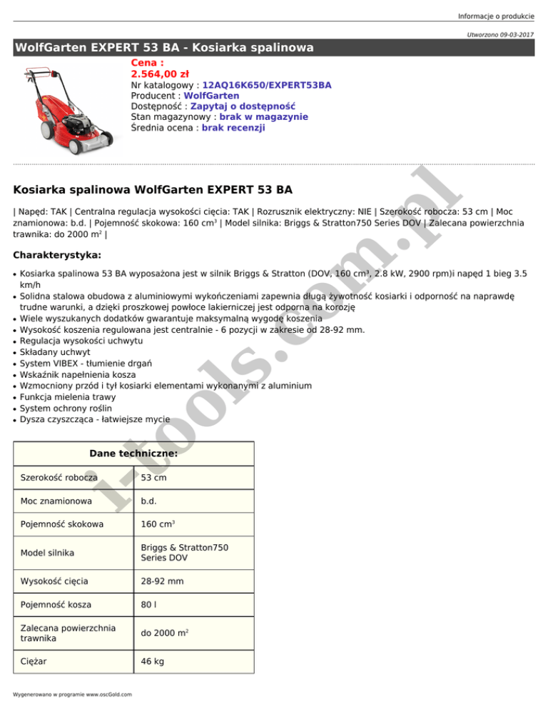 Informacje o produkcie Utworzono 09-03-2017 WolfGarten EXPERT 53 BA - Kosiarka spalinowa Cena : 2.564,00 zł Nr katalogowy : 12AQ16K650/EXPERT53BA Producent : WolfGarten Dostępność : Zapytaj o dostępność Stan magazynowy : brak w magazynie Średnia ocena : brak recenzji m .p l Kosiarka spalinowa WolfGarten EXPERT 53 BA | Napęd: TAK | Centralna regulacja wysokości cięcia: TAK | Rozrusznik elektryczny: NIE | Szerokość robocza: 53 cm | Moc znamionowa: b.d. | Pojemność skokowa: 160 cm3 | Model silnika: Briggs & Stratton750 Series DOV | Zalecana powierzchnia trawnika: do 2000 m2 | Charakterystyka: ● ● ● ● ● ● ● ● ● co ● s. ● Kosiarka spalinowa 53 BA wyposażona jest w silnik Briggs & Stratton (DOV, 160 cm³, 2.8 kW, 2900 rpm)i napęd 1 bieg 3.5 km/h Solidna stalowa obudowa z aluminiowymi wykończeniami zapewnia długą żywotność kosiarki i odporność na naprawdę trudne warunki, a dzięki proszkowej powłoce lakierniczej jest odporna na korozję Wiele wyszukanych dodatków gwarantuje maksymalną wygodę koszenia Wysokość koszenia regulowana jest centralnie - 6 pozycji w zakresie od 28-92 mm. Regulacja wysokości uchwytu Składany uchwyt System VIBEX - tłumienie drgań Wskaźnik napełnienia kosza Wzmocniony przód i tył kosiarki elementami wykonanymi z aluminium Funkcja mielenia trawy System ochrony roślin Dysza czyszcząca - łatwiejsze mycie to ol ● Dane techniczne: 53 cm Moc znamionowa b.d. Pojemność skokowa 160 cm3 Model silnika Briggs & Stratton750 Series DOV Wysokość cięcia 28-92 mm Pojemność kosza 80 l Zalecana powierzchnia trawnika do 2000 m2 Ciężar 46 kg i- Szerokość robocza Wygenerowano w programie www.oscGold.com GWARANCJA 36 m-cy (rejestracja przez Internet) Wyposażenie standardowe: i- to ol s. co m .p l 1. Kosiarka spalinowa WolfGarten EXPERT 53 BA 2. Instrukcja obsługi