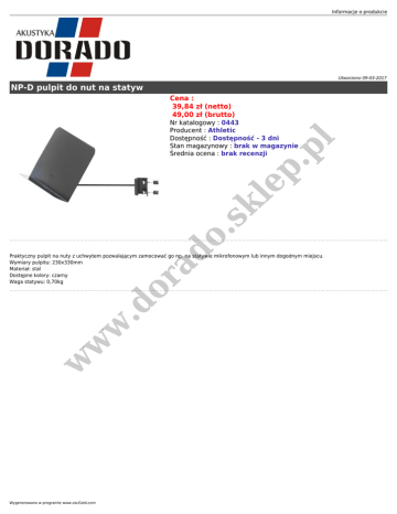 Informacje o produkcie Utworzono 09-03-2017 NP-D pulpit do nut na statyw Cena : 39,84 zł (netto) 49,00 zł (brutto) .d or ad o. sk le p. p l Nr katalogowy : 0443 Producent : Athletic Dostępność : Dostępność - 3 dni Stan magazynowy : brak w magazynie Średnia ocena : brak recenzji w w w Praktyczny pulpit na nuty z uchwytem pozwalającym zamocować go np. na statywie mikrofonowym lub innym dogodnym miejscu. Wymiary pulpitu: 230x330mm Materiał: stal Dostępne kolory: czarny Waga statywu: 0,70kg Wygenerowano w programie www.oscGold.com