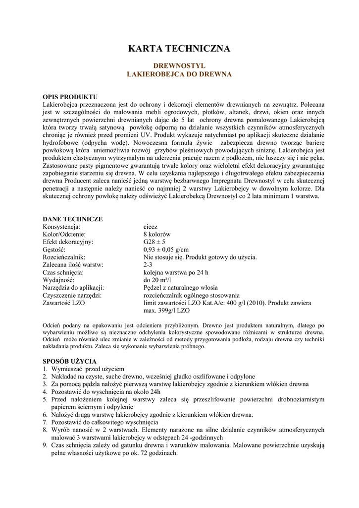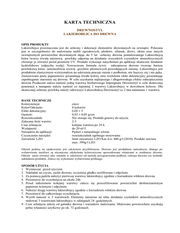 KARTA TECHNICZNA DREWNOSTYL LAKIEROBEJCA DO DREWNA OPIS PRODUKTU Lakierobejca przeznaczona jest do ochrony i dekoracji elementów drewnianych na zewnątrz. Polecana jest w szczególności do malowania mebli ogrodowych, płotków, altanek, drzwi, okien oraz innych zewnętrznych powierzchni drewnianych dając do 5 lat ochrony drewna pomalowanego Lakierobejcą która tworzy trwałą satynową powłokę odporną na działanie wszystkich czynników atmosferycznych chroniąc je również przed promieni UV. Produkt wykazuje natychmiast po aplikacji skuteczne działanie hydrofobowe (odpycha wodę). Nowoczesna formuła żywic zabezpiecza drewno tworząc barierę powłokową która uniemożliwia rozwój grzybów pleśniowych powodujących siniznę. Lakierobejca jest produktem elastycznym wytrzymałym na uderzenia pracuje razem z podłożem, nie łuszczy się i nie pęka. Zastosowane pasty pigmentowe gwarantują trwałe kolory oraz wieloletni efekt dekoracyjny gwarantując zapobieganie starzeniu się drewna. W celu uzyskania najlepszego i długotrwałego efektu zabezpieczenia drewna Producent zaleca nanieść jedną warstwę bezbarwnego Impregnatu Drewnostyl w celu skutecznej penetracji a następnie należy nanieść co najmniej 2 warstwy Lakierobejcy w dowolnym kolorze. Dla skutecznej ochrony powłokę należy odświeżyć Lakierobekcą Drewnostyl co 2 lata minimum 1 warstwa. DANE TECHNICZE Konsystencja: Kolor/Odcienie: Efekt dekoracyjny: Gęstość: Rozcieńczalnik: Zalecana ilość warstw: Czas schnięcia: Wydajność: Narzędzia do aplikacji: Czyszczenie narzędzi: Zawartość LZO ciecz 8 kolorów G28 ± 5 0,93 ± 0,05 g/cm Nie stosuje się. Produkt gotowy do użycia. 2-3 kolejna warstwa po 24 h do 20 m²/l Pędzel z naturalnego włosia rozcieńczalnik ogólnego stosowania limit zawartości LZO Kat.A/e: 400 g/l (2010). Produkt zawiera max. 399g/l LZO Odcień podany na opakowaniu jest odcieniem przybliżonym. Drewno jest produktem naturalnym, dlatego po wybarwieniu możliwe są nieznaczne odchylenia kolorystyczne spowodowane różnicami w strukturze drewna. Odcień może również ulec zmianie w zależności od metody przygotowania podłoża, rodzaju drewna czy techniki nakładania produktu. Zaleca się wykonanie wybarwienia próbnego. SPOSÓB UŻYCIA 1. Wymieszać przed użyciem 2. Nakładać na czyste, suche drewno, wcześniej gładko oszlifowane i odpylone 3. Za pomocą pędzla nałożyć pierwszą warstwę lakierobejcy zgodnie z kierunkiem włókien drewna 4. Pozostawić do wyschnięcia na około 24h 5. Przed nałożeniem kolejnej warstwy zaleca się przeszlifowanie powierzchni drobnoziarnistym papierem ściernym i odpylenie 6. Nałożyć drugą warstwę lakierobejcy zgodnie z kierunkiem włókien drewna. 7. Pozostawić do całkowitego wyschnięcia 8. Wyrób nanosić w 2 warstwach. Elementy narażone na silne działanie czynników atmosferycznych malować 3 warstwami lakierobejcy w odstępach 24 -godzinnych 9. Czas schnięcia zależy od gatunku drewna i warunków malowania. Malowane powierzchnie uzyskują pełne własności użytkowe po ok. 72 godzinach. ZALECENIA 1. W przypadku surowego drewna - starannie przeszlifować drobnoziarnistym papierem ściernym i odpylić 2. W przypadku podłoża poddawanego renowacji – jeśli powłoka jest nieuszkodzona i dobrze przyczepna do podłoża to należy ją oczyścić, zmatowić i odpylić. Jeśli zaś mamy do czynienia ze starą i łuszczącą się powłoką to należy ją usunąć do surowego drewna 3. Nie używać lakierobejcy do lakierowania powierzchni podłogowych, narażonych na ciągły kontakt z wodą oraz powierzchni oliwionych lub impregnowanych woskiem 4. Naniesienie zbyt grubej warstwy spowoduje zanik rysunku słojów drewna i może powodować łuszczenie się powłoki 5. Optymalna temperatura w której należy nanosić lakierobejcę to od +5°C do +30°C OPAKOWANIE Puszka 0,375 l - opakowanie zbiorcze 6 sztuk; Puszka 0,75 l - opakowanie zbiorcze 6 sztuk; Puszka 2,5 l – opakowanie zbiorcze 2 MAGAZYNOWANIE Przechowywać w oryginalnym i szczelnie zamkniętym opakowaniu w temperaturze powyżej +5ºC, w pomieszczeniach zamkniętych, z dala od źródeł ciepła. OKRES PRZYDATNOŚCI 24 miesiące od daty produkcji podanej na opakowaniu OSTRZEŻENIA I ZALECENIA BHP Szczegółowe informacje dotyczące środków ostrożności zawarte są w karcie charakterystyki produktu. Informacje podane w powyższej karcie technicznej nie są specyfikacją ani nie stanowią gwarancji uzyskania właściwości produktów. Informacje te mają jedynie charakter wskazówek.