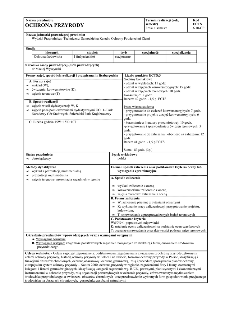 Termin realizacji (rok, semestr) I rok/ 1 semestr Nazwa przedmiotu OCHRONA PRZYRODY Kod ECTS 6.10-OP Nazwa jednostki prowadzącej przedmiot Wydział Przyrodniczo-Techniczny/ Samodzielna Katedra Ochrony Powierzchni Ziemi Studia kierunek Ochrona środowiska stopień I (inżynierskie) tryb stacjonarne specjalność - specjalizacja ----- Nazwisko osoby prowadzącej (osób prowadzących) dr Maciej Wyszyński Formy zajęć, sposób ich realizacji i przypisana im liczba godzin • • • A. Formy zajęć wykład (W), ćwiczenia: konwersatoryjne (K), zajęcia terenowe (T) • • B. Sposób realizacji zajęcia w sali dydaktycznej: W, K zajęcia poza pomieszczeniami dydaktycznymi UO: T- Park Narodowy Gór Stołowych, Śnieżnicki Park Krajobrazowy C. Liczba godzin 15W+15K+10T Status przedmiotu • obowiązkowy Metody dydaktyczne • wykład z prezentacją multimedialną • prezentacja multimedialna • zajęcia terenowe: prezentacja zagadnień w terenie Liczba punktów ECTS:3 Godziny kontaktowe - udział w wykładach: 15 godz. - udział w zajęciach konwersatoryjnych: 15 godz. - udział w zajęciach terenowych: 10 godz. Konsultacje: 2 godz. Razem: 42 godz. - 1,5 p. ECTS Praca własna studenta - przygotowanie do ćwiczeń konwersatoryjnych: 7 godz. - przygotowanie projektu z zajęć konwersatoryjnych: 6 godz. - korzystanie z literatury przedmiotowej: 10 godz. -przygotowanie i sprawozdanie z ćwiczeń terenowych: 5 godz. - przygotowanie do zaliczenia i obecność na zaliczeniu: 12 godz. Razem 41 godz. - 1,5 p.ECTS Suma: 83godz. (3p.) Język wykładowy polski Forma i sposób zaliczenia oraz podstawowe kryteria oceny lub wymagania egzaminacyjne A. Sposób zaliczenia • wykład: zaliczenie z oceną • konwersatorium: zaliczenie z oceną • zajęcia terenowe: zaliczenie z oceną B. Formy zaliczenia • W: zaliczenie pisemne z pytaniami otwartymi • K: wykonanie pracy zaliczeniowej: przygotowanie projektu, kolokwium, • T: sprawozdanie z przeprowadzonych badań terenowych C. Podstawowe kryteria W:50%+1 poprawnych odpowiedzi K: ustalenie oceny zaliczeniowej na podstawie ocen cząstkowych T: ocena ze sprawozdania oraz aktywności podczas zajęć terenowych Określenie przedmiotów wprowadzających wraz z wymogami wstępnymi A. Wymagania formalne: B. Wymagania wstępne: znajomość podstawowych zagadnień związanych ze strukturą i funkcjonowaniem środowiska przyrodniczego Cele przedmiotu: - Celem zajęć jest zapoznanie z: podstawowymi zagadnieniami związanymi z ochroną przyrody, głównymi celami ochrony przyrody, historią ochrony przyrody w Polsce i na świecie, formami ochrony przyrody w Polsce, klasyfikacją i funkcjami obszarów chronionych, ochroną obszarową i ochroną gatunkową, rolą i procedurą sporządzania planów ochrony, europejskim system ochrony przyrody – Natura 2000, ochroną przyrody w regionie, zagrożeniami flory i fauny, czerwonymi księgami i listami gatunków ginących, klasyfikacją kategorii zagrożenia wg. IUCN, prawnymi, planistycznymi i ekonomicznymi instrumentami w ochronie przyrody, rolą organizacji pozarządowych w ochronie przyrody, zrównoważonym użytkowaniem środowiska przyrodniczego, a zwłaszcza obszarów chronionych oraz przedstawienie wybranych form gospodarowania przyjaznego środowisku na obszarach chronionych, gospodarką zasobami naturalnymi Treści programowe A. Problematyka wykładu: Ochrona przyrody w systemie nauk przyrodniczych, zakres i metody badań oraz jej historia na świecie i w Polsce. Przegląd form ochrony przyrody oraz struktury i funkcjonowanie systemów ochrony przyrody w Polsce i na świecie. Park narodowy jako forma ochrony przyrody. Historia, podstawy prawne, możliwości ochrony oraz przegląd wybranych obiektów na przykładzie Polski i świata. Rezerwat przyrody jako forma ochrony przyrody, historia, podstawy prawne, możliwości ochrony oraz przegląd wybranych obiektów na przykładzie Polski i świata. Parki krajobrazowe i obszary chronionego krajobrazu jako forma ochrony przyrody w Polsce, stan, funkcjonowanie, możliwości ochrony oraz przegląd na wybranych przykładach. Pomniki przyrody jako forma ochrony przyrody, historia, podstawy prawne, możliwości ochrony oraz przegląd na przykładzie Polski i świata, Użytki ekologiczne, zespoły przyrodniczo-krajobrazowe oraz stanowiska dokumentacyjne przyrody nieożywionej – stan, funkcjonowanie jako przykład możliwości ochrony przyrody na poziomie lokalnym. B. Problematyka konwersatorium: Ochrona gatunkowa roślin i zwierząt – stan, analiza i funkcjonowanie. Ochrona strefowa wybranych gatunków zwierząt jako przykład wykorzystania gatunku do ochrony ekosystemów, Europejska Siec Ekologiczna Natura 2000 – stan, możliwości, funkcjonowanie oraz perspektywy zrównoważonego funkcjonowania człowieka na obszarach cennych przyrodniczo w dobie integracji europejskiej. Zagrożenia flory i fauny. Czerwone listy i księgi gatunków ginących i zagrożonych. Strategia ochrony zagrożonych i ginących taksonów. Międzynarodowe przepisy i porozumienia jako przykład holistycznego spojrzenia na tematykę funkcjonowania i ochrony przyrody. Prawne, planistyczne, administracyjne i ekonomiczne instrumenty ochrony przyrody. Rola społeczeństwa, pozarządowych organizacji ekologicznych i uspołecznionego zarządzania na obszarach chronionych. Koncepcje ochrony georóżnorodności oraz krajobrazukulturowego jako przykłady holistycznej i nowoczesnej polityki ochrony przyrody. C. Problematyka zajęć terenowych: Zapoznanie się z formami ochrony przyrody w terenie Wykaz literatury A. Literatura wymagana do ostatecznego zaliczenia zajęć (zdania egzaminu): A.1. wykorzystywana podczas zajęć 1. Ochrona przyrody, Symonides E., Wydawnictwa Uniwersytetu Warszawskiego, 2007. 2. Ochrona przyrody, Wiśniewski J., Gwiazdowicz D.J., Wydawnictwo Uniwersytetu Przyrodniczego w Poznaniu, 2009. 3. Obszary chronionej przyrody. Historia, stan obecny, wyzwania przyszłości, Radziejowski 