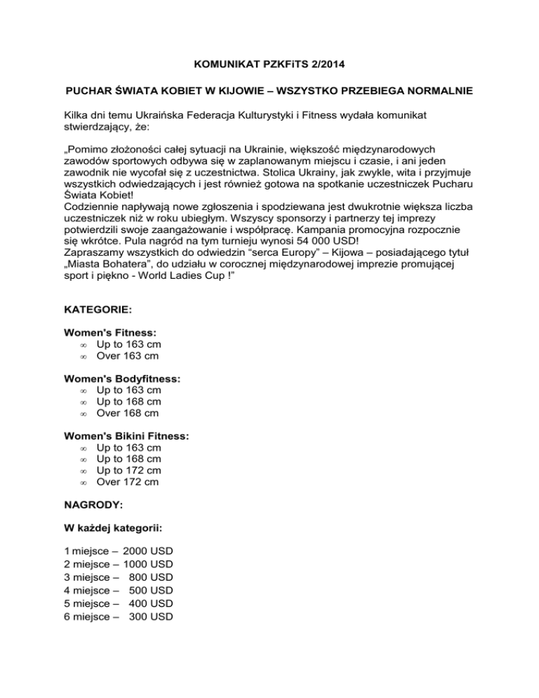 KOMUNIKAT PZKFiTS 2/2014 PUCHAR ŚWIATA KOBIET W KIJOWIE – WSZYSTKO PRZEBIEGA NORMALNIE Kilka dni temu Ukraińska Federacja Kulturystyki i Fitness wydała komunikat stwierdzający, że: „Pomimo złożoności całej sytuacji na Ukrainie, większość międzynarodowych zawodów sportowych odbywa się w zaplanowanym miejscu i czasie, i ani jeden zawodnik nie wycofał się z uczestnictwa. Stolica Ukrainy, jak zwykle, wita i przyjmuje wszystkich odwiedzających i jest również gotowa na spotkanie uczestniczek Pucharu Świata Kobiet! Codziennie napływają nowe zgłoszenia i spodziewana jest dwukrotnie większa liczba uczestniczek niż w roku ubiegłym. Wszyscy sponsorzy i partnerzy tej imprezy potwierdzili swoje zaangażowanie i współpracę. Kampania promocyjna rozpocznie się wkrótce. Pula nagród na tym turnieju wynosi 54 000 USD! Zapraszamy wszystkich do odwiedzin “serca Europy” – Kijowa – posiadającego tytuł „Miasta Bohatera”, do udziału w corocznej międzynarodowej imprezie promującej sport i piękno - World Ladies Cup !” KATEGORIE: Women's Fitness: • Up to 163 cm • Over 163 cm Women's Bodyfitness: • Up to 163 cm • Up to 168 cm • Over 168 cm Women's Bikini Fitness: • Up to 163 cm • Up to 168 cm • Up to 172 cm • Over 172 cm NAGRODY: W każdej kategorii: 1 miejsce – 2 miejsce – 3 miejsce – 4 miejsce – 5 miejsce – 6 miejsce – 2000 USD 1000 USD 800 USD 500 USD 400 USD 300 USD Mistrzynie w kategoriach open (bodyfitness, fitness, bikini fitness) otrzymają dodatkowe 3000 USD! Zawodniczki muszą być zgłoszone przez swoje Federacje Narodowe. Termin nadsyłania zgłoszeń mija30 marca 2014 r. Startowe: 150 EUR, wpłaca się na weryfikacji. Każda zawodniczka musi okazać aktualną i opłaconą na ten rok Licencję Zawodnika IFBB (30 EUR). Zakwaterowanie w hotelu „Bratislava”. Ceny noclegów: - 30 EUR od osoby/dobę (w pokoju 2- osobowym) - 40 EUR od osoby/dobę (w pokoju 1- osobowym) MIEJSCE ZAWODÓW: Zawody zostaną rozegrane w nowym miejscu – obiekcie wystawowym ACCO International – tym samym, w którym odbywały się ubiegłoroczne Mistrzostwa Świata w Fitness: Kiev, ul. Peremohy 40-B. SKRÓCONY PROGRAM Piątek, 11 kwietnia: 18:30 – Narada Techniczna 19:00 – Weryfikacja (Hotel Bratislava) Sobota, 12 kwietnia: 13:00 - Półfinały Niedziela, 13 kwietnia: 14:00 – Oficjalne otwarcie i finały 20:00 – Bankiet pożegnalny Zawodniczki zdecydowane wziąć udział w tej imprezie proszone są o kontakt z biurem PZKFiTS. Udział na koszt własny lub sponsorów. Warszawa, 25.03.2014 r