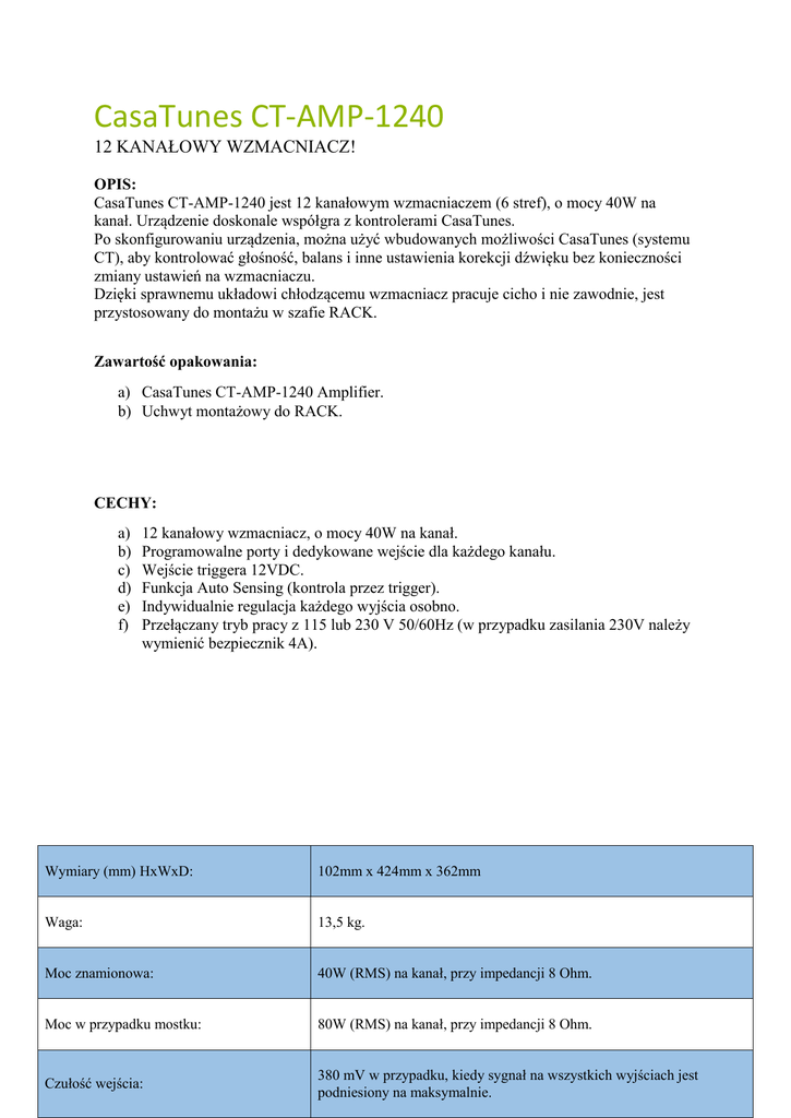 CasaTunes CT-AMP-1240 12 KANAŁOWY WZMACNIACZ! OPIS: CasaTunes CT-AMP-1240 jest 12 kanałowym wzmacniaczem (6 stref), o mocy 40W na kanał. Urządzenie doskonale współgra z kontrolerami CasaTunes. Po skonfigurowaniu urządzenia, można użyć wbudowanych możliwości CasaTunes (systemu CT), aby kontrolować głośność, balans i inne ustawienia korekcji dźwięku bez konieczności zmiany ustawień na wzmacniaczu. Dzięki sprawnemu układowi chłodzącemu wzmacniacz pracuje cicho i nie zawodnie, jest przystosowany do montażu w szafie RACK. Zawartość opakowania: a) CasaTunes CT-AMP-1240 Amplifier. b) Uchwyt montażowy do RACK. CECHY: a) b) c) d) e) f) 12 kanałowy wzmacniacz, o mocy 40W na kanał. Programowalne porty i dedykowane wejście dla każdego kanału. Wejście triggera 12VDC. Funkcja Auto Sensing (kontrola przez trigger). Indywidualnie regulacja każdego wyjścia osobno. Przełączany tryb pracy z 115 lub 230 V 50/60Hz (w przypadku zasilania 230V należy wymienić bezpiecznik 4A). Wymiary (mm) HxWxD: 102mm x 424mm x 362mm Waga: 13,5 kg. Moc znamionowa: 40W (RMS) na kanał, przy impedancji 8 Ohm. Moc w przypadku mostku: 80W (RMS) na kanał, przy impedancji 8 Ohm. Czułość wejścia: 380 mV w przypadku, kiedy sygnał na wszystkich wyjściach jest podniesiony na maksymalnie. Impedancja wejściowa: 18 Ohm. Pasmo przenoszenia: 5 Hz to 72 kHz Całkowite zniekształcenia harmoniczne: 005% THD 20 Hz-20kHz przy 30W (8 Ohm). Całkowite zniekształcenia harmoniczne (mostek): 010% THD 20 Hz-20kHz przy 80W (8 Ohm). Channel crosstalk: 80dB. Stosunek szumu do sygnału: 105 dB (zmierzony). Wydajność: 63%. Wymaganie dotyczące zasilania: 115/230V AC, 50 Hz/60Hz. Pobór prądu w stanie spoczynku: Czułość przełączania: 115V, 0.264 W (zgodny z dyrektywą CE EuP), zgodny z ENERGY STAR. 13.7 mV.