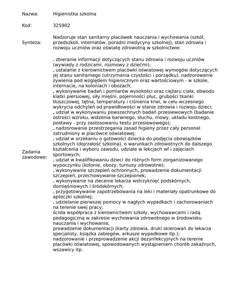 Nazwa: Higienistka szkolna Kod: 325902 Synteza: Nadzoruje stan sanitarny placówek nauczania i wychowania (szkół, przedszkoli, internatów, poradni medycyny szkolnej), stan zdrowia i rozwoju uczniów oraz oświatę zdrowotną w szkolnictwie. Zadania zawodowe: ـzbieranie informacji dotyczących stanu zdrowia i rozwoju uczniów (wywiady z rodzicami, rozmowy z dziećmi); ـustalanie z kierownictwem placówki oświatowej wymogów dotyczących jej stanu sanitarnego (utrzymania czystości i porządku), nadzorowanie żywienia pod względem higienicznym oraz wartościowym - w szkole, internacie, na koloniach i obozach; ـwykonywanie badań i pomiarów wysokości oraz ciężaru ciała, obwodu klatki piersiowej, siły mięśni, pojemności płuc, grubości tkanki tłuszczowej, tętna, temperatury i ciśnienia krwi, w celu wczesnego wykrycia odchyleń od prawidłowości w stanie zdrowia i rozwoju dzieci; ـudział w wykonywaniu powszechnych badań przesiewowych (badanie ostrości wzroku, widzenia barwnego, słuchu, mowy, układu kostnego, postawy - przy zastosowaniu testu przesiewowego); ـnadzorowanie przestrzegania zasad higieny przez cały personel zatrudniony w placówce oświatowej; ـudział w orzekaniu o gotowości dziecka do podjęcia obowiązków szkolnych (dojrzałość szkolna), o warunkach zdrowotnych do dalszego kształcenia i wyboru zawodu, udziale w lekcjach wf i zajęciach sportowych; ـudział w kwalifikowaniu dzieci do różnych form zorganizowanego wypoczynku (kolonie, obozy, turnusy zdrowotne); ـwykonywanie szczepień ochronnych, prowadzenie dokumentacji szczepień, przechowywanie szczepionek; ـwykonywanie na zlecenie lekarza wstrzyknięć podskórnych, domięśniowych i śródskórnych; ـprzygotowywanie zapotrzebowania na leki i materiały opatrunkowe do apteczki szkolnej; ـudzielanie pierwszej pomocy w nagłych wypadkach i zachorowaniach na terenie swej pracy; ścisła współpraca z kierownictwem szkoły, wychowawcami i radą pedagogiczną w zakresie wychowania zdrowotnego w środowisku nauczania i wychowania; prowadzenie dokumentacji (karty zdrowia, druki skierowań do lekarza specjalisty, książka zabiegów, arkusze wypadkowe itp.); nadzorowanie i przeprowadzenie akcji dezynfekcyjnych na terenie placówki oświatowej, spowodowanych wystąpieniem chorób zakaźnych, wszawicy itp.