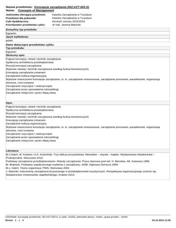 Nazwa przedmiotu: Koncepcje zarządzania (WZ.KZT.003.S) Name: Concepts of Management Jednostka oferująca przedmiot: Przedmiot dla jednostki: Cykl dydaktyczny: Koordynator przedmiotu cyklu: Katedra Zarządzania w Turystyce Katedra Zarządzania w Turystyce Semestr zimowy 2015/2016 dr hab. Jarema Batorski Domyślny typ protokołu: Egzamin Język wykładowy: polski Dane dotyczące przedmiotu cyklu: Typ protokołu: Egzamin Skrócony opis: Pojęcia koncepcji, metod i technik zarządzania Społeczna architektura przedsiębiorstwa Rozwój koncepcji zarządzania Wybrane metody i techniki zarządzania (według funkcji kierowniczych) Koncepcja zarządzania zmianami Zarządzanie kulturą organizacyjną Wybrane nowoczesne koncepcje zarządzania, m. in. zarządzanie renesansowe, zarządzanie procesami, paradoksami, organizacja sieciowa, cool company Zarządzanie zwyczajne i nadzwyczajne Zarządzanie przez opowiadanie (storytelling) Zarządzanie mistyczne i przez ślepą wiarę Opis: Pojęcia koncepcji, metod i technik zarządzania Społeczna architektura przedsiębiorstwa Rozwój koncepcji zarządzania Wybrane metody i techniki zarządzania (według funkcji kierowniczych) Koncepcja zarządzania zmianami Zarządzanie kulturą organizacyjną Wybrane nowoczesne koncepcje zarządzania, m. in. zarządzanie renesansowe, zarządzanie procesami, paradoksami, organizacja sieciowa, cool company Zarządzanie zwyczajne i nadzwyczajne Zarządzanie przez opowiadanie (storytelling) Zarządzanie mistyczne i przez ślepą wiarę Literatura: M.J Hatch, M. Kostera i A.K. Koźmiński, Trzy oblicza przywództwa. Menedżer – artysta – kapłan, Wydawnictwa Akademickie i Profesjonalne, Warszawa 2010. Podstawy zarządzania przedsiębiorstwem. Metody zarządzania. Praca zbiorowa pod red. H. Bienioka, AE, Katowice 1999. M. Bratnicki, Podstawy współczesnego myślenia o zarządzaniu, WSB, Dąbrowa Górnicza 2000. M.J. Hatch, Teoria organizacji, PWN, Warszawa 2002. J. Batorski, Instrumenty zarządzania kryzysowego w przedsiębiorstwie turystycznym. Perspektywa organizacyjnego uczenia się, Wydawnictwo Uniwersytetu Jagiellońskiego, Kraków 2013. USOSweb: Szczegóły przedmiotu: WZ.KZT.003.S, w cyklu: 15/16Z, jednostka dawcy: <brak>, grupa przedm.: <brak> Strona 1 z 3 04.10.2015 12:45 Atrybuty przedmiotu cyklu: Bilans punktów ECTS: Uczestnictwo w wykładach: 15 godzin Uczestnictwo w ćwiczeniach: 15 godzin Udział w egzaminie (włącznie z konsultacjami po egzaminie): 2 godziny Przygotowanie do egzaminu końcowego: 35 godzin Udział w konsultacjach niezbędnych do zaliczenia ćwiczeń: 1 godzina Czytanie literatury dodatkowej i przyswojenie nowej wiedzy: 35 godzin Łączny nakład pracy studenta wynosi 103 godziny, co odpowiada 4 punktom ECTS. Efekty kształcenia: Celem zajęć jest zapoznanie studentów z trendami we współczesnym zarządzaniu, wybranymi koncepcjami, metodami i technikami zarządzania. Celem jest także wyposażenie studentów w umiejętności posługiwania się nowoczesnymi instrumentami zarządzania. Wiedza Student potrafi szczegółowo scharakteryzować wybrane klasyczne i współczesne koncepcje, metody oraz techniki zarządzania. Umiejętności Student potrafi wykorzystać posiadaną wiedzę do rozwiązania przypadku, który wymaga znacznej samodzielności w podejmowaniu decyzji. Kompetencje społeczne Student zna techniki heurystyczne i potrafi się nimi posługiwać w pracy indywidualnej i zespołowej. Forma i warunki zaliczenia: Egzamin pisemny – pytania problemowe. Czas: 45 minut. Warunkiem przystąpienia do egzaminu jest wcześniejsze zaliczenie ćwiczeń (wykonanie ćwiczeń praktycznych, udział w symulacjach i rozwiązanie przypadków). Egzamin uważa się za zaliczony w przypadku odpowiedzi na postawione pytania w co najmniej 60%, co jest równoznaczne z uzyskaniem oceny dostatecznej lub wyższej. Metody dydaktyczne - słownik: Metody podające - wykład informacyjny Metody praktyczne - ćwiczenia przedmiotowe Metody praktyczne - symulacja Metody problemowe - metody aktywizujące - metoda przypadków Metody sprawdzania i kryteria oceny efektów kształcenia uzyskanych przez studentów: Egzamin pisemny, na który składa się pisemna wypowiedź studenta na temat trzech problemów dotyczących koncepcji zarządzania. Egzamin obejmuje materiał z wykładów i lektury obowiązkowej. Udział w symulacjach, wykonanie ćwiczeń praktycznych i stopniowalne rozwiązanie przypadków (w pracy zespołowej) stanowią podstawę zaliczenia ćwiczeń. Metody dydaktyczne: Wykład tradycyjny, analiza przypadków, symulacje, techniki kwestionariuszowe Wymagania wstępne: Znajomość podstaw zarządzania. Przynależność do grup przedmiotów w cyklach: Opis grupy przedmiotów Cykl pocz. Cykl kon. Przedmioty dla programu WZKS-099-25-UD-4 (WZKS-099-25-UD-4) 15/16Z Przedmioty dla programu WZKS-n099-16-UD (WZKS-n099-16-UD-4) 12/13Z Przedmioty dla programu WZKS-n099-16-UD (WZKS-n099-16-UD-4) 13/14Z Przedmioty dla programu WZKS-n099-7-UD-4 (WZKS-n099-7-UD-4) 12/13Z Przedmioty dla programu WZKS-n099-7-UD-4 (WZKS-n099-7-UD-4) 13/14Z Zarządzanie w sporcie, II stopnia, stacjonarne, 1 rok, sem. zimowy, obowiązkowe dla 1 roku (ZS.ST.1Z.OR) 12/13Z 12/13Z zarządzanie w turystyce, II stopnia, stacjonarne,1 rok, sem. zimowy, obowiązkowe dla 1 roku (ZT.ST.1Z.OR) 12/13Z 12/13Z 12/13Z 12/13Z USOSweb: Szczegóły przedmiotu: WZ.KZT.003.S, w cyklu: 15/16Z, jednostka dawcy: <brak>, grupa przedm.: <brak> Strona 2 z 3 04.10.2015 12:45 Punkty przedmiotu w cyklach: <bez przypisanego programu> Typ punktów Punkty ECTS (ECTS) Liczba 4 Cykl pocz. Cykl kon. 12/13Z USOSweb: Szczegóły przedmiotu: WZ.KZT.003.S, w cyklu: 15/16Z, jednostka dawcy: <brak>, grupa przedm.: <brak> Strona 3 z 3 04.10.2015 12:45