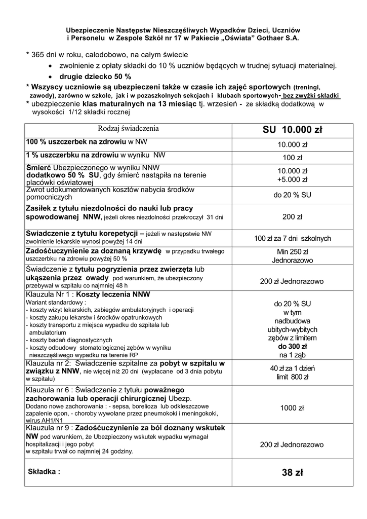 Ubezpieczenie Następstw Nieszczęśliwych Wypadków Dzieci, Uczniów i Personelu w Zespole Szkół nr 17 w Pakiecie „Oświata” Gothaer S.A. * 365 dni w roku, całodobowo, na całym świecie  zwolnienie z opłaty składki do 10 % uczniów będących w trudnej sytuacji materialnej.  drugie dziecko 50 % * Wszyscy uczniowie są ubezpieczeni także w czasie ich zajęć sportowych (treningi, zawody), zarówno w szkole, jak i w pozaszkolnych sekcjach i klubach sportowych - bez zwyżki składki * ubezpieczenie klas maturalnych na 13 miesiąc tj. wrzesień - ze składką dodatkową w wysokości 1/12 składki rocznej Rodzaj świadczenia 100 % uszczerbek na zdrowiu w NW 1 % uszczerbku na zdrowiu w wyniku NW Śmierć Ubezpieczonego w wyniku NNW dodatkowo 50 % SU, gdy śmierć nastąpiła na terenie placówki oświatowej Zwrot udokumentowanych kosztów nabycia środków pomocniczych Zasiłek z tytułu niezdolności do nauki lub pracy spowodowanej NNW, jeżeli okres niezdolności przekroczył 31 dni Świadczenie z tytułu korepetycji – jeżeli w następstwie NW zwolnienie lekarskie wynosi powyżej 14 dni Zadośćuczynienie za doznaną krzywdę w przypadku trwałego uszczerbku na zdrowiu powyżej 50 % Świadczenie z tytułu pogryzienia przez zwierzęta lub ukąszenia przez owady pod warunkiem, że ubezpieczony przebywał w szpitalu co najmniej 48 h SU 10.000 zł 10.000 zł 100 zł 10.000 zł +5.000 zł do 20 % SU 200 zł 100 zł za 7 dni szkolnych Min 250 zł Jednorazowo 200 zł Jednorazowo Klauzula Nr 1 : Koszty leczenia NNW Wariant standardowy : - koszty wizyt lekarskich, zabiegów ambulatoryjnych i operacji - koszty zakupu lekarstw i środków opatrunkowych - koszty transportu z miejsca wypadku do szpitala lub ambulatorium - koszty badań diagnostycznych - koszty odbudowy stomatologicznej zębów w wyniku nieszczęśliwego wypadku na terenie RP Klauzula nr 2: Świadczenie szpitalne za pobyt w szpitalu w związku z NNW, nie więcej niż 20 dni (wypłacane od 3 dnia pobytu w szpitalu) do 20 % SU w tym nadbudowa ubitych-wybitych zębów z limitem do 300 zł na 1 ząb 40 zł za 1 dzień limit 800 zł Klauzula nr 6 : Świadczenie z tytułu poważnego zachorowania lub operacji chirurgicznej Ubezp. Dodano nowe zachorowania : - sepsa, borelioza lub odkleszczowe zapalenie opon, - choroby wywołane przez pneumokoki i meningokoki, wirus AH1/N1 Klauzula nr 9 : Zadośćuczynienie za ból doznany wskutek NW pod warunkiem, że Ubezpieczony wskutek wypadku wymagał hospitalizacji i jego pobyt w szpitalu trwał co najmniej 24 godziny. Składka : 1000 zł 200 zł Jednorazowo 38 zł