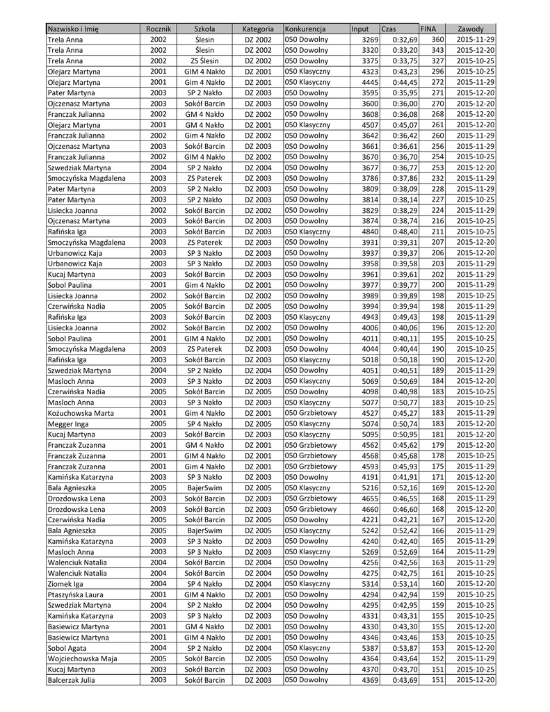 Nazwisko i Imię Trela Anna Trela Anna Trela Anna Olejarz Martyna Olejarz Martyna Pater Martyna Ojczenasz Martyna Franczak Julianna Olejarz Martyna Franczak Julianna Ojczenasz Martyna Franczak Julianna Szwedziak Martyna Smoczyńska Magdalena Pater Martyna Pater Martyna Lisiecka Joanna Ojczenasz Martyna Rafińska Iga Smoczyńska Magdalena Urbanowicz Kaja Urbanowicz Kaja Kucaj Martyna Sobol Paulina Lisiecka Joanna Czerwińska Nadia Rafińska Iga Lisiecka Joanna Sobol Paulina Smoczyńska Magdalena Rafińska Iga Szwedziak Martyna Masloch Anna Czerwińska Nadia Masloch Anna Kożuchowska Marta Megger Inga Kucaj Martyna Franczak Zuzanna Franczak Zuzanna Franczak Zuzanna Kamińska Katarzyna Bala Agnieszka Drozdowska Lena Drozdowska Lena Czerwińska Nadia Bala Agnieszka Kamińska Katarzyna Masloch Anna Walenciuk Natalia Walenciuk Natalia Ziomek Iga Ptaszyńska Laura Szwedziak Martyna Kamińska Katarzyna Basiewicz Martyna Basiewicz Martyna Sobol Agata Wojciechowska Maja Kucaj Martyna Balcerzak Julia Rocznik 2002 2002 2002 2001 2001 2003 2003 2002 2001 2002 2003 2002 2004 2003 2003 2003 2002 2003 2003 2003 2003 2003 2003 2001 2002 2005 2003 2002 2001 2003 2003 2004 2003 2005 2003 2001 2005 2003 2001 2001 2001 2003 2005 2003 2003 2005 2005 2003 2003 2004 2004 2004 2001 2004 2003 2001 2001 2004 2005 2003 2003 Szkoła Ślesin Ślesin ZS Ślesin GIM 4 Nakło Gim 4 Nakło SP 2 Nakło Sokół Barcin GM 4 Nakło GM 4 Nakło Gim 4 Nakło Sokół Barcin GIM 4 Nakło SP 2 Nakło ZS Paterek SP 2 Nakło SP 2 Nakło Sokół Barcin Sokół Barcin Sokół Barcin ZS Paterek SP 3 Nakło SP 3 Nakło Sokół Barcin Gim 4 Nakło Sokół Barcin Sokół Barcin Sokół Barcin Sokół Barcin GIM 4 Nakło ZS Paterek Sokół Barcin SP 2 Nakło SP 3 Nakło Sokół Barcin SP 3 Nakło Gim 4 Nakło SP 4 Nakło Sokół Barcin GM 4 Nakło GIM 4 Nakło Gim 4 Nakło SP 3 Nakło BajerSwim Sokół Barcin Sokół Barcin Sokół Barcin BajerSwim SP 3 Nakło SP 3 Nakło Sokół Barcin Sokół Barcin SP 4 Nakło GIM 4 Nakło SP 2 Nakło SP 3 Nakło GM 4 Nakło GIM 4 Nakło SP 2 Nakło Sokół Barcin Sokół Barcin Sokół Barcin Kategoria DZ 2002 DZ 2002 DZ 2002 DZ 2001 DZ 2001 DZ 2003 DZ 2003 DZ 2002 DZ 2001 DZ 2002 DZ 2003 DZ 2002 DZ 2004 DZ 2003 DZ 2003 DZ 2003 DZ 2002 DZ 2003 DZ 2003 DZ 2003 DZ 2003 DZ 2003 DZ 2003 DZ 2001 DZ 2002 DZ 2005 DZ 2003 DZ 2002 DZ 2001 DZ 2003 DZ 2003 DZ 2004 DZ 2003 DZ 2005 DZ 2003 DZ 2001 DZ 2005 DZ 2003 DZ 2001 DZ 2001 DZ 2001 DZ 2003 DZ 2005 DZ 2003 DZ 2003 DZ 2005 DZ 2005 DZ 2003 DZ 2003 DZ 2004 DZ 2004 DZ 2004 DZ 2001 DZ 2004 DZ 2003 DZ 2001 DZ 2001 DZ 2004 DZ 2005 DZ 2003 DZ 2003 Konkurencja 050 Dowolny 050 Dowolny 050 Dowolny 050 Klasyczny 050 Klasyczny 050 Dowolny 050 Dowolny 050 Dowolny 050 Klasyczny 050 Dowolny 050 Dowolny 050 Dowolny 050 Dowolny 050 Dowolny 050 Dowolny 050 Dowolny 050 Dowolny 050 Dowolny 050 Klasyczny 050 Dowolny 050 Dowolny 050 Dowolny 050 Dowolny 050 Dowolny 050 Dowolny 050 Dowolny 050 Klasyczny 050 Dowolny 050 Dowolny 050 Dowolny 050 Klasyczny 050 Dowolny 050 Klasyczny 050 Dowolny 050 Klasyczny 050 Grzbietowy 050 Klasyczny 050 Klasyczny 050 Grzbietowy 050 Grzbietowy 050 Grzbietowy 050 Dowolny 050 Klasyczny 050 Grzbietowy 050 Grzbietowy 050 Dowolny 050 Klasyczny 050 Dowolny 050 Klasyczny 050 Dowolny 050 Dowolny 050 Klasyczny 050 Dowolny 050 Dowolny 050 Dowolny 050 Dowolny 050 Dowolny 050 Klasyczny 050 Dowolny 050 Dowolny 050 Dowolny Input Czas FINA 360 3269 0:32,69 343 3320 0:33,20 327 3375 0:33,75 296 4323 0:43,23 272 4445 0:44,45 271 3595 0:35,95 270 3600 0:36,00 268 3608 0:36,08 261 4507 0:45,07 260 3642 0:36,42 256 3661 0:36,61 254 3670 0:36,70 253 3677 0:36,77 232 3786 0:37,86 228 3809 0:38,09 227 3814 0:38,14 224 3829 0:38,29 216 3874 0:38,74 211 4840 0:48,40 207 3931 0:39,31 206 3937 0:39,37 203 3958 0:39,58 202 3961 0:39,61 200 3977 0:39,77 198 3989 0:39,89 198 3994 0:39,94 198 4943 0:49,43 196 4006 0:40,06 195 4011 0:40,11 190 4044 0:40,44 190 5018 0:50,18 189 4051 0:40,51 184 5069 0:50,69 183 4098 0:40,98 183 5077 0:50,77 183 4527 0:45,27 183 5074 0:50,74 181 5095 0:50,95 179 4562 0:45,62 178 4568 0:45,68 175 4593 0:45,93 171 4191 0:41,91 169 5216 0:52,16 168 4655 0:46,55 168 4660 0:46,60 167 4221 0:42,21 166 5242 0:52,42 165 4240 0:42,40 164 5269 0:52,69 163 4256 0:42,56 161 4275 0:42,75 160 5314 0:53,14 159 4294 0:42,94 159 4295 0:42,95 155 4331 0:43,31 155 4330 0:43,30 153 4346 0:43,46 153 5387 0:53,87 152 4364 0:43,64 151 4370 0:43,70 151 4369 0:43,69 Zawody 2015-11-29 2015-12-20 2015-10-25 2015-10-25 2015-11-29 2015-12-20 2015-12-20 2015-12-20 2015-12-20 2015-11-29 2015-11-29 2015-10-25 2015-12-20 2015-11-29 2015-11-29 2015-10-25 2015-11-29 2015-10-25 2015-10-25 2015-12-20 2015-12-20 2015-11-29 2015-11-29 2015-11-29 2015-10-25 2015-11-29 2015-11-29 2015-12-20 2015-10-25 2015-10-25 2015-12-20 2015-11-29 2015-12-20 2015-10-25 2015-10-25 2015-11-29 2015-12-20 2015-12-20 2015-12-20 2015-10-25 2015-11-29 2015-12-20 2015-12-20 2015-11-29 2015-12-20 2015-12-20 2015-11-29 2015-11-29 2015-11-29 2015-11-29 2015-10-25 2015-12-20 2015-10-25 2015-10-25 2015-10-25 2015-12-20 2015-10-25 2015-12-20 2015-11-29 2015-10-25 2015-12-20 Bembnista Zuzanna Megger Inga Dróbka Marta Bala Agnieszka Bochat Zofia Dróbka Marta Walenciuk Natalia Ziomek Iga Wojciechowska Maja Loręcka Karolina Balcerzak Julia Wojciechowska Maja Baczyńska Patrycja Schuster Zuzanna Masloch Agnieszka Wróblewska Oliwia Ziomek Iga Belter Agata Marachowska Aleksandra Wróblewska Oliwia Bochat Zofia Rybińska Magda Żarnowska Zuzanna Bembnista Zuzanna Sobol Agata Balcerzak Julia Schuster Zuzanna Schuster Zuzanna Wojtalewicz Sara Masloch Agnieszka Loręcka Karolina Ratajczak Wiktoria Raźna Aleksandra Wegner Maja Rybińska Magda Siewkowska Iga Heck Aleksandra Stefaniuk Dominika Grzegorek Martyna Olszewska Maria Żarnowska Zuzanna Żak Julia Rybińska Magda Stefaniuk Dominika Wegner Maja Gondek Kinga Raźna Aleksandra Sroka Zuzanna Bębnista Natalia Marachowska Aleksandra Wegner Maja Betscher Amelia Kamińska Małg