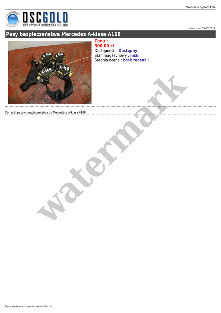 Informacje o produkcie Utworzono 09-03-2017 Pasy bezpieczeństwa Mercedes A-klasa A168 Cena : 300,00 zł er m ar k Dostępność : Dostępny Stan magazynowy : niski Średnia ocena : brak recenzji w at Komplet pasów bezpieczeństwa do Mercedesa A-klasa A168 Wygenerowano w programie www.oscGold.com