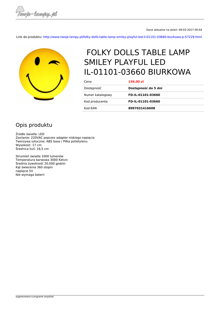 Dane aktualne na dzień: 09-03-2017 00:44 Link do produktu: http://www.twoje-lampy.pl/folky-dolls-table-lamp-smiley-playful-led-il-01101-03660-biurkowa-p-57229.html FOLKY DOLLS TABLE LAMP SMILEY PLAYFUL LED IL-01101-03660 BIURKOWA Cena 139,00 zł Dostępność Dostępność do 5 dni Numer katalogowy FD-IL-01101-03660 Kod producenta FD-IL-01101-03660 Kod EAN 8997031416608 Opis produktu Źródło światła: LED Zasilanie: 220VAC poprzez adapter niskiego napięcia Tworzywa sztuczne: ABS base / Piłka polietylenu Wysokość: 17 cm Średnica kuli: 16,5 cm Strumień światła 1000 lumenów Temperatura barwowa 3000 Kelvin Średnia żywotność 20.000 godzin Kąt świecenia 360 stopni napięcie 5V Nie wymaga baterii wygenerowano w programie shopGold Powered by TCPDF (www.tcpdf.org)