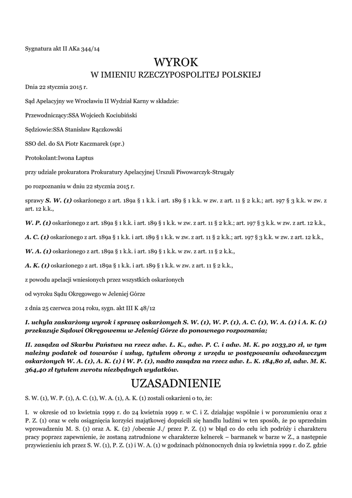 Sygnatura akt II AKa 344/14 WYROK W IMIENIU RZECZYPOSPOLITEJ POLSKIEJ Dnia 22 stycznia 2015 r. Sąd Apelacyjny we Wrocławiu II Wydział Karny w składzie: Przewodniczący:SSA Wojciech Kociubiński Sędziowie:SSA Stanisław Rączkowski SSO del. do SA Piotr Kaczmarek (spr.) Protokolant:Iwona Łaptus przy udziale prokuratora Prokuratury Apelacyjnej Urszuli Piwowarczyk-Strugały po rozpoznaniu w dniu 22 stycznia 2015 r. sprawy S. W. (1) oskarżonego z art. 189a § 1 k.k. i art. 189 § 1 k.k. w zw. z art. 11 § 2 k.k.; art. 197 § 3 k.k. w zw. z art. 12 k.k., W. P. (1) oskarżonego z art. 189a § 1 k.k. i art. 189 § 1 k.k. w zw. z art. 11 § 2 k.k.; art. 197 § 3 k.k. w zw. z art. 12 k.k., A. C. (1) oskarżonego z art. 189a § 1 k.k. i art. 189 § 1 k.k. w zw. z art. 11 § 2 k.k.; art. 197 § 3 k.k. w zw. z art. 12 k.k., W. A. (1) oskarżonego z art. 189a § 1 k.k. i art. 189 § 1 k.k. w zw. z art. 11 § 2 k.k., A. K. (1) oskarżonego z art. 189a § 1 k.k. i art. 189 § 1 k.k. w zw. z art. 11 § 2 k.k., z powodu apelacji wniesionych przez wszystkich oskarżonych od wyroku Sądu Okręgowego w Jeleniej Górze z dnia 25 czerwca 2014 roku, sygn. akt III K 48/12 I. uchyla zaskarżony wyrok i sprawę oskarżonych S. W. (1), W. P. (1), A. C. (1), W. A. (1) i A. K. (1) przekazuje Sądowi Okręgowemu w Jeleniej Górze do ponownego rozpoznania; II. zasądza od Skarbu Państwa na rzecz adw. Ł. K., adw. P. C. i adw. M. K. po 1033,20 zł, w tym należny podatek od towarów i usług, tytułem obrony z urzędu w postępowaniu odwoławczym oskarżonych W. A. (1), A. K. (1) i W. P. (1), nadto zasądza na rzecz adw. Ł. K. 184,80 zł, adw. M. K. 364,40 zł tytułem zwrotu niezbędnych wydatków. UZASADNIENIE S. W. (1), W. P. (1), A. C. (1), W. A. (1), A. K. (1) zostali oskarżeni o to, że: I. w okresie od 10 kwietnia 1999 r. do 24 kwietnia 1999 r. w C. i Z. działając wspólnie i w porozumieniu oraz z P. Z. (1) oraz w celu osiągnięcia korzyści majątkowej dopuścili się handlu ludźmi w ten sposób, że po uprzednim wprowadzeniu M. S. (1) oraz A. K. (2) /obecnie J./ przez P. Z. (1) w błąd co do celu ich podróży i charakteru pracy poprzez zapewnienie, że zostaną zatrudnione w charakterze kelnerek – barmanek w barze w Z., a następnie przywiezieniu ich przez S. W. (1), P. Z. (1) i W. A. (1) w godzinach późnonocnych dnia 19 kwietnia 1999 r. do Z. gdzie P. Z. (1) odebrał od A. C. (1) i W. P. (1) pieniądze w kwocie po 4.000 marek niemieckich za każdą z pokrzywdzonych, a następnie podwiezieniu i zakwaterowaniu pokrzywdzonych w hotelu robotniczym przy ulicy (...), gdzie zostały pozbawione wolności i przekazane pod dozór A. K. (1) skąd po uprzednim uzyskaniu podrobionego wpisu w dowodzie osobistym M. S. (1) o jej zameldowaniu w Z., w dniu 24 kwietnia 1999 r. w G. zostały przekazane nieustalonym osobom narodowości tureckiej w celu uprawiania prostytucji, tj. o czyn z art. 189a § 1 kk i art. 189 § 1 kk w zw. z art. 11 § 2 kk a nadto S. W. (1), W. P. (1) i A. C. (1) o to, że: II. w okresie od 20 kwietnia 1999 r. do 24 kwietnia 1999 r. w Z. działając w warunkach czynu ciągłego z góry powziętym zamiarem oraz wspólnie i w porozumieniu oraz z innymi co najmniej dwoma nieustalonymi mężczyznami w obecności osób trzecich, po uprzednim użyciu przemocy polegającej na przytrzymywaniu rąk M. S. (1) oraz uderzaniu jej po twarzy a także informowaniu jej o charakterze jej przyszłej pracy w domu publicznym wielokrotnie doprowadzili ją do odbycia stosunków płciowych, tj. o czyn z art. 197 § 3 kk w zw. z art. 12 kk III. w okresie od 20 kwietnia 1999 r. do 24 kwietnia 1999 r. w Z. działając w warunkach czynu ciągłego z góry powziętym zamiarem oraz wspólnie i w porozumieniu oraz z innymi co najmniej dwoma nieustalonymi mężczyznami w obecności osób trzecich, po uprzednim użyciu przemocy polegającej na przytrzymywaniu rąk A. K. (2) / obecnie J./ oraz uderzaniu jej po twarzy a także informowaniu jej o charakterze jej przyszłej pracy w domu publicznym wielokrotnie doprowadzili ją do odbycia stosunków płciowych, tj. o czyn z art. 197 § 3 kk w zw. z art. 12 kk. Sąd Okręgowy w Jeleniej Górze z dnia 25 czerwca 2014 r. (sygn.akt III K 48/12) rozstrzygnął następująco: I. uznał S. W. (1), W. P. (1), A. C. (1), W. A. (1) i A. K. (1) za winnych popełnienia czynu opisanego w punkcie I części wstępnej wyroku z tym, że przyjął, że w Z. grożono także pokrzywdzonym pozbawieniem życia osobom im najbliższym, tj. przestępstwa z art. 253 § 1 kk i art. 189 § 1 kk w zw. z art. 11 § 2 kk i za to na podstawie art. 11 § 3 kk i art. 253 § 1 kk wymierzył: - S. W. (1) karę 4 (czterech) lat pozbawienia wolności; - W. P. (1), A. C. (1) i W. A. (1) karę po 3 (trzy) lata pozbawienia wolności; - A. K. (1) przy zastosowaniu art. 60 § 3 i § 6 pkt 1 kk karę 2 (dwóch) lat pozbawienia wolności; II. na podstawie art. 69 § 1 i 2 kk i art. 70 § 1 pkt 1 kk wykonanie kary pozbawienia wolności zawiesił A. K. (1) warunkowo na okres 3 (trzech) lat; III. na podstawie art. 63 § 1 kk na poczet orzeczonej kary pozbawienia wolności zaliczył W. P. (1) okres tymczasowego aresztowania od dnia 21 września 1999 r. do dnia 16 marca 2000 r. IV. uniewinnił S. W. (1), W. P. (1) i A. C. (1) od czynów opisanych w punkcie II i III części wstępnej wyroku; V. zasądził od Skarbu Państwa na rzecz adw. Ł. K., adw. M. K. oraz adw. P. C. koszty pomocy prawnej udzielonej z urzędu w kwocie po 3.600 zł. i dalsze 828 zł. /tytułem podatku VAT/; VI. na podstawie art. 627 kpk i art. 633 kpk zasądził na rzecz Skarbu Państwa od S. W. (1) i A. C. (1) koszty postępowania w części związanej ze sprawą każdego z nich, w tym opłaty po 400 (czterysta) złotych, na podstawie art. 624 § 1 kpk zwolnił w całości W. P. (1), A. K. (1) i W. A. (1) od zapłaty kosztów sądowych. Apelację od tego wyroku wnieśli wszyscy oskarżeni poprzez swoich obrońców. Obrońca oskarżonego S. W. (1) z
