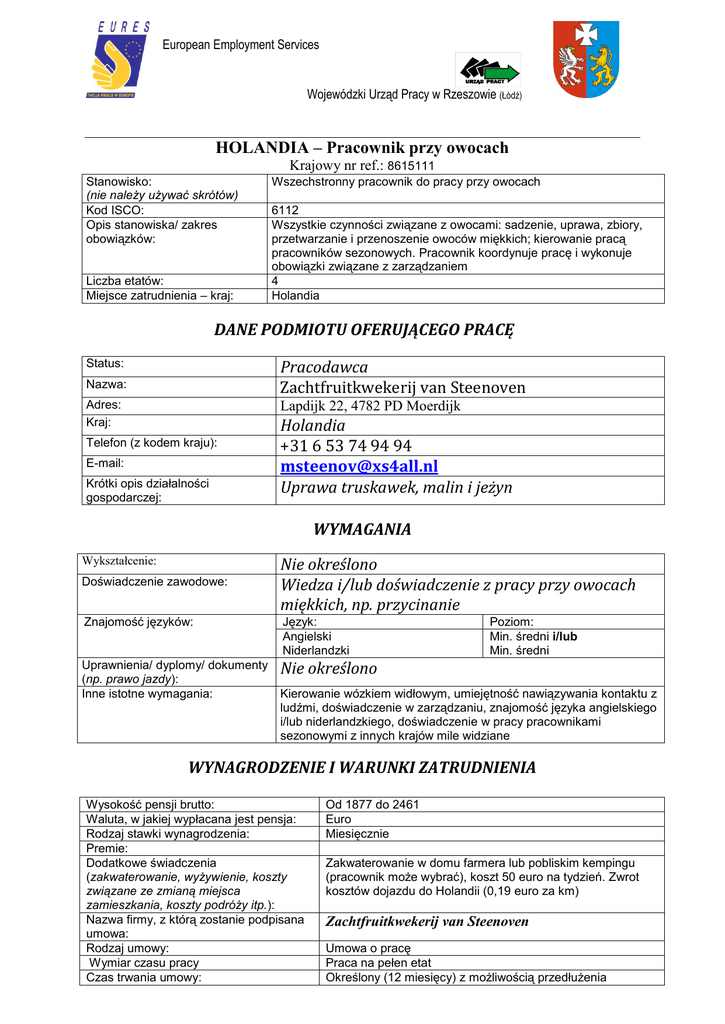 European Employment Services Wojewódzki Urząd Pracy w Rzeszowie (Łódź) HOLANDIA – Pracownik przy owocach Krajowy nr ref.: 8615111 Stanowisko: (nie należy używać skrótów) Kod ISCO: Opis stanowiska/ zakres obowiązków: Liczba etatów: Miejsce zatrudnienia – kraj: Wszechstronny pracownik do pracy przy owocach 6112 Wszystkie czynności związane z owocami: sadzenie, uprawa, zbiory, przetwarzanie i przenoszenie owoców miękkich; kierowanie pracą pracowników sezonowych. Pracownik koordynuje pracę i wykonuje obowiązki związane z zarządzaniem 4 Holandia DANE PODMIOTU OFERUJĄCEGO PRACĘ Pracodawca Zachtfruitkwekerij van Steenoven Status: Nazwa: Adres: Kraj: Lapdijk 22, 4782 PD Moerdijk Telefon (z kodem kraju): E-mail: Krótki opis działalności gospodarczej: Holandia +31 6 53 74 94 94 [email protected] Uprawa truskawek, malin i jeżyn WYMAGANIA Wykształcenie: Doświadczenie zawodowe: Nie określono Wiedza i/lub doświadczenie z pracy przy owocach miękkich, np. przycinanie Znajomość języków: Język: Angielski Niderlandzki Uprawnienia/ dyplomy/ dokumenty (np. prawo jazdy): Inne istotne wymagania: Nie określono Poziom: Min. średni i/lub Min. średni Kierowanie wózkiem widłowym, umiejętność nawiązywania kontaktu z ludźmi, doświadczenie w zarządzaniu, znajomość języka angielskiego i/lub niderlandzkiego, doświadczenie w pracy pracownikami sezonowymi z innych krajów mile widziane WYNAGRODZENIE I WARUNKI ZATRUDNIENIA Wysokość pensji brutto: Waluta, w jakiej wypłacana jest pensja: Rodzaj stawki wynagrodzenia: Premie: Dodatkowe świadczenia (zakwaterowanie, wyżywienie, koszty związane ze zmianą miejsca zamieszkania, koszty podróży itp.): Nazwa firmy, z którą zostanie podpisana umowa: Rodzaj umowy: Wymiar czasu pracy Czas trwania umowy: Od 1877 do 2461 Euro Miesięcznie Zakwaterowanie w domu farmera lub pobliskim kempingu (pracownik może wybrać), koszt 50 euro na tydzień. Zwrot kosztów dojazdu do Holandii (0,19 euro za km) Zachtfruitkwekerij van Steenoven Umowa o pracę Praca na pełen etat Określony (12 miesięcy) z możliwością przedłużenia Liczba godzin tygodniowo: 38 Zmiany i praca w dni wolne: Na prośbę, również soboty, rzadko niedziele Data rozpoczęcia: 01.03.2012 lub 01.04.2012 Inne informacje: Wynagrodzenie zgodne z układem zbiorowym SPOSÓB SKŁADANIA WNIOSKU Wymagane dokumenty (list motywacyjny, CV itp.): Język, w którym muszą być sporządzone przedkładane dokumenty: Do kogo należy wysłać dokumenty: (do pracodawcy/ doradcy EURES) Gdzie należy wysłać dokumenty: Cv i list motywacyjny Dane teleadresowe doradcy EURES lub przedstawiciela pracodawcy: (nazwisko, adres, telefon, fax, e-mail itp.) Doradca EURES w Holandii: [email protected] Angielski Pracodawca Email: [email protected] WAŻNOŚĆ Data publikacji: 22.02.2012 Termin przedkładania podań o pracę / zakończenia ważności oferty: 01.04.2012 Uprzejmie informujemy, że skontaktujemy się wyłącznie z wybranymi kandydatami. UWAGA: 1. Umowa z zagranicznym pracodawcą zostanie zawarta zgodnie z prawem kraju zatrudnienia. Oznacza to, że wszystkie roszczenia odnośnie do warunków, które obejmuje umowa, można kierować wyłącznie do odpowiedniego sądu w kraju zatrudnienia. Publiczne służby zatrudnienia (EURES) nie mogą pośredniczyć ani reprezentować pracownika w sądzie kraju zatrudnienia w przypadku sporu z pracodawcą. 2. Publiczne służby zatrudnienia (EURES) dokładają wszelkich starań, aby zapewnić rzetelność i wiarygodność ofert pracy zgłoszonych w lokalnym urzędzie pracy. Należy wyjaśnić, że oferta pracy została zgłoszona przez stronę trzecią i EURES nie odpowiada za ewentualne rozbieżności między warunkami pracy określonymi w ofercie pracy i warunkami oferowanymi przez potencjalnego pracodawcę. 3. Publiczne służby zatrudnienia (EURES) informują, że będą zbierać, przetwarzać i przekazywać potencjalnym pracodawcom zgodnie z przepisami dotyczącymi ochrony danych osobowych wszystkie dane osobowe dostarczone przez osoby poszukujące pracy.