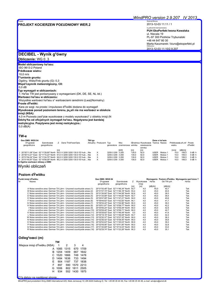 WindPRO version 2.9.207 IV 2013 Projekt: Wydruk/Strona: PROJEKT KOCIERZEW PO£UDNIOWY WER.2 2013-12-03 11:11 / 1 U¿ytkownik licencjonowany: PUH EkoPerfekt Iwona Kowalska ul. Niecala 19 PL-97 300 Piotrków Trybunalski +48 44 647 80 30 Marta Kaczmarek / [email protected] Obliczono: 2013-12-03 11:10/2.9.207 DECIBEL - Wynik g³ówny Obliczenie: WG 0_3 Model obliczeniowy ha³asu: ISO 9613-2 Poland Prêdkoœæ wiatru: 10,0 m/s T³umienie gruntu: Ogólny, WskaŸnik gruntu (G): 0,3 Wspó³czynnik meteorolgiczny, C0: 0,0 dB Typ wymagañ w obliczeniach: 1: Ha³as TW jest porównywany z wymaganiami (DK, DE, SE, NL itd.) Wartoœci ha³asu w obliczeniu: Wszystkie wartoœci ha³asu s¹ wartoœciami œrednimi (Lwa)(Normalny) Proste dŸwiêki: Kara ze wzgl. na proste i impulsowe dŸwiêki dodana do wymagañ Wysokoœæ ponad poziomem terenu, je¿eli nie ma wartoœci w obiekcie imisji (NSA): 4,0 m Pozwala zast¹piæ wysokoœæ z modelu wysokoœci¹ z obiektu imisji (NSA) Odchy³ka od oficjalnych wymagañ ha³asu. Negatywna jest bardziej restrykcyjna. Pozytywna jest mniej restrykcyjna.: 0,0 dB(A) TW-e Geo DMS: WGS 84 D³ugoœæ geograficzna Szerokoœæ geograficzna Z 1 20°00'11,06" East 52°11'28,69" North 2 20°00'13,21" East 52°11'15,23" North 3 20°01'04,24" East 52°11'24,70" North 4 20°01'45,87" East 52°10'58,09" North h) Ogólne wartoœci oktawy z EMD [m] 93,0 91,6 92,8 90,2 TW typ Aktualny Producent Typ Moc Œrednica Wysokoœæ generatora znamionowa wirnika zawieszenia wirnika [kW] [m] [m] X 3200 3200 130.0 !O! hub:... Nie X 3200-3 200 3 200 130,0 92,0 X 3200 3200 130.0 !O! hub:... Nie X 3200-3 200 3 200 130,0 92,0 X 3200 3200 130.0 !O! hub:... Nie X 3200-3 200 3 200 130,0 92,0 X 3200 3200 130.0 !O! hub:... Nie X 3200-3 200 3 200 130,0 92,0 Dane Ÿród³owe/Opis Dane o ha³asie Twórca Nazwa USER USER USER USER Modus 1 Modus 1 Modus 1 Modus 1 PrêdkoœæLwA,ref Proste wiatru dŸwiêki [m/s] [dB(A)] 10,0 106,5 10,0 106,5 10,0 106,5 10,0 106,5 0 dB 0 dB 0 dB 0 dB h h h h Wyniki obliczeñ Poziom dŸwiêku Punkt imisji dŸwiêku Nr Nazwa Geo DMS: WGS 84 D³ugoœæ geograficzna Szerokoœæ geograficzna A B C D E F G H I J K L M N O P Q R 20°01'00,48" East 20°01'07,74" East 20°01'26,80" East 20°01'24,68" East 20°00'47,89" East 19°59'49,62" East 19°59'34,44" East 20°00'01,87" East 20°00'06,24" East 20°00'08,40" East 20°00'28,62" East 20°00'18,16" East 20°02'20,37" East 20°02'26,42" East 20°02'02,63" East 20°02'49,90" East 20°01'20,69" East 20°02'29,74" East 52°11'46,34" North 52°11'46,18" North 52°11'44,58" North 52°11'44,82" North 52°11'47,21" North 52°11'02,82" North 52°11'04,96" North 52°10'58,77" North 52°10'59,49" North 52°10'58,71" North 52°11'46,49" North 52°11'46,08" North 52°10'37,32" North 52°10'38,40" North 52°11'20,03" North 52°10'41,80" North 52°10'14,03" North 52°11'23,26" North Noise sensitive area: German TA Lärm - Unzoned countryside areas (1) Noise sensitive area: German TA Lärm - Unzoned countryside areas (2) Noise sensitive area: German TA Lärm - Unzoned countryside areas (3) Noise sensitive area: German TA Lärm - Unzoned countryside areas (4) Noise sensitive area: German TA Lärm - Unzoned countryside areas (5) Noise sensitive area: German TA Lärm - Unzoned countryside areas (6) Noise sensitive area: German TA Lärm - Unzoned countryside areas (7) Noise sensitive area: German TA Lärm - Unzoned countryside areas (8) Noise sensitive area: German TA Lärm - Unzoned countryside areas (9) Noise sensitive area: German TA Lärm - Unzoned countryside areas (10) Noise sensitive area: German TA Lärm - Unzoned countryside areas (11) Noise sensitive area: German TA Lärm - Unzoned countryside areas (12) Noise sensitive area: German TA Lärm - Unzoned countryside areas (13) Noise sensitive area: German TA Lärm - Unzoned countryside areas (14) Noise sensitive area: German TA Lärm - Unzoned countryside areas (15) Noise sensitive area: German TA Lärm - Unzoned countryside areas (16) Noise sensitive area: German TA Lärm - Unzoned countryside areas (17) Noise sensitive area: German TA Lärm - Unzoned countryside areas (18) Z [m] 93,7 93,4 92,6 92,7 94,0 90,1 90,3 90,0 90,0 90,0 0,0 94,7 90,0 90,0 90,9 90,0 90,0 90,3 Wymagania Poziom dŸwiêku Wymagania spe³nione ? Wysokoœæ Ha³as Od TW-ych Ha³as imisji [m] [dB(A)] [dB(A)] 4,0 45,0 40,7 Tak 4,0 45,0 40,5 Tak 4,0 45,0 39,3 Tak 4,0 45,0 39,4 Tak 4,0 45,0 40,6 Tak 4,0 45,0 41,7 Tak 4,0 45,0 39,3 Tak 4,0 45,0 42,2 Tak 4,0 45,0 42,9 Tak 4,0 45,0 42,7 Tak 4,0 45,0 41,6 Tak 4,0 45,0 42,4 Tak 4,0 45,0 36,3 Tak 4,0 45,0 35,6 Tak 4,0 45,0 39,3 Tak 4,0 45,0 32,8 Tak 4,0 45,0 33,0 Tak 4,0 45,0 35,1 Tak Odleg³oœci (m) Miejsce imisji dŸwiêku (NSA) A B C D E F G H TW 1 1085 1204 1520 1484 904 897 1006 934 2 3 4 1315 670 1709 1409 667 1642 1666 749 1478 1636 733 1494 1187 737 1838 590 1570 2213 802 1811 2505 552 1430 1975 Ci¹g dalszy na nastêpnej stronie... WindPRO jest produktem firmy EMD International A/S, Niels Jernesvej 10, DK-9220 Aalborg O, Tel. +45 96 35 44 44, Fax +45 96 35 44 46, e-mail: [email protected] WindPRO version 2.9.207 IV 2013 Projekt: Wydruk/Strona: PROJEKT KOCIERZEW PO£UDNIOWY WER.2 2013-12-03 11:11 / 2 U¿ytkownik licencjonowany: PUH EkoPerfekt Iwona Kowalska ul. Niecala 19 PL-97 300 Piotrków Trybunalski +48 44 647 80 30 Marta Kaczmarek / [email protected] Obliczono: 2013-12-03 11:10/2.9.207 DECIBEL - Wynik g³ówny Obliczenie: WG 0_3 ...ci¹g dalszy z poprzedniej strony TW Miejsce imisji dŸwiêku (NSA) 1 I 903 J 928 K 643 L 554 M 2924 N 3004 O 2118 P 3347 Q 2504 R 2625 2 504 519 1009 957 2684 2774 2077 3150 2114 2599 3 1349 1314 931 985 2058 2117 1101 2405 2150 1613 4 1893 1817 2072 2125 917 982 749 1316 1408 1140 WindPRO jest produktem firmy EMD International A/S, Niels Jernesvej 10, DK-9220 Aalborg O, Tel. +45 96 35 44 44, Fax +45 96 35 44 46, e-mail: [email protected] WindPRO version 2.9.207 IV 2013 Projekt: Wydruk/Strona: PROJEKT KOCIERZEW PO£UDNIOWY WER.2 2013-12-03 11:11 / 3 U