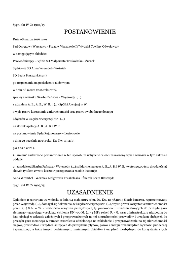 Sygn. akt IV Ca 1907/15 POSTANOWIENIE Dnia 08 marca 2016 roku Sąd Okręgowy Warszawa - Praga w Warszawie IV Wydział Cywilny Odwoławczy w następującym składzie: Przewodniczący - Sędzia SO Małgorzata Truskolaska - Żuczek Sędziowie SO Anna Wrembel - Woźniak SO Beata Błaszczyk (spr.) po rozpoznaniu na posiedzeniu niejawnym w dniu 08 marca 2016 roku w W. sprawy z wniosku Skarbu Państwa - Wojewody (...) z udziałem A. B., A. B., W. B. i (...) Spółki Akcyjnej w W. o wpis prawa korzystania z nieruchomości oraz prawa swobodnego dostępu i dojazdu w księdze wieczystej Kw. (...) na skutek apelacji A. B., A. B. i W. B. na postanowienie Sądu Rejonowego w Legionowie z dnia 23 września 2015 roku, Dz. Kw. 4911/15 p o s t a n a w i a: 1. zmienić zaskarżone postanowienie w ten sposób, że uchylić w całości zaskarżony wpis i wniosek w tym zakresie oddalić; 2. zasądzić od Skarbu Państwa - Wojewody (...) solidarnie na rzecz A. B., A. B. i W. B. kwotę 120,00 (sto dwadzieścia) złotych tytułem zwrotu kosztów postępowania za obie instancje. Anna Wrembel - Woźniak Małgorzata Truskolaska - Żuczek Beata Błaszczyk Sygn. akt IV Ca 1907/15 UZASADNIENIE Żądaniem 2 zawartym we wniosku z dnia 04 maja 2015 roku, Dz. Kw. nr 3842/15 Skarb Państwa, reprezentowany przez Wojewodę (...), domagał się dokonania, w księdze wieczystej Kw. (...), wpisu prawa korzystania z nieruchomości przez (...) S.A. w W. - właściciela urządzeń przesyłowych, tj. przewodów i urządzeń służących do przesyłu gazu ziemnego - gazociągu wysokiego ciśnienia DN 700 M. (...),4 MPa relacji R. - G. wraz z infrastrukturą niezbędną do jego obsługi w zakresie założonych i przeprowadzonych na tej nieruchomości przewodów i urządzeń służących do przesyłu gazu ziemnego w ramach zezwolenia udzielonego na zakładanie i przeprowadzanie na tej nieruchomości ciągów, przewodów i urządzeń służących do przesyłania płynów, gazów i energii oraz urządzeń łączności publicznej i sygnalizacji, a także innych podziemnych, naziemnych obiektów i urządzeń niezbędnych do korzystania z tych przewodów i urządzeń oraz prawa swobodnego dostępu i dojazdu przez służby techniczne właściciela urządzeń przesyłowych do znajdujących się na nieruchomości przewodów i urządzeń służących do przesyłu gazu ziemnego w celu wykonywania prac konserwacyjnych oraz usuwania awarii, dojazdu i kontroli w strefie kontrolowanej o szerokości 12 metrów, której linia środkowa pokrywa się z osią gazociągu wysokiego ciśnienia DN 700 M. (...),4 MPa relacji R. -G., przez czas nieograniczony. Wnioskodawca dołączył załącznik graficzny do dokumentacji dla nieruchomości objętych inwestycją pn. „Budowa gazociągu R. - G. wraz z infrastrukturą niezbędną do jego obsługi na terenie województw (...) i (...)”, obejmujący działkę nr (...), położoną w S. P., gmina N.. We wniosku, jako dokumenty niezbędne do jego rozpoznania, wskazał: upoważnienie nr (...) z dnia 29 października 2014 roku wydane przez Wojewodę (...), decyzję Nr WIŚ.P.TM-7210- (...) Wojewody (...) z dnia 22 grudnia 2010 roku o ustaleniu lokalizacji inwestycji w zakresie terminalu regazyfikacyjnego skroplonego gazu ziemnego w Ś. dla inwestycji „Budowa gazociągu wysokiego ciśnienia DN 700 M. (...),4 MPa relacji R. - G." oraz decyzję Nr (...)pf/bk/ BP-772-2- (...) Ministra Transportu, Budownictwa, (...) Morskiej z dnia 21 września 2012 roku. Dokumenty te nie zostały jednak złożone przy wniosku, Dz. Kw. nr 3842/15. 20 maja 2015 roku referendarz sądowy w Sądzie Rejonowym Legionowie dokonał w księdze wieczystej Kw. (...) wpisu zgodnego z żądaniem wniosku. Orzeczenie zaskarżyli współwłaściciele nieruchomości - A. B., A. B. i W. B., zarzucając, że wpis został dokonany z rażącym naruszeniem Konstytucji Rzeczypospolitej Polskiej, Europejskiej Konwencji o Ochronie Praw Człowieka i Podstawowych Wolności, Kodeksu cywilnego, ustawy z dnia 24 kwietnia 2009 roku o inwestycjach w zakresie terminalu regazyfikacyjnego skroplonego gazu ziemnego w Świnoujściu i ustawy o gospodarce nieruchomościami. Podnosili, że nie wyrazili zgody na ograniczenia w korzystaniu z nieruchomości, nie otrzymali odszkodowania oraz nie wydano decyzji wywłaszczeniowej. Rozpoznając sprawę na skutek złożonej skargi, Sąd Rejonowy postanowił zaskarżony wpis utrzymać w mocy, stwierdzając, że został on dokonany na podstawie ostatecznej decyzji Nr WIŚ.P.TM-7210- (...) z dnia 22 grudnia 2010 r. Wojewody (...), ostatecznej decyzji Ministra Transportu, Budownictwa, (...) Morskiej z dnia 21 września 2012 r., Nr BOII-4pf/Bk/BP-5-772-2- (...) i załącznika graficznego do dokumentacji dla nieruchomości objętych inwestycją pn. „Budowa gazociągu R. - G. wraz z infrastrukturą niezbędną do jego obsługi na terenie województw (...) i (...)”, będących wystarczającymi dokumentami do uwzględnienia wniosku. Sąd wskazał, że ustawodawca wprowadził odrębny tryb administracyjny w sprawie lokalizacji inwestycji w zakresie terminalu regazyfikacyjnego, który służy realizacji celu publicznego, w postaci poprawy bezpieczeństwa energetycznego Polski. Za skutki związane z realizacją tej inwestycji przewidziano rekompensatę w formie odszkodowania. Powołana decyzje - Wojewody (...) oraz Ministra Transportu, Budownictwa i Gospodarki Morskiej, w odniesieniu do skarżących, w sferze prawa własności nieruchomości, wywołały skutki z art. 24 ust. 1 ustawy z dnia 24 kwietnia 2009 roku o inwestycjach w zakresie terminalu regazyfikacyjnego skroplonego gazu ziemnego w Świnoujściu. Uczestnicy postępowania zachowali przysługujące im dotychczas prawo własności, jednakże muszą umożliwić inwestorowi realizację inwestycji (gazociągu), a następnie dostęp do niej w celu konserwacji i naprawy. W tym konkretnym przypadku przysługuje im odszkodowanie, które zgodnie z art. 128 ust. 4 ustawy o gospodarce nieruch