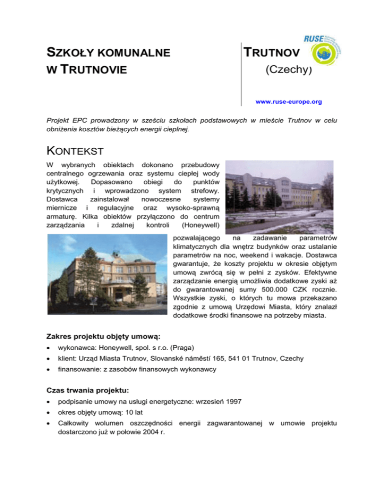 SZKOŁY KOMUNALNE W TRUTNOVIE TRUTNOV (Czechy) www.ruse-europe.org Projekt EPC prowadzony w sześciu szkołach podstawowych w mieście Trutnov w celu obniżenia kosztów bieżących energii cieplnej. KONTEKST W wybranych obiektach dokonano przebudowy centralnego ogrzewania oraz systemu ciepłej wody użytkowej. Dopasowano obiegi do punktów krytycznych i wprowadzono system strefowy. Dostawca zainstalował nowoczesne systemy miernicze i regulacyjne oraz wysoko-sprawną armaturę. Kilka obiektów przyłączono do centrum zarządzania i zdalnej kontroli (Honeywell) pozwalającego na zadawanie parametrów klimatycznych dla wnętrz budynków oraz ustalanie parametrów na noc, weekend i wakacje. Dostawca gwarantuje, że koszty projektu w okresie objętym umową zwrócą się w pełni z zysków. Efektywne zarządzanie energią umożliwia dodatkowe zyski aż do gwarantowanej sumy 500.000 CZK rocznie. Wszystkie zyski, o których tu mowa przekazano zgodnie z umową Urzędowi Miasta, który znalazł dodatkowe środki finansowe na potrzeby miasta. Zakres projektu objęty umową: wykonawca: Honeywell, spol. s r.o. (Praga) klient: Urząd Miasta Trutnov, Slovanské náměstí 165, 541 01 Trutnov, Czechy finansowanie: z zasobów finansowych wykonawcy Czas trwania projektu: podpisanie umowy na usługi energetyczne: wrzesień 1997 okres objęty umową: 10 lat Całkowity wolumen oszczędności energii zagwarantowanej w umowie projektu dostarczono już w połowie 2004 r. Podstawowe informacje o projekcie Budynki sześciu szkół podstawowych powstawały w latach 1911–1962. Większość z nich to budynki wolnostojące, szkoły zwykle mają kuchnię i jadalnię. Całkowita ogrzewana powierzchnia szkoły waha się od 2.290 m2 do 47.000 m2. Ciepło jest dostarczene przez CZT poprzez wymiennikownię ciepła. Wszystkie obiekty są zaopatrzone w obiegi centralnego ogrzewania z wymuszoną cyrkulacją i podwójnym orurowaniem pionowym. Urządzenia do pomiaru zużycia ciepła (ÚV i TUV) znajdują się w piwnicach. Energia – zużycie energii w celach grzewczych przed rozpoczęciem projektu: 25.431 GJ/rok Skala świadczonych usług – przebudowa systemu centralnego ogrzewania, przygotowania do TUV i MaR, – zdalny monitoring i ustawianie żądanych parametrów systemów centralnego ogrzewania, – zarządzanie energią z wykorzystaniem i dalszym przetwarzaniem uzyskanych danych, – serwisowanie zainstalowanego sprzętu w okresie objętym umową, – finansowanie inwestycji. KOSZTY I KORZYŚCI Ekonomiczne inwestycja wykonawcy w działania na rzecz oszczędności energii: 7,7 mln CZK zysk gwarantowany dla Trutnova w okresie 10 lat: 12,5 mln CZK dodatkowe oszczędności (powyżej poziomu gwarantowanego) do 2005 r.: 2,3 mln CZK koszty ogrzewania przed rozpoczęciem projektu: 4,4 mln CZK uzyskane oszczędności: – zmniejszenie kosztów zakupu dostarczanej energii: 28 % finansowanie: – spłata kredytu inwestycyjnego z uzyskanych oszczędności bez konieczności wykorzystania zasobów własnych. OCENA I PERSPEKTYWY ROZWOJU Wykonane działania – dopasowanie systemu dystrybucji wody do celów c.o. oraz zapewnienie strefowej regulacji w poszczególnych elementach obiektu wg punktów krytycznych, – instalacja systemów regulacji centralnego ogrzewania, i ich optymalizacja zgodnie z wymogami poszczególnych szkół, – zapewnienie możliwości punktowej regulacji temperatury przy użyciu zaworów termostatycznych z głowicami termostatycznymi, – optymalizacja przygotowania i obiegów (TUV) dopasowana do eksploatacji obiektów, – system regulacji ciśnienia i hydrauliki centralnego ogrzewania, – centrum zarządzania Honeywell umożliwiające zdalną kontrolę i nadzór, – przeszkolenie personelu obsługi. Przepływy gotówkowe w projekcie EPC BARDZIEJ SZCZEGÓŁOWYCH INFORMACJI UDZIELA imię i nazwisko osoby kontaktowej: Juraj Krivošík stanowisko: kierownik projektu organizacja: SEVEn, Centrum Efektywnego Wykorzystywania Energii adres: Americka 17, 120 00 Praha 2, Czechy tel./fax: +420 – 224 252 115 / +420 – 224 247 597 e-mail: [email protected] Niniejsze studium przypadku zostało przygotowane przez SEVEn, Centrum Efektywnego Wykorzystywania Energii, Czechy, www.svn.cz we współpracy z projektem RUSE współfinansowanym ze środków Komisji Europejskiej w ramach Programu INTERREG IIIC (DG REGIO – “Interreg IIIC West Zone”/Kontrakt RUSE 2W0057N).