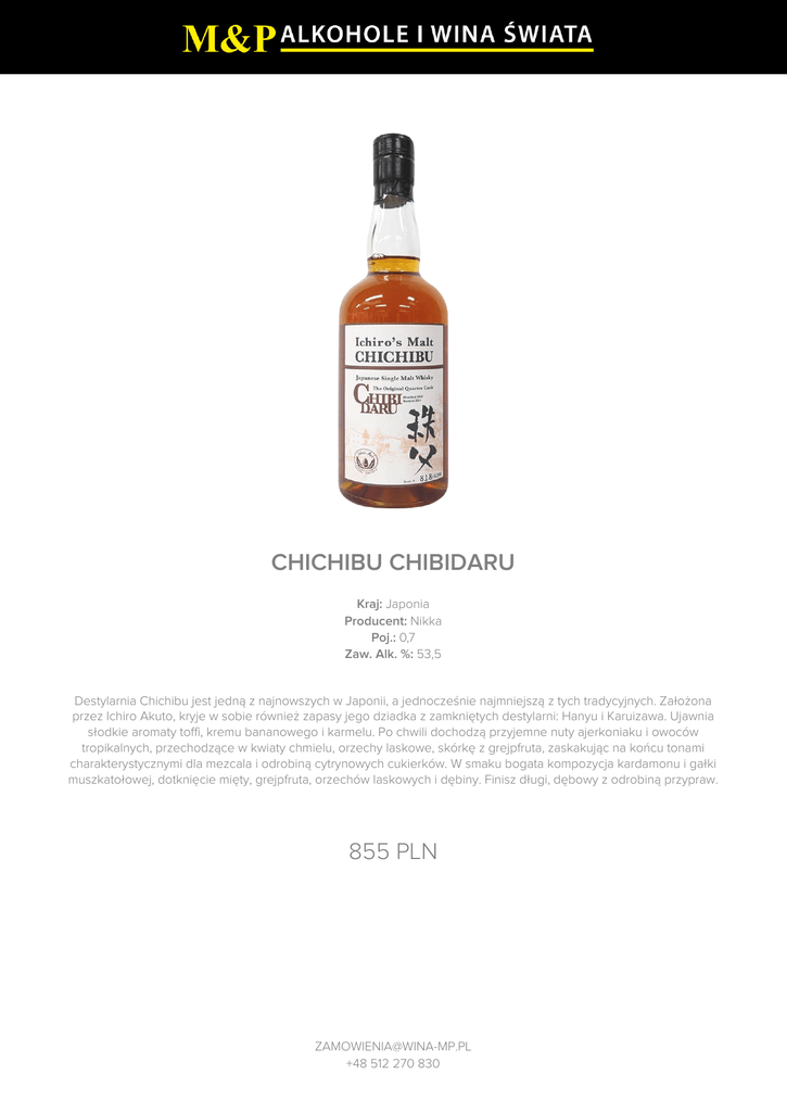 CHICHIBU CHIBIDARU Kraj: Japonia Producent: Nikka Poj.: 0,7 Zaw. Alk. %: 53,5 Destylarnia Chichibu jest jedną z najnowszych w Japonii, a jednocześnie najmniejszą z tych tradycyjnych. Założona przez Ichiro Akuto, kryje w sobie również zapasy jego dziadka z zamkniętych destylarni: Hanyu i Karuizawa. Ujawnia słodkie aromaty toffi, kremu bananowego i karmelu. Po chwili dochodzą przyjemne nuty ajerkoniaku i owoców tropikalnych, przechodzące w kwiaty chmielu, orzechy laskowe, skórkę z grejpfruta, zaskakując na końcu tonami charakterystycznymi dla mezcala i odrobiną cytrynowych cukierków. W smaku bogata kompozycja kardamonu i gałki muszkatołowej, dotknięcie mięty, grejpfruta, orzechów laskowych i dębiny. Finisz długi, dębowy z odrobiną przypraw. 855 PLN [email protected] +48 512 270 830