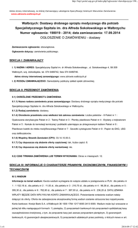 1z6 http://bzp1.portal.uzp.gov.pl/index.php?ogloszenie=show&pozycja=198... Adres strony internetowej, na której Zamawiający udostępnia Specyfikację Istotnych Warunków Zamówienia: www.zdrowie.walbrzych.pl Wałbrzych: Dostawy drobnego sprzętu medycznego dla potrzeb Specjalistycznego Szpitala im. dra Alfreda Sokołowskiego w Wałbrzychu Numer ogłoszenia: 198019 - 2014; data zamieszczenia: 17.09.2014 OGŁOSZENIE O ZAMÓWIENIU - dostawy Zamieszczanie ogłoszenia: obowiązkowe. Ogłoszenie dotyczy: zamówienia publicznego. SEKCJA I: ZAMAWIAJĄCY I. 1) NAZWA I ADRES: Specjalistyczny Szpital im. dr Alfreda Sokołowskiego , ul. Sokołowskiego 4, 58-309 Wałbrzych, woj. dolnośląskie, tel. 074 6489742, faks 074 6489746. Adres strony internetowej zamawiającego: www.zdrowie.walbrzych.pl I. 2) RODZAJ ZAMAWIAJĄCEGO: Samodzielny publiczny zakład opieki zdrowotnej. SEKCJA II: PRZEDMIOT ZAMÓWIENIA II.1) OKREŚLENIE PRZEDMIOTU ZAMÓWIENIA II.1.1) Nazwa nadana zamówieniu przez zamawiającego: Dostawy drobnego sprzętu medycznego dla potrzeb Specjalistycznego Szpitala im. dra Alfreda Sokołowskiego w Wałbrzychu. II.1.2) Rodzaj zamówienia: dostawy. II.1.4) Określenie przedmiotu oraz wielkości lub zakresu zamówienia: Liczba pakietów - 8 Pakiet nr 1 : Opakowania sterylizacyjne Pakiet nr 2 : Taśmy Pakiet nr 3 : Plomby plastikowe Pakiet nr 4 : Etykiety z indykatorem Pakiet nr 5 : Kaniule do termolezji termicznej i podkładki uziemiające ze zintegrowanym kablem Pakiet nr 6 : Plastikowe butelki do mleka modyfikowanego Pakiet nr 7 : Szczotki cytologiczne Pakiet nr 8 : Papier do EKG, USG oraz defibrylatorów. II.1.6) Wspólny Słownik Zamówień (CPV): 33.14.10.00-3. II.1.7) Czy dopuszcza się złoŜenie oferty częściowej: tak, liczba części: 8. II.1.8) Czy dopuszcza się złoŜenie oferty wariantowej: nie. II.2) CZAS TRWANIA ZAMÓWIENIA LUB TERMIN WYKONANIA: Okres w miesiącach: 12. SEKCJA III: INFORMACJE O CHARAKTERZE PRAWNYM, EKONOMICZNYM, FINANSOWYM I TECHNICZNYM III.1) WADIUM Informacja na temat wadium: Kwota wadium wymagana do wzięcia udziału w postępowaniu w PLN : dla pakietu nr 1 : 1 152,18 zł., dla pakietu nr 2 : 11,05 zł., dla pakietu nr 3 : 210,70 zł., dla pakietu nr 4 : 98,38 zł., dla pakietu nr 5 : 395,30 zł., dla pakietu nr 6 : 782,60 zł., dla pakietu nr 7 : 387,00 zł., dla pakietu nr 8 : 236,20 zł. DATĄ UZNANIA WPŁATY BĘDZIE DATA WPŁYWU NA KONTO ZAMAWIAJĄCEGO. Potwierdzenie wniesienia wadium naleŜy dołączyć do oferty. Oferta nie zabezpieczona akceptowalną formą wadium zostanie odrzucona bez rozpatrywania. Konto bankowe: Kredyt Bank S.A. o/Wałbrzych 36 1500 1764 1217 6005 2413 0000. Wadium moŜe być wnoszone w jednej lub kilku następujących formach: 1) pieniądzu, 2) poręczeniach bankowych lub poręczeniach spółdzielczej kasy oszczędnościowo-kredytowej, z tym, Ŝe poręczenie kasy jest zawsze poręczeniem pienięŜnym, 3) gwarancjach bankowych, 4) gwarancjach ubezpieczeniowych, 5) poręczeniach udzielanych przez podmioty, o których mowa w art. 2014-09-17 12:42 2z6 http://bzp1.portal.uzp.gov.pl/index.php?ogloszenie=show&pozycja=198... 6b ust. 5 pkt 2 ustawy z dnia 9 listopada 2000 r. o utworzeniu Polskiej Agencji Rozwoju Przedsiębiorczości (tekst jednolity: Dz. U. z 2007 r. Nr 42, poz. 275). Gwarancja ubezpieczeniowa lub gwarancja bankowa złoŜona, jako zabezpieczenie wadium musi posiadać okres waŜności nie krótszy niŜ okres związania ofertą. Informacje dodatkowe: 1) wadium wnosi się przed upływem terminu składania ofert. W przypadku wnoszenia wadium w formie pienięŜnej za termin wniesienia wadium przyjmuje się datę uznania rachunku bankowego Zamawiającego, 2) w przypadku wnoszenia wadium w innej formie, kopię dokumentu naleŜy dołączyć do oferty, a oryginał złoŜyć w siedzibie Zamawiającego - Dział Zamówień Publicznych i Zaopatrzenia, 3) wadium będzie zwrócone w terminie i na warunkach wskazanych w art. 46 Pzp, 4) Zamawiający zatrzyma wadium w przypadkach określonych w art. 46 ust. 4a i 5 Pzp. 5) Wadium wniesione na podstawie art. 45 ust. 6 ustawy pzp w innej formie niŜ pieniądzu, winno zawierać, niebudzące wątpliwości interpretacyjnych zapisy dotyczące wypłaty i zatrzymania wadium przez Zamawiającego. W szczególności dotyczy to przesłanek zawartych w art. 46 ust. 4a i 5 ustawy pzp, poprzez wyszczególnienie w zapisach wszystkich przypadków umoŜliwiających zatrzymanie Zamawiającemu wadium i jego bezwarunkowej wypłaty, po spełnieniu któregokolwiek z warunków określonych w art. 46 ust. 4a i 5 ustawy pzp. III.2) ZALICZKI III.3) WARUNKI UDZIAŁU W POSTĘPOWANIU ORAZ OPIS SPOSOBU DOKONYWANIA OCENY SPEŁNIANIA TYCH WARUNKÓW III. 3.1) Uprawnienia do wykonywania określonej działalności lub czynności, jeŜeli przepisy prawa nakładają obowiązek ich posiadania Opis sposobu dokonywania oceny spełniania tego warunku na podstawie załączonego do oferty przetargowej oświadczenia oraz wymaganych dokumentów tj. 1) posiadanie aktualnego odpisu z właściwego rejestru - na podstawie załączonego aktualnego odpisu z właściwego rejestru lub z centralnej ewidencji i informacji o działalności gospodarczej, jeŜeli odrębne przepisy wymagają wpisu do rejestru lub ewidencji, w celu wykazania braku podstaw do wykluczenia w oparciu o art. 24 ust. 1 pkt. 2 ustawy, wystawionego nie wcześniej niŜ 6 miesięcy przed upływem terminu składania ofert ; 2) posiadanie aktualnego zaświadczenia własciwego naczelnika urzędu skarbowego potwierdzającego Ŝe Wykonawca nie zalega z uiszczaniem podatków - na podstawie aktualnego zaświadczenia właściwego naczelnika urzędu skarbowego potwierdzającego Ŝe Wykonawca nie zalega z opłacaniem podatków, lub zaświadczenia, Ŝe uzyskał przewidziane prawem zwolnienie, odroczenie lub rozłoŜenie na raty zaległych płatności lub wstrzymanie w całości wykonania decyzji właściwego organu wystawionego nie wcześniej niŜ 3 miesiące przed upływem terminu skł