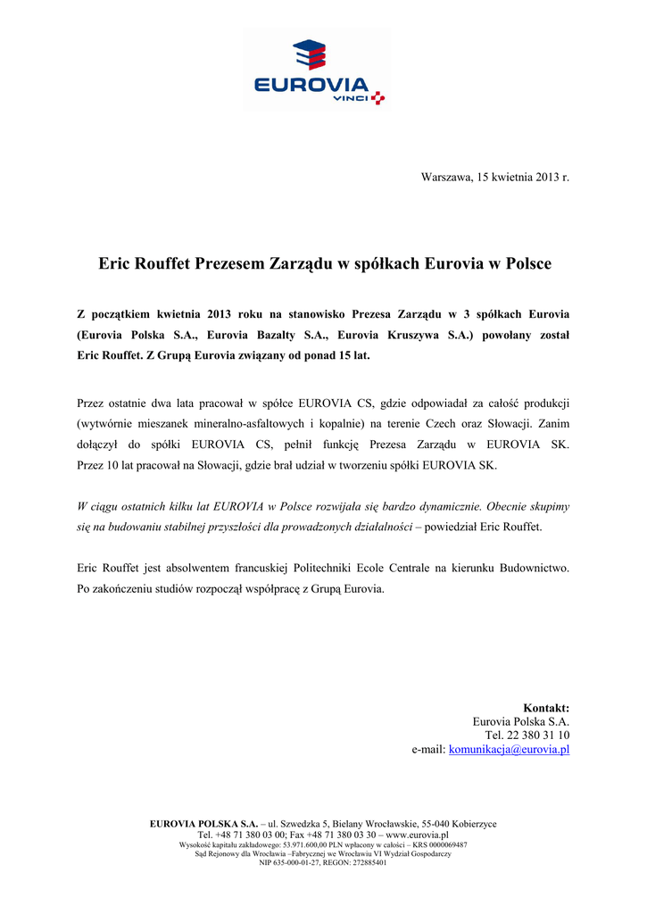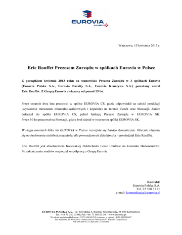 Warszawa, 15 kwietnia 2013 r. Eric Rouffet Prezesem Zarządu w spółkach Eurovia w Polsce Z początkiem kwietnia 2013 roku na stanowisko Prezesa Zarządu w 3 spółkach Eurovia (Eurovia Polska S.A., Eurovia Bazalty S.A., Eurovia Kruszywa S.A.) powołany został Eric Rouffet. Z Grupą Eurovia związany od ponad 15 lat. Przez ostatnie dwa lata pracował w spółce EUROVIA CS, gdzie odpowiadał za całość produkcji (wytwórnie mieszanek mineralno-asfaltowych i kopalnie) na terenie Czech oraz Słowacji. Zanim dołączył do spółki EUROVIA CS, pełnił funkcję Prezesa Zarządu w EUROVIA SK. Przez 10 lat pracował na Słowacji, gdzie brał udział w tworzeniu spółki EUROVIA SK. W ciągu ostatnich kilku lat EUROVIA w Polsce rozwijała się bardzo dynamicznie. Obecnie skupimy się na budowaniu stabilnej przyszłości dla prowadzonych działalności – powiedział Eric Rouffet. Eric Rouffet jest absolwentem francuskiej Politechniki Ecole Centrale na kierunku Budownictwo. Po zakończeniu studiów rozpoczął współpracę z Grupą Eurovia. Kontakt: Eurovia Polska S.A. Tel. 22 380 31 10 e-mail: [email protected] EUROVIA POLSKA S.A. – ul. Szwedzka 5, Bielany Wrocławskie, 55-040 Kobierzyce Tel. +48 71 380 03 00; Fax +48 71 380 03 30 – www.eurovia.pl Wysokość kapitału zakładowego: 53.971.600,00 PLN wpłacony w całości – KRS 0000069487 Sąd Rejonowy dla Wrocławia –Fabrycznej we Wrocławiu VI Wydział Gospodarczy NIP 635-000-01-27, REGON: 272885401