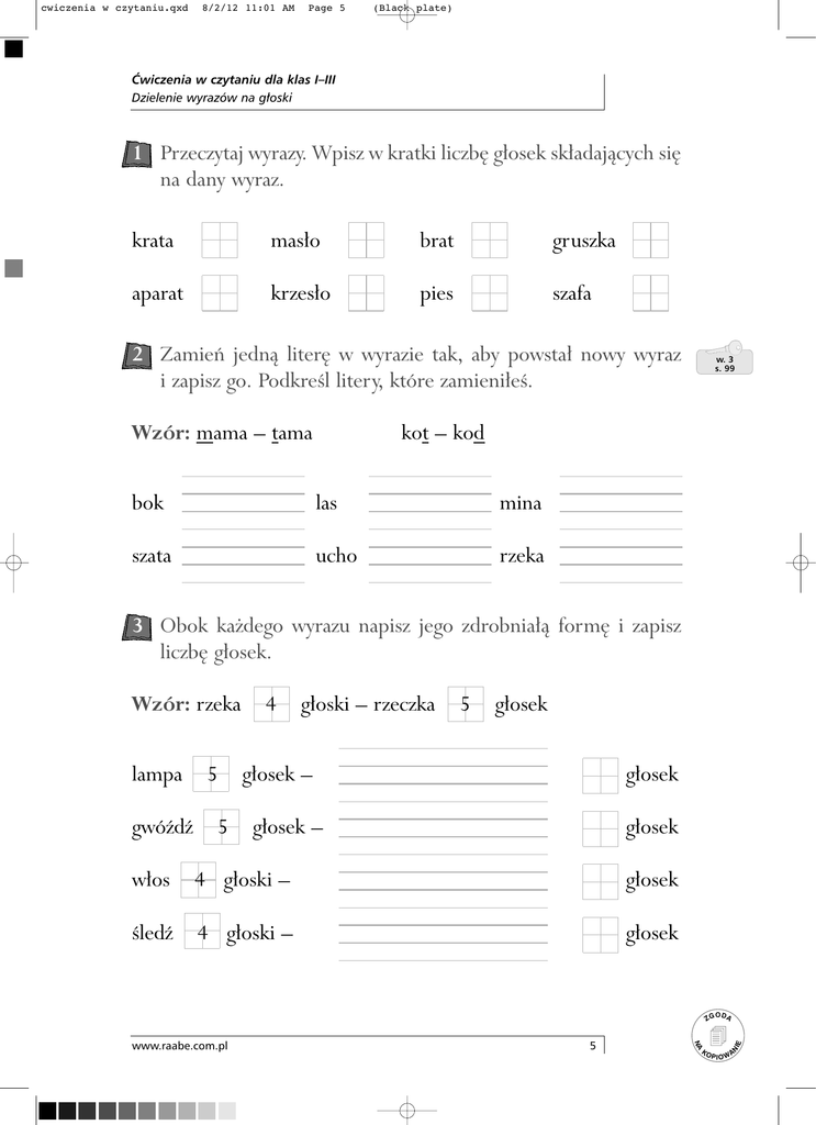cwiczenia w czytaniu.qxd 8/2/12 11:01 AM Page 5 (Black plate) åwiczenia w czytaniu dla klas I–III Dzielenie wyrazów na g∏oski 1 Przeczytaj wyrazy. Wpisz w kratki liczb´ g∏osek sk∏adajàcych si´ na dany wyraz. krata mas∏o brat gruszka aparat krzes∏o pies szafa 2 Zamieƒ jednà liter´ w wyrazie tak, aby powsta∏ nowy wyraz i zapisz go. PodkreÊl litery, które zamieni∏eÊ. Wzór: mama – tama w. 3 s. 99 kot – kod bok las mina szata ucho rzeka 3 Obok ka˝dego wyrazu napisz jego zdrobnia∏à form´ i zapisz liczb´ g∏osek. lampa gwóêdê 5 5 4 g∏oski – rzeczka 5 g∏osek g∏osek – g∏osek g∏osek – g∏osek w∏os 4 g∏oski – g∏osek Êledê 4 g∏oski – g∏osek 5 NA www.raabe.com.pl KO ODA E ZG NI Wzór: rzeka PIO WA cwiczenia w czytaniu.qxd 8/2/12 11:01 AM Page 11 (Black plate) åwiczenia w czytaniu dla klas I–III Dzielenie wyrazów na sylaby 1 Obejrzyj ilustracje i uzupe∏nij podpisy brakujàcymi sylabami. Utwórz zdanie z dopisanych sylab i starannie je napisz. ∏o-............... cie-............... so-............... ba-..........-ny ko-............... ma-li-............... w∏o-............... cze-ko-..........-da ry-............... w. 4 s. 99 2 Przeczytaj zdania i spróbuj podzieliç, pionowymi kreskami, wyrazy na sylaby. Mama kupi∏a kolorowà tasiemk´. To m e k n a r y s o w a ∏ d u ˝ à l o k o m o t y w ´ . KO NI 11 NA www.raabe.com.pl ODA E ZG PIO WA cwiczenia w czytaniu.qxd 8/2/12 11:02 AM Page 20 (Black plate) åwiczenia w czytaniu dla klas I–III ¸àczenie sylab w wyrazy 1 Obejrzyj ilustracje i po∏àcz, zgodnie ze wzorem, ostatnie sylaby nazw obrazków ze wskazanymi sylabami. Napisz nowe wyrazy. sen = ba-sen ran = ga˝ = lon = ton = wó∏ = da = wa-da ta = za = ga = gon = zon = 2 Obejrzyj ilustracje i po∏àcz, zgodnie ze wzorem, drugie sylaby nazw obrazków ze wskazanymi sylabami. Napisz nowe wyrazy. NI NA KO sa = ma = fa = na = ta = wan˝ = re-wanż kin = bus = ga∏ = mont = mis = ODA E ZG da = ra-da PIO WA 20 www.raabe.com.pl cwiczenia w czytaniu.qxd 8/2/12 11:02 AM Page 28 (Black plate) åwiczenia w czytaniu dla klas I–III ¸àczenie sylab w wyrazy ¸àczenie sylab w wyrazy 1 Obejrzyj ilustracje. Z sylab u∏ó˝ nazwy zwierzàt widocznych na obrazkach. Zapisz te nazwy w okienkach. Pokoloruj obrazki. w. 15 s. 100 czek NI NA KO kró ka wie wiór wia dek niedê dron ka bie ty sek gry czusz ka ka ODA E ZG li PIO WA 28 www.raabe.com.pl