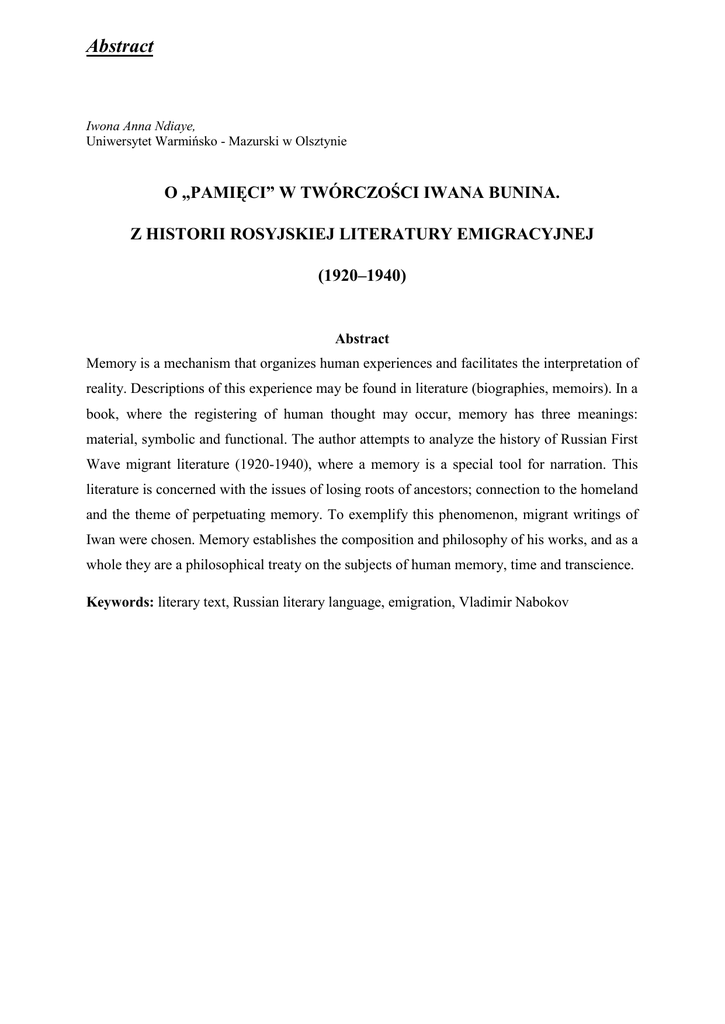 Abstract Iwona Anna Ndiaye, Uniwersytet Warmińsko - Mazurski w Olsztynie O „PAMIĘCI” W TWÓRCZOŚCI IWANA BUNINA. Z HISTORII ROSYJSKIEJ LITERATURY EMIGRACYJNEJ (1920–1940) Abstract Memory is a mechanism that organizes human experiences and facilitates the interpretation of reality. Descriptions of this experience may be found in literature (biographies, memoirs). In a book, where the registering of human thought may occur, memory has three meanings: material, symbolic and functional. The author attempts to analyze the history of Russian First Wave migrant literature (1920-1940), where a memory is a special tool for narration. This literature is concerned with the issues of losing roots of ancestors; connection to the homeland and the theme of perpetuating memory. To exemplify this phenomenon, migrant writings of Iwan were chosen. Memory establishes the composition and philosophy of his works, and as a whole they are a philosophical treaty on the subjects of human memory, time and transcience. Keywords: literary text, Russian literary language, emigration, Vladimir Nabokov