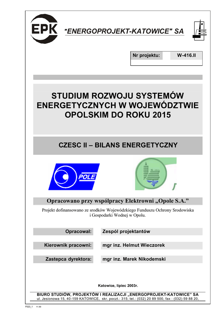 "ENERGOPROJEKT-KATOWICE" SA Nr projektu: W-416.II STUDIUM ROZWOJU SYSTEMÓW ENERGETYCZNYCH W WOJEWÓDZTWIE OPOLSKIM DO ROKU 2015 CZESC II – BILANS ENERGETYCZNY Opracowano przy wspólpracy Elektrowni „Opole S.A.” Projekt dofinansowano ze srodków Wojewódzkiego Funduszu Ochrony Srodowiska i Gospodarki Wodnej w Opolu. Opracowal: Zespól projektantów Kierownik pracowni: mgr inz. Helmut Wieczorek Zastepca dyrektora: mgr inz. Marek Nikodemski Katowice, lipiec 2003r. BIURO STUDIÓW, PROJEKTÓW I REALIZACJI „ENERGOPROJEKT-KATOWICE” SA ul. Jesionowa 15, 40 -159 KATOWICE, skr. poczt.: 315; tel.: (032) 20 89 500, fax : (032) 59 88 20, F023_1 11.99 Nr projektu: "ENERGOPROJEKT-KATOWICE" SA W-416.II 2/ Czesc II ZESPÓL PROJEKTANTÓW BIURO STUDIÓW, PROJEKTÓW I REALIZACJI „ENERGOPROJEKT-KATOWICE” SA Projektanci: Krzysztof Ren Jolanta Kopacz Cezary Orlowski Robert Krawczyk Waldemar Nikodem Energetyka Cieplna Opolszczyzny S.A. (w zakresie systemów cieplowniczych) Projektanci: Jaroslaw Kamionka Monika Kowalczyk Mariusz Tanczuk Biuro Studiów i Projektów Energetycznych „Energoprojekt – Kraków” S.A. (w zakresie systemu elektroenergetycznego) Projektanci: Jan Sawicki Pawel Kurbiel PGNiG, Górnoslaska Spólka Gazownictwa Sp. z o.o. Oddzial Zaklad Gazowniczy Opole (w zakresie systemu gazowniczego) Projektanci: Izabela Banasiewicz Romana Liszka F024 Nr projektu: "ENERGOPROJEKT-KATOWICE" SA W-416.II Czesc II SPIS ZAWARTOSCI Zespól projektantów Spis zawartosci Opis F025 3/ Nr projektu: "ENERGOPROJEKT-KATOWICE" SA W-416.II Czesc II SPIS TRESCI OPRACOWANIA 01 Wiadomosci ogólne 02 Systemy cieplownicze 03 System elektroenergetyczny 04 System gazowniczy 05 Zródla ciepla na terenie województwa opolskiego F025 4/ Nr projektu: W-416.II "ENERGOPROJEKT-KATOWICE" SA Czesc II SPIS MAP 1. Systemy energetyczne F026 nr rys. C1-20721 5/ Nr projektu: "ENERGOPROJEKT-KATOWICE" SA MAPA W-303.1