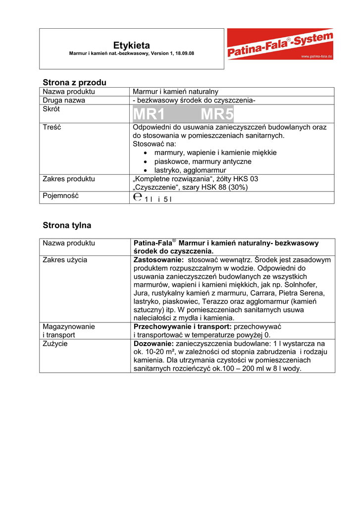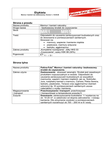 Etykieta Marmur i kamień nat.-bezkwasowy, Version 1, 18.09.08 Strona z przodu Nazwa produktu Druga nazwa Skrót Marmur i kamień naturalny - bezkwasowy środek do czyszczenia- Treść Odpowiedni do usuwania zanieczyszczeń budowlanych oraz do stosowania w pomieszczeniach sanitarnych. Stosować na: marmury, wapienie i kamienie miękkie piaskowce, marmury antyczne lastryko, agglomarmur „Kompletne rozwiązania“, żółty HKS 03 „Czyszczenie“, szary HSK 88 (30%) Zakres produktu Pojemność MR1 MR5 1l i 5l Strona tylna Nazwa produktu Zakres użycia Magazynowanie i transport Zużycie Patina-Fala® Marmur i kamień naturalny- bezkwasowy środek do czyszczenia. Zastosowanie: stosować wewnątrz. Środek jest zasadowym produktem rozpuszczalnym w wodzie. Odpowiedni do usuwania zanieczyszczeń budowlanych ze wszystkich marmurów, wapieni i kamieni miękkich, jak np. Solnhofer, Jura, rustykalny kamień z marmuru, Carrara, Pietra Serena, lastryko, piaskowiec, Terazzo oraz agglomarmur (kamień sztuczny) itp. W pomieszczeniach sanitarnych usuwa naleciałości z mydła i kamienia. Przechowywanie i transport: przechowywać i transportować w temperaturze powyżej 0. Dozowanie: zanieczyszczenia budowlane: 1 l wystarcza na ok. 10-20 m², w zależności od stopnia zabrudzenia i rodzaju kamienia. Dla utrzymania czystości w pomieszczeniach sanitarnych rozcieńczyć ok.100 – 200 ml w 8 l wody. Etykieta Marmur i kamień nat.-bezkwasowy, Version 1, 18.09.08 Instrukcja użycia Dodatkowa wskazówka Składniki Wskazówka Symbol / oznakowanie substancji niebezpiecznej Adres Numer art. Numer UN Sposób użycia: zanieczyszczenia budowlane: Produkt rozcieńczyć z wodą w stosunku od 1:1 do 1: 5 i nałożyć na powierzchnię, następnie wyszorować padem ręcznym bądź maszynowym, szczotką lub odpowiednią tarczą nylonową. Ostatecznie zebrać brud i dokładnie spłukać czystą wodą. Wyschniętą podłogę należy potraktować środkiem PatinaFala® Ochrona przed plamami, Protectiv, Protect natur lub Wzmacniacz koloru. Do pielęgnacji powierzchni wewnętrznych proponujemy środek Marmur i kamień naturalny- Czyszczenie i pielęgnacja natomiast dla powierzchni zewnętrznych- Środek do czyszczenia gresu. Utrzymanie czystości w pomieszczeniach sanitarnych: w zależności od stopnia zabrudzenia rozpuścić ok.: 100–200 ml środka w 8 l wody (nie gorącej), następnie nałożyć środek za pomocą dobrze zwilżonej szmatki i pozostawić na ok. 2– 3 min. Obrobioną powierzchnię ostatecznie zmyć wodą. Dodatkowe informacje: Uwaga! Produkt zasadowy o wysokiej wartości pH 11–11,5. Należy chronić skórę i każdorazowo nakładać produkt w gumowych rękawicach ochronnych. Uszkadza powierzchnie czułe na zasady, np. aluminium, jak również powierzchnie z linoleum oraz wanny o powierzchni z tworzywa sztucznego. Skład: niejonowe środki powierzchniowo- czynne <5%, 5 15% anische środki powierzchniowo- czynne, sól sodowa NTA (kwasu nitrylotrójoctowego) <5%, substancje zapachowe, amyl cinnamal. Wszystkie produkty Patina-Fala® Polska można zakupić w sklepach specjalistycznych. Patina-Fala® gwarantuje najwyższą jakość. Za szkody wynikłe z niewłaściwego zastosowania produktu, firma nie ponosi odpowiedzialności. Działa drażniąco na oczy i skórę. Chronić przed dziećmi. W przypadku kontaktu z oczami, natychmiast przemyć oczy dużą ilością wody i zasięgnąć porady lekarza. Nosić Xi, Produkt odpowiednie rękawice ochronne. W razie żrący połknięcia niezwłocznie zasięgnąć porady lekarza – pokazać opakowanie lub etykietę. Producent: Patina Fala® Beizmittel GmbH, Niemcy Dystrybutor: IFC wyłączny partner Patina-Fala i Fala w Polsce ul. Armii Krajowej 6/3 50-541 Wrocław tel: + 48 71 758 44 62 e-mail: [email protected] www.patinafala.pl Nr art. 1861 (1l) Nr art. 1850 (5l) - Etykieta Marmur i kamień nat.-bezkwasowy, Version 1, 18.09.08 Kod EAN “Zielony punkt” 4 002849 000643 JA 4002849000742