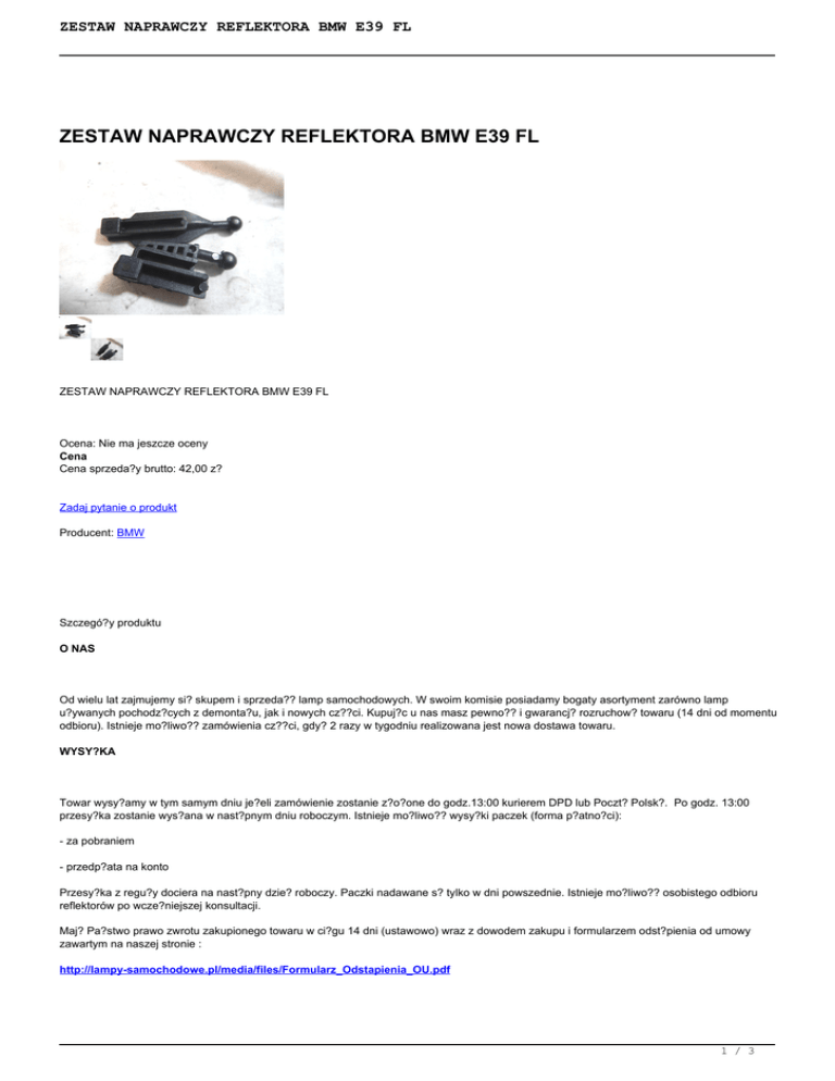 ZESTAW NAPRAWCZY REFLEKTORA BMW E39 FL ZESTAW NAPRAWCZY REFLEKTORA BMW E39 FL ZESTAW NAPRAWCZY REFLEKTORA BMW E39 FL Ocena: Nie ma jeszcze oceny Cena Cena sprzeda?y brutto: 42,00 z? Zadaj pytanie o produkt Producent: BMW Szczegó?y produktu O NAS Od wielu lat zajmujemy si? skupem i sprzeda?? lamp samochodowych. W swoim komisie posiadamy bogaty asortyment zarówno lamp u?ywanych pochodz?cych z demonta?u, jak i nowych cz??ci. Kupuj?c u nas masz pewno?? i gwarancj? rozruchow? towaru (14 dni od momentu odbioru). Istnieje mo?liwo?? zamówienia cz??ci, gdy? 2 razy w tygodniu realizowana jest nowa dostawa towaru. WYSY?KA Towar wysy?amy w tym samym dniu je?eli zamówienie zostanie z?o?one do godz.13:00 kurierem DPD lub Poczt? Polsk?. Po godz. 13:00 przesy?ka zostanie wys?ana w nast?pnym dniu roboczym. Istnieje mo?liwo?? wysy?ki paczek (forma p?atno?ci): - za pobraniem - przedp?ata na konto Przesy?ka z regu?y dociera na nast?pny dzie? roboczy. Paczki nadawane s? tylko w dni powszednie. Istnieje mo?liwo?? osobistego odbioru reflektorów po wcze?niejszej konsultacji. Maj? Pa?stwo prawo zwrotu zakupionego towaru w ci?gu 14 dni (ustawowo) wraz z dowodem zakupu i formularzem odst?pienia od umowy zawartym na naszej stronie : http://lampy-samochodowe.pl/media/files/Formularz_Odstapienia_OU.pdf 1 / 3 ZESTAW NAPRAWCZY REFLEKTORA BMW E39 FL bez podania przyczyny. Nie odbieramy przesy?ek za pobraniem. ZAKUP PRZEDMIOTU ZESTAW NAPRAWCZY REFLEKTORA BMW E39 FL 1. Wybierz produkt i dodaj go do koszyka. 2. Wybierz sposób zap?aty/ odbioru, uzupe?nij dane do wysy?ki 3. Ewentualne sugestie prosz? wpisa? w polu wiadomo??. 4. Oczekuj na kuriera- sprawd? zawarto?? przesy?ki przy odbiorze (wszystkie paczki s? ubezpieczone) . MODEL STRON OPIS STAN CENA /MARK A CZ??CI MAGA A ZYNO WY BMW ZESTAW 42,00 PLN E39 NAPRAW FL CZY PARAGON/FAKTURA Do ka?dej zakupionej cz??ci do??czamy paragon . Je?li ?ycz? Pa?stwo sobie faktur?, prosimy o informacj? wraz z danymi niezb?dnymi do jej wystawienia. KONTAKT: Wszelkie zapytania prosimy kierowa? na e-mail: [email protected] Wszystkie przedmioty s? dok?adnie opisane i skatalogowane. Je?li masz dodatkowe pytania prosimy o kontakt z nami pod nr tel.: 798-986-497 GODZINY OTWARCIA: Pracujemy od poniedzia?ku do soboty w godz. 8:00- 18:00. STRONA WWW: www.lampy-samochodowe.pl 2 / 3 ZESTAW NAPRAWCZY REFLEKTORA BMW E39 FL ZAMIENNIKI: Nie kupuj zamienników na innych aukcjach. S? to cz??ci o krótkiej ?ywotno?ci i s?abej jako?ci wykonania. Pos?u?? na zdecydowanie krótszy czas ni? cz??ci oryginalne, mimo, ?e s? nowe. Zakup na naszych aukcjach jest jednoznaczny z akceptacj? regulaminu dost?pnego na naszej stronie. DZI?KUJEMY ZA ZAINTERESOWANIE Mercedes - naprawa i przeróbka lamp LED tel: 513-531-967 / tel: 795-785-666 naprawa lamp LED - w przypadku uszkodzenia lamp LED w samochodach osobowych - producent nie przewidzia? ingerencji w lamp? , czy wymiany uszkodzonych elementów lub przepalanego LED - ASO oferuja wymian? lamp na nowe - jednak cena nowych lamp nadal powala na kolana - oferujemy napraw? i przeróbk lamp LED - przerabiamy równie? lampy z wersji USA www.motolampy.com ?#?naprawa_lamp? ?#?lampy_samochodowe? ?#?lampy_led? ?#?naprawa_led??#?przeróbka_usa? ?#?lampy_usa? Wi?kszo?? wspó?czesnych samochodów osobowych wyposa?onych jest w lampy zbudowane w oparciu o LED. Takie lampy nie posiadaj? zwyk?ych ?arówek . Minusem tego rozwi?zania jest brak mo?liwo?ci w?asnor?cznej szybkiej wymiany uszkodzonego czy przepalonego elementu. Autoryzowane serwisy nie widza innego wyj?cia jak wymian? lampy na now? , jednak cena nowych lamp powala na kolana. Nasza firma oferuje napraw? lamp LED. Naprawiamy lampy we wszystkich modelach Mercedes , Audi , BMW - inne po uzgodnieniu Przerabiamy równie? lampy z wersji USA na europ? Nie musisz wymienia? lamp na nowe - ka?d? naprawimy naprawa lamp regeneracja lamp lampy samochodowe autolampy lampy led, przeróbka lamp naprawa lamp led polerowanie reflektorów przeróbka lamp usa, lampy mercedes, naprawa reflektorów polerowanie lamp lampy ty? reflektor audi tanie lampy lampy u?ywane tuning lamp powrót Czytaj równie?: BMW e39 - opis , porady i ciekawostki Mercedes GL przeróbka lamp z USA Regeneracja reflektorów - Skoda Roomster Dlaczego regenerowa? lampy ? eXfan - lampy samochodowe - naprawa lamp 3 / 3 Powered by TCPDF (www.tcpdf.org)