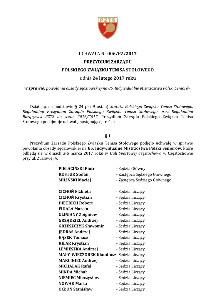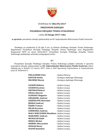 UCHWAŁA Nr 006/PZ/2017 PREZYDIUM ZARZĄDU POLSKIEGO ZWIĄZKU TENISA STOŁOWEGO z dnia 24 lutego 2017 roku w sprawie: powołania obsady sędziowskiej na 85. Indywidualne Mistrzostwa Polski Seniorów Działając na podstawie § 24 pkt 9 ust. a) Statutu Polskiego Związku Tenisa Stołowego, Regulaminu Prezydium Zarządu Polskiego Związku Tenisa Stołowego oraz Regulaminu Rozgrywek PZTS na sezon 2016/2017, Prezydium Zarządu Polskiego Związku Tenisa Stołowego podejmuje uchwałę następującej treści: §1 Prezydium Zarządu Polskiego Związku Tenisa Stołowego podjęło uchwałę w sprawie powołania obsady sędziowskiej na 85. Indywidualne Mistrzostwa Polski Seniorów, które odbędą się w dniach 3-5 marca 2017 roku w Hali Sportowej Częstochowa w Częstochowie przy ul. Żużlowej 4: PIELACIŃSKI Piotr KOSTUR Stefan MILIŃSKI Maciej - Sędzia Główny - Zastępca Sędziego Głównego - Zastępca Sędziego Głównego CICHOŃ Elżbieta - Sędzia Liczący CICHOŃ Krystian - Sędzia Liczący DIETRICH Robert - Sędzia Liczący FIDALA Marcin - Sędzia Liczący GLINIANY Zbigniew - Sędzia Liczący GRZĄDZIEL Andrzej - Sędzia Liczący GRZESZCZYK Sławomir - Sędzia Liczący JĘDRAS Andrzej - Sędzia Liczący KĄSEK Tomasz - Sędzia Liczący KILAR Krystian - Sędzia Liczący LEMIESZKA Andrzej - Sędzia Liczący MAŁY-WIECZOREK Klaudiusz- Sędzia Liczący MARCINIEC Andrzej - Sędzia Liczący MICHALAK Rafał - Sędzia Liczący MINDA Michał - Sędzia Liczący NIEMIEC Mieczysław - Sędzia Liczący NOWAK Marta - Sędzia Liczący OCŁOŃ Stanisław - Sędzia Liczący OLENCKI Robert OSIŃSKA Katarzyna OSIŃSKI Zbigniew RUSZKIEWICZ Tomasz WAWRYŁO Sławomir WILK Jacek WOLNY Marek WOLNY Michał ŻAK Marian ŻAK Przemysław - Sędzia Liczący - Sędzia Liczący - Sędzia Liczący - Sędzia Liczący - Sędzia Liczący - Sędzia Liczący - Sędzia Liczący - Sędzia Liczący - Sędzia Liczący - Sędzia Liczący §2 Uchwała weszła w życie z chwilą podjęcia.