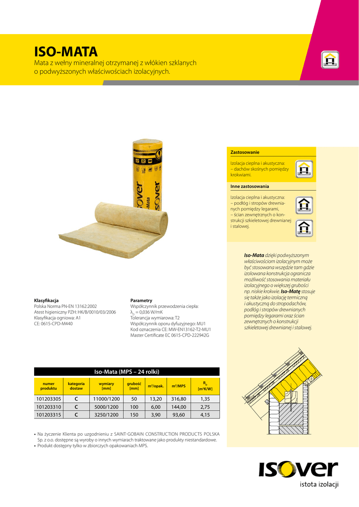 ISO-MATA Mata z wełny mineralnej otrzymanej z włókien szklanych o podwyższonych właściwościach izolacyjnych. Zastosowanie Izolacja cieplna i akustyczna: – dachów skośnych pomiędzy krokwiami. Inne zastosowania Izolacja cieplna i akustyczna: – podłóg i stropów drewnianych pomiędzy legarami, – ścian zewnętrznych o konstrukcji szkieletowej drewnianej i stalowej. Klasyfikacja Polska Norma PN-EN 13162:2002 Atest higieniczny PZH: HK/B/0010/03/2006 Klasyfikacja ogniowa: A1 CE: 0615-CPD-M440 Parametry Współczynnik przewodzenia ciepła: λD = 0,036 W/mK Tolerancja wymiarowa: T2 Współczynnik oporu dyfuzyjnego: MU1 Kod oznaczenia CE: MW-EN13162-T2-MU1 Master Certificate EC 0615-CPD-222942G Iso-Mata (MPS – 24 rolki) numer produktu kategoria dostaw wymiary [mm] grubość [mm] m2/opak. m2/MPS RD [m2K/W] 101203305 101203310 101203315 C C C 11000/1200 5000/1200 3250/1200 50 100 150 13,20 6,00 3,90 316,80 144,00 93,60 1,35 2,75 4,15 • Na życzenie Klienta po uzgodnieniu z SAINT-GOBAIN CONSTRUCTION PRODUCTS POLSKA Sp. z o.o. dostępne są wyroby o innych wymiarach traktowane jako produkty niestandardowe. • Produkt dostępny tylko w zbiorczych opakowaniach MPS. Iso-Mata dzięki podwyższonym właściwościom izolacyjnym może być stosowana wszędzie tam gdzie izolowana konstrukcja ogranicza możliwość stosowania materiału izolacyjnego o większej grubości np. niskie krokwie. Iso-Matę stosuje się także jako izolację termiczną i akustyczną do stropodachów, podłóg i stropów drewnianych pomiędzy legarami oraz ścian zewnętrznych o konstrukcji szkieletowej drewnianej i stalowej.