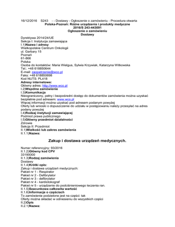 S243 - - Dostawy - Ogłoszenie o zamówieniu - Procedura otwarta Polska-Poznań: Różne urządzenia i produkty medyczne 2016/S 243-443091 Ogłoszenie o zamówieniu Dostawy Dyrektywa 2014/24/UE Sekcja I: Instytucja zamawiająca I.1)Nazwa i adresy Wielkopolskie Centrum Onkologii ul. Garbary 15 Poznań 61-866 Polska Osoba do kontaktów: Maria Wielgus, Sylwia Krzywiak, Katarzyna Witkowska Tel.: +48 618850644 E-mail: [email protected] Faks: +48 618850698 Kod NUTS: PL418 Adresy internetowe: Główny adres: http://www.wco.pl I.2)Wspólne zamówienie I.3)Komunikacja Nieograniczony, pełny i bezpośredni dostęp do dokumentów zamówienia można uzyskać bezpłatnie pod adresem: www.wco.pl Więcej informacji można uzyskać pod adresem podanym powyżej Oferty lub wnioski o dopuszczenie do udziału w postępowaniu należy przesyłać na adres podany powyżej I.4)Rodzaj instytucji zamawiającej Podmiot prawa publicznego I.5)Główny przedmiot działalności Zdrowie Sekcja II: Przedmiot II.1)Wielkość lub zakres zamówienia II.1.1)Nazwa: 16/12/2016 Zakup i dostawa urządzeń medycznych. Numer referencyjny: 93/2016 II.1.2)Główny kod CPV 33190000 II.1.3)Rodzaj zamówienia Dostawy II.1.4)Krótki opis: Zakup i dostawa urządzeń medycznych: Pakiet nr 1 - Respirator Pakiet nr 2 - Defibrylator Pakiet nr 3 - defibrylator Pakiet nr 4 - kardiotokograf Pakiet nr 5 - urządzenie do podciśnieniowego leczenia ran. II.1.5)Szacunkowa całkowita wartość II.1.6)Informacje o częściach To zamówienie podzielone jest na części: tak Oferty można składać w odniesieniu do wszystkich części II.2)Opis II.2.1)Nazwa: Respirator Część nr: 1 II.2.2)Dodatkowy kod lub kody CPV 33190000 II.2.3)Miejsce świadczenia usług Kod NUTS: PL415 Główne miejsce lub lokalizacja realizacji: Wielkopolskie Centrum Onkologii, ul. Garbary 15, 61-866 Poznań. II.2.4)Opis zamówienia: Respirator do wentylacji inwazyjnej oraz nieinwazyjnej - 2 sztuki. II.2.5)Kryteria udzielenia zamówienia Kryteria określone poniżej Kryterium jakości - Nazwa: Ocena techniczna / Waga: 30 Kryterium jakości - Nazwa: Okres gwarancji / Waga: 10 Cena - Waga: 60 II.2.6)Szacunkowa wartość II.2.7)Okres obowiązywania zamówienia, umowy ramowej lub dynamicznego systemu zakupów Okres w dniach: 42 Niniejsze zamówienie podlega wznowieniu: nie II.2.10)Informacje o ofertach wariantowych Dopuszcza się składanie ofert wariantowych: nie II.2.11)Informacje o opcjach Opcje: nie II.2.12)Informacje na temat katalogów elektronicznych II.2.13)Informacje o funduszach Unii Europejskiej Zamówienie dotyczy projektu/programu finansowanego ze środków Unii Europejskiej: nie II.2.14)Informacje dodatkowe II.2)Opis II.2.1)Nazwa: Defibrylator Część nr: 2 II.2.2)Dodatkowy kod lub kody CPV 33190000 II.2.3)Miejsce świadczenia usług Kod NUTS: PL415 Główne miejsce lub lokalizacja realizacji: Wielkopolskie Centrum Onkologii, ul. Garbary 15, 61-866 Poznań. II.2.4)Opis zamówienia: Defibrylator- 1 sztuka. II.2.5)Kryteria udzielenia zamówienia Kryteria określone poniżej Kryterium jakości - Nazwa: Ocena techniczna / Waga: 30 Kryterium jakości - Nazwa: Okres gwarancji / Waga: 10 Cena - Waga: 60 II.2.6)Szacunkowa wartość II.2.7)Okres obowiązywania zamówienia, umowy ramowej lub dynamicznego systemu zakupów Okres w dniach: 42 Niniejsze zamówienie podlega wznowieniu: nie II.2.10)Informacje o ofertach wariantowych Dopuszcza się składanie ofert wariantowych: nie II.2.11)Informacje o opcjach Opcje: nie II.2.12)Informacje na temat katalogów elektronicznych II.2.13)Informacje o funduszach Unii Europejskiej Zamówienie dotyczy projektu/programu finansowanego ze środków Unii Europejskiej: nie II.2.14)Informacje dodatkowe II.2)Opis II.2.1)Nazwa: Defibrylator Część nr: 3 II.2.2)Dodatkowy kod lub kody CPV 33190000 II.2.3)Miejsce świadczenia usług Kod NUTS: PL415 Główne miejsce lub lokalizacja realizacji: Wielkopolskie Centrum Onkologii, ul. Garbary 15, 61-866 Poznań. II.2.4)Opis zamówienia: Defibrylator- 1 sztuka. II.2.5)Kryteria udzielenia zamówienia Kryteria określone poniżej Kryterium jakości - Nazwa: Ocena techniczna / Waga: 30 Kryterium jakości - Nazwa: Okres gwarancji / Waga: 10 Cena - Waga: 60 II.2.6)Szacunkowa wartość II.2.7)Okres obowiązywania zamówienia, umowy ramowej lub dynamicznego systemu zakupów Okres w dniach: 42 Niniejsze zamówienie podlega wznowieniu: nie II.2.10)Informacje o ofertach wariantowych Dopuszcza się składanie ofert wariantowych: nie II.2.11)Informacje o opcjach Opcje: nie II.2.12)Informacje na temat katalogów elektronicznych II.2.13)Informacje o funduszach Unii Europejskiej Zamówienie dotyczy projektu/programu finansowanego ze środków Unii Europejskiej: nie II.2.14)Informacje dodatkowe II.2)Opis II.2.1)Nazwa: Kardiotokograf Część nr: 4 II.2.2)Dodatkowy kod lub kody CPV 33190000 II.2.3)Miejsce świadczenia usług Kod NUTS: PL415 Główne miejsce lub lokalizacja realizacji: Wielkopolskie Centrum Onkologii, ul. Garbary 15, 61-866 Poznań. II.2.4)Opis zamówienia: Kardiotokograf- 1 sztuka. II.2.5)Kryteria udzielenia zamówienia Kryteria określone poniżej Kryterium jakości - Nazwa: Ocena techniczna / Waga: 30 Kryterium jakości - Nazwa: Okres gwarancji / Waga: 10 Cena - Waga: 60 II.2.6)Szacunkowa wartość II.2.7)Okres obowiązywania zamówienia, umowy ramowej lub dynamicznego systemu zakupów Okres w dniach: 42 Niniejsze zamówienie podlega wznowieniu: nie II.2.10)Informacje o ofertach wariantowych Dopuszcza się składanie ofert wariantowych: nie II.2.11)Informacje o opcjach Opcje: nie II.2.12)Informacje na temat katalogów elektronicznych II.2.13)Informacje o funduszach Unii Europejskiej Zamówienie dotyczy projektu/programu finansowanego ze środków Unii Europejskiej: nie II.2.14)Informacje dodatkowe II.2)Opis II.2.1)Nazwa: Urządzenie do podciśnieniowego leczenia ran Część nr: 5 II.2.2)Dodatkowy kod lub kody CPV 33190000 II.2.3)Miejsce świadczenia usług Kod NUTS: PL415 Główne miejsce lub lokalizac