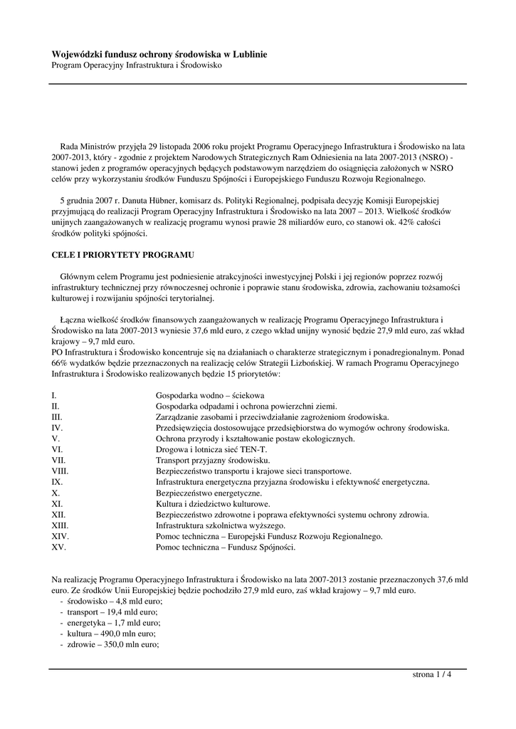 Wojewódzki fundusz ochrony środowiska w Lublinie Program Operacyjny Infrastruktura i Środowisko Rada Ministrów przyjęła 29 listopada 2006 roku projekt Programu Operacyjnego Infrastruktura i Środowisko na lata 2007-2013, który - zgodnie z projektem Narodowych Strategicznych Ram Odniesienia na lata 2007-2013 (NSRO) stanowi jeden z programów operacyjnych będących podstawowym narzędziem do osiągnięcia założonych w NSRO celów przy wykorzystaniu środków Funduszu Spójności i Europejskiego Funduszu Rozwoju Regionalnego. 5 grudnia 2007 r. Danuta Hübner, komisarz ds. Polityki Regionalnej, podpisała decyzję Komisji Europejskiej przyjmującą do realizacji Program Operacyjny Infrastruktura i Środowisko na lata 2007 – 2013. Wielkość środków unijnych zaangażowanych w realizację programu wynosi prawie 28 miliardów euro, co stanowi ok. 42% całości środków polityki spójności. CELE I PRIORYTETY PROGRAMU Głównym celem Programu jest podniesienie atrakcyjności inwestycyjnej Polski i jej regionów poprzez rozwój infrastruktury technicznej przy równoczesnej ochronie i poprawie stanu środowiska, zdrowia, zachowaniu tożsamości kulturowej i rozwijaniu spójności terytorialnej. Łączna wielkość środków finansowych zaangażowanych w realizację Programu Operacyjnego Infrastruktura i Środowisko na lata 2007-2013 wyniesie 37,6 mld euro, z czego wkład unijny wynosić będzie 27,9 mld euro, zaś wkład krajowy – 9,7 mld euro. PO Infrastruktura i Środowisko koncentruje się na działaniach o charakterze strategicznym i ponadregionalnym. Ponad 66% wydatków będzie przeznaczonych na realizację celów Strategii Lizbońskiej. W ramach Programu Operacyjnego Infrastruktura i Środowisko realizowanych będzie 15 priorytetów: I. II. III. IV. V. VI. VII. VIII. IX. X. XI. XII. XIII. XIV. XV. Gospodarka wodno – ściekowa Gospodarka odpadami i ochrona powierzchni ziemi. Zarządzanie zasobami i przeciwdziałanie zagrożeniom środowiska. Przedsięwzięcia dostosowujące przedsiębiorstwa do wymogów ochrony środowiska. Ochrona przyrody i kształtowanie postaw ekologicznych. Drogowa i lotnicza sieć TEN-T. Transport przyjazny środowisku. Bezpieczeństwo transportu i krajowe sieci transportowe. Infrastruktura energetyczna przyjazna środowisku i efektywność energetyczna. Bezpieczeństwo energetyczne. Kultura i dziedzictwo kulturowe. Bezpieczeństwo zdrowotne i poprawa efektywności systemu ochrony zdrowia. Infrastruktura szkolnictwa wyższego. Pomoc techniczna – Europejski Fundusz Rozwoju Regionalnego. Pomoc techniczna – Fundusz Spójności. Na realizację Programu Operacyjnego Infrastruktura i Środowisko na lata 2007-2013 zostanie przeznaczonych 37,6 mld euro. Ze środków Unii Europejskiej będzie pochodziło 27,9 mld euro, zaś wkład krajowy – 9,7 mld euro. - środowisko – 4,8 mld euro; - transport – 19,4 mld euro; - energetyka – 1,7 mld euro; - kultura – 490,0 mln euro; - zdrowie – 350,0 mln euro; strona 1 / 4 Wojewódzki fundusz ochrony środowiska w Lublinie Program Operacyjny Infrastruktura i Środowisko - szkolnictwo wyższe – 500,0 mln euro. Dodatkowo dla Programu Operacyjnego Infrastruktura i Środowisko przewidziane zostały środki na pomoc techniczną (w sumie 581,3 mln euro). EWALUACJA EX-ANTE I OCENA ODDZIAŁYWANIA NA ŚRODOWISKO Na podstawie ewaluacji ex-ante projektu Programu Operacyjnego Infrastruktura i Środowisko, strategicznej oceny oddziaływania na środowisko (sooś) oraz przebiegu konsultacji społecznych (10 konferencji, w których wzięło udział 1.700 osób) dokonano zmian w projekcie przyjętym kierunkowo przez RM 1 sierpnia br., m.in. - zwiększono alokację środków UE na Program o 6 573 mln euro, - dodano dwa priorytety: „Infrastruktura szkolnictwa wyższego” oraz „Konkurencyjność regionów”, - przeformułowano zakres osi priorytetowej III, w związku z postulatami organizacji ekologicznych, gdzie obecnie kładzie się nacisk na małą retencję, zaś duże inwestycje w urządzenia hydrotechniczne będą wspierane tylko w uzasadnionych przypadkach. ZARZĄDZANIE PROGRAMEM Instytucją Zarządzającą Programem Operacyjnym Infrastruktura i Środowisko jest minister właściwy ds. rozwoju regionalnego, który wykonuje swoje funkcje przy pomocy Departamentu Koordynacji Programów Infrastrukturalnych w Ministerstwie Rozwoju Regionalnego. Instytucja Zarządzająca przekaże realizację części swoich zadań Instytucjom Pośredniczącym, tj. ministrom właściwym. REALIZACJA PROGRAMU Tryb pozakonkursowy obejmie zgodnie z projektem ustawy o zasadach prowadzenia polityki rozwoju: - Duże projekty, których koszt całkowity przekracza 25 mln euro – w przypadku projektów dotyczących środowiska naturalnego oraz projektów o wartości powyżej 50 mln euro – w przypadku innych dziedzin, zatwierdzane przez Komisję Europejską. - Projekty systemowe - polegające na dofinansowaniu realizacji przez poszczególne organy administracji publicznej i inne jednostki organizacyjne sektora finansów publicznych, zadań publicznych określonych w odrębnych przepisach dotyczących tych organów i jednostek; - Projekty indywidualne – określone w programie operacyjnym, zgłaszane przez beneficjentów imiennie wskazanych w programie operacyjnym; - Projekty pomocy technicznej Pozostałe projekty będą wybierane w drodze konkursu. Wojewódzki Fundusz Ochrony Środowiska i Gospodarki Wodnej w Lublinie pełni rolę Instytucji Wdrażającej dla 2 osi priorytetowych PO Infrastruktura i Środowisko. Są to: Oś priorytetowa I - Gospodarka wodno-ściekowa Cel priorytetu: Wyposażenie (do końca 2015 r.) aglomeracji powyżej 15 tys. RLM w systemy kanalizacji oraz oczyszczalnie ścieków zgodnie z wymogami akcesyjnymi nałożonymi na Polskę przez UE. Działanie: strona 2 / 4 Wojewódzki fundusz ochrony środowiska w Lublinie Program Operacyjny Infrastruktura i Środowisko Gospodarka wodno - ściekowa w aglomeracjach powyżej 15 ty