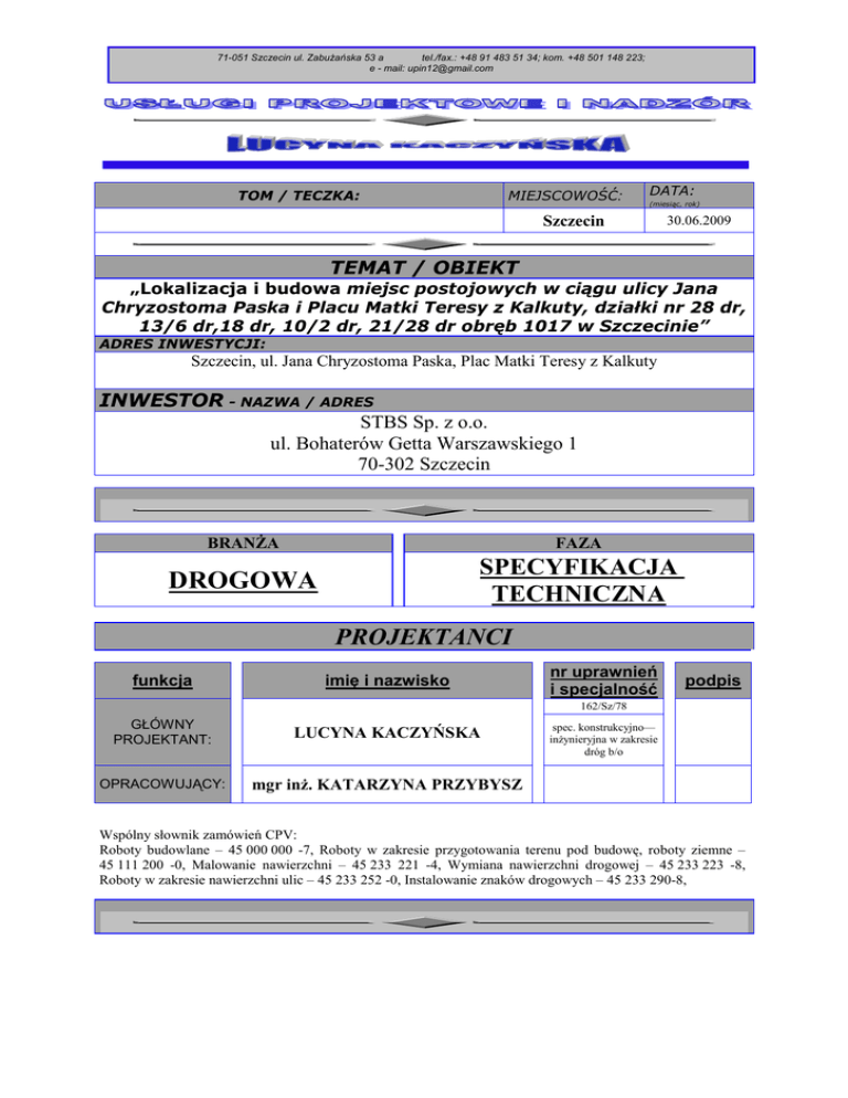 71-051 Szczecin ul. ZabuŜańska 53 a tel./fax.: +48 91 483 51 34; kom. +48 501 148 223; e - mail: [email protected] MIEJSCOWOŚĆ: TOM / TECZKA: DATA: (miesiąc, rok) Szczecin 30.06.2009 TEMAT / OBIEKT „Lokalizacja i budowa miejsc postojowych w ciągu ulicy Jana Chryzostoma Paska i Placu Matki Teresy z Kalkuty, działki nr 28 dr, 13/6 dr,18 dr, 10/2 dr, 21/28 dr obręb 1017 w Szczecinie” ADRES INWESTYCJI: Szczecin, ul. Jana Chryzostoma Paska, Plac Matki Teresy z Kalkuty INWESTOR - NAZWA / ADRES STBS Sp. z o.o. ul. Bohaterów Getta Warszawskiego 1 70-302 Szczecin BRANśA FAZA DROGOWA SPECYFIKACJA TECHNICZNA PROJEKTANCI funkcja imię i nazwisko nr uprawnień i specjalność podpis 162/Sz/78 GŁÓWNY PROJEKTANT: LUCYNA KACZYŃSKA OPRACOWUJĄCY: mgr inŜ. KATARZYNA PRZYBYSZ spec. konstrukcyjno— inŜynieryjna w zakresie dróg b/o Wspólny słownik zamówień CPV: Roboty budowlane – 45 000 000 -7, Roboty w zakresie przygotowania terenu pod budowę, roboty ziemne – 45 111 200 -0, Malowanie nawierzchni – 45 233 221 -4, Wymiana nawierzchni drogowej – 45 233 223 -8, Roboty w zakresie nawierzchni ulic – 45 233 252 -0, Instalowanie znaków drogowych – 45 233 290-8,