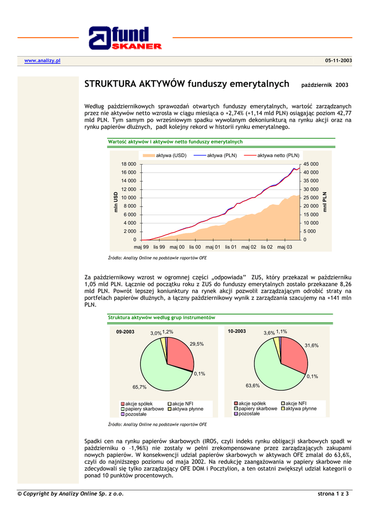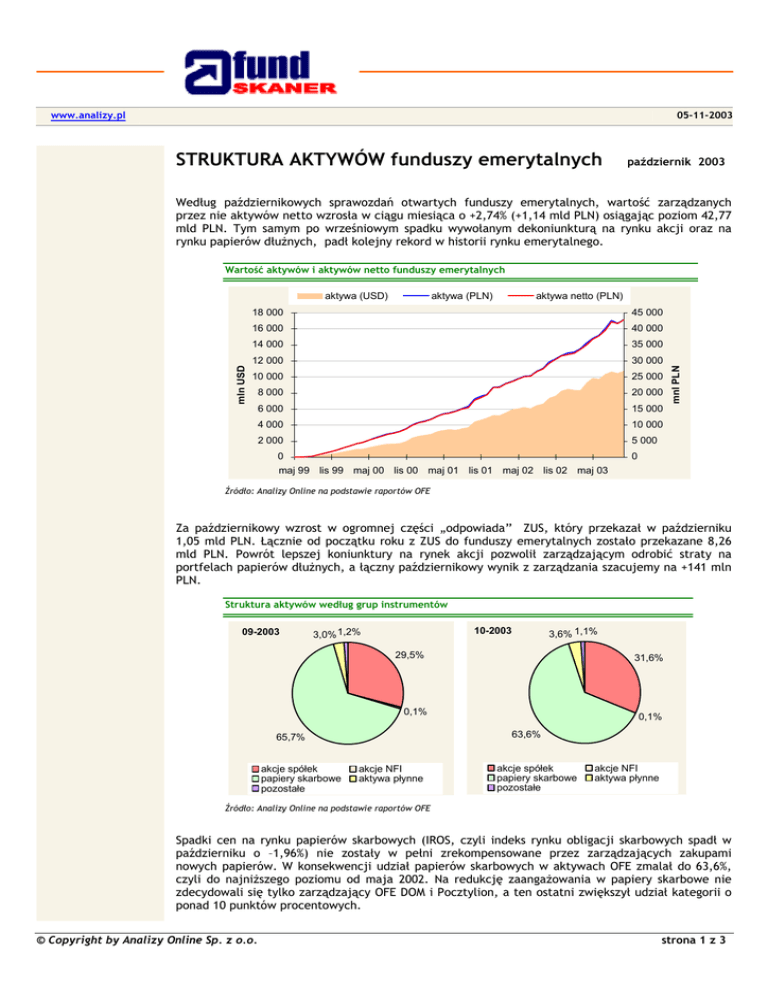 www.analizy.pl 05-11-2003 STRUKTURA AKTYWÓW funduszy emerytalnych październik 2003 Według październikowych sprawozdań otwartych funduszy emerytalnych, wartość zarządzanych przez nie aktywów netto wzrosła w ciągu miesiąca o +2,74% (+1,14 mld PLN) osiągając poziom 42,77 mld PLN. Tym samym po wrześniowym spadku wywołanym dekoniunkturą na rynku akcji oraz na rynku papierów dłużnych, padł kolejny rekord w historii rynku emerytalnego. Wartość aktywów i aktywów netto funduszy emerytalnych aktywa (PLN) aktywa netto (PLN) 45 000 16 000 40 000 14 000 35 000 12 000 30 000 10 000 25 000 8 000 20 000 6 000 15 000 4 000 10 000 2 000 5 000 0 maj 99 lis 99 maj 00 lis 00 maj 01 lis 01 maj 02 lis 02 maj 03 mnl PLN mln USD aktywa (USD) 18 000 0 Źródło: Analizy Online na podstawie raportów OFE Za październikowy wzrost w ogromnej części „odpowiada” ZUS, który przekazał w październiku 1,05 mld PLN. Łącznie od początku roku z ZUS do funduszy emerytalnych zostało przekazane 8,26 mld PLN. Powrót lepszej koniunktury na rynek akcji pozwolił zarządzającym odrobić straty na portfelach papierów dłużnych, a łączny październikowy wynik z zarządzania szacujemy na +141 mln PLN. Struktura aktywów według grup instrumentów 09-2003 10-2003 3,0% 1,2% 3,6% 1,1% 29,5% 31,6% 0,1% 63,6% 65,7% akcje spółek papiery skarbowe pozostałe 0,1% akcje NFI aktywa płynne akcje spółek papiery skarbowe pozostałe akcje NFI aktywa płynne Źródło: Analizy Online na podstawie raportów OFE Spadki cen na rynku papierów skarbowych (IROS, czyli indeks rynku obligacji skarbowych spadł w październiku o –1,96%) nie zostały w pełni zrekompensowane przez zarządzających zakupami nowych papierów. W konsekwencji udział papierów skarbowych w aktywach OFE zmalał do 63,6%, czyli do najniższego poziomu od maja 2002. Na redukcję zaangażowania w papiery skarbowe nie zdecydowali się tylko zarządzający OFE DOM i Pocztylion, a ten ostatni zwiększył udział kategorii o ponad 10 punktów procentowych. © Copyright by Analizy Online Sp. z o.o. strona 1 z 3 www.analizy.pl Struktura aktywów funduszy emerytalnych 05-11-2003 Niejako na drugim biegunie znajduje się OFE Bankowy, którego zarządzający zredukował zaangażowanie w papiery skarbowe do 45,2%, przesuwając znaczną część środków na depozyty. Zabieg ten miał zapewne doprowadzić do znacznej redukcji duration portfela, co powinno go uodpornić na ewentualny dalszy wzrost rynkowych stóp procentowych. Udział najważniejszych składników w aktywach poszczególnych funduszy OFE akcje mln PLN OFE AIG papiery skarbowe udział mln PLN udział płynne aktywa mln PLN udział pozostałe mln PLN udział 1 164,7 31,7% 2 343,7 63,7% 129,1 3,5% 40,1 1,1% OFE Allianz 343,9 29,6% 742,3 64,0% 63,9 5,5% 10,4 0,9% OFE Bankowy 447,3 34,3% 590,0 45,2% 249,2 19,1% 18,3 1,4% 3 835,2 31,6% 7 956,7 65,6% 211,1 1,7% 129,8 1,1% 233,0 32,3% 468,4 65,0% 18,0 2,5% 0,9 0,1% 80,6 30,6% 157,0 59,5% 9,0 3,4% 17,2 6,5% 3 231,9 33,7% 6 088,5 63,5% 154,5 1,6% 120,9 1,3% 254,9 29,8% 558,7 65,2% 43,3 5,1% 0,0 OFE Commercial Union OFE DOM OFE Kredyt Bank OFE ING NNP OFE Ergo Hestia OFE Pocztylion 272,8 30,2% 570,8 63,3% 15,1 1,7% 43,7 4,8% OFE Pekao 182,9 26,2% 469,8 67,4% 42,5 6,1% 2,0 0,3% OFE Polsat 47,7 27,1% 118,7 67,4% 9,8 5,6% 0,0 OFE PZU Złota Jesień 1 838,6 30,6% 3 772,1 62,8% 371,2 6,2% 24,6 OFE Sampo 381,5 29,6% 794,8 61,7% 111,2 8,6% 0,0 OFE Skarbiec Emerytura 503,4 31,7% 1 031,0 65,0% 19,0 1,2% 33,6 2,1% OFE Credit Suisse Life & Pensions 332,8 31,3% 670,9 63,1% 39,1 3,7% 20,4 1,9% OFE Generali 448,1 31,7% 917,7 64,8% 50,0 3,5% 0,0 13 599,2 31,7% 27 251,2 63,6% 1 536,1 3,6% 462,0 Razem 0,4% 1,1% W obrębie portfela akcji zanotowaliśmy odmienną niż w przypadku papierów skarbowych sytuację ich udział przekroczył 31,6%, co stanowi trzeci wynik w historii. Większe zaangażowanie występowało w lutym i marcu 2000 roku, czyli w apogeum internetowej hossy. Na największy wzrost zaangażowania zdecydowali się zarządzający OFE Polsat, AIG i Skrbiec Emerytura. Tomasz Publicewicz Marta Tomczyk © Copyright by Analizy Online Sp. z o.o. [email protected] [email protected] strona 2 z 3 www.analizy.pl Struktura aktywów funduszy emerytalnych 05-11-2003 Spółka Analizy Online jest niezależną firmą analityczną zajmującą się monitoringiem rynku polskich i zagranicznych funduszy inwestycyjnych i emerytalnych oraz analizą rynku polskich papierów dłużnych. W zakres analiz rynku funduszy wchodzą między innymi rankingi funduszy, ocena efektywności działań zarządzających oraz analiza ich wpływu na polski rynek finansowy. Niniejsze opracowanie zostało sporządzone wyłącznie w celu informacyjnym zgodnie z najlepszą wiedzą i starannością autorów. Dane wykorzystane przy tworzeniu opracowania pochodzą ze źródeł uważanych przez firmę Analizy Online Sp. z o.o. za wiarygodne i dokładne, lecz nie istnieje gwarancja, iż są one kompletne i odzwierciedlają stan faktyczny. Opinie zawarte w niniejszym opracowaniu częściowo bazują na wartościach szacunkowych, wyznaczanych zgodnie z metodologią stosowaną przez Analizy Online Sp. z o.o., które mogą odbiegać od danych rzeczywistych. Spółka Analizy Online Sp. z o.o. nie ponosi odpowiedzialności za ewentualne szkody spowodowane wykorzystaniem opinii i informacji zawartych w niniejszym opracowaniu. Niniejsze opracowanie jest przeznaczone do wyłącznego, własnego użytku Klientów spółki Analizy Online Sp. z o.o., którzy otrzymali je bezpośrednio od spółki Analizy Online Sp. z o.o. Publikowanie niniejszego opracowania w prasie, internecie i innych środkach masowego przekazu w całości bądź w części, jak również przytaczanie zawartych w nim opinii wymaga pisemnej zgody spółki Analizy Online Sp. z o.o. © Copyright by Analizy Online Sp. z o.o. strona 3 z 3