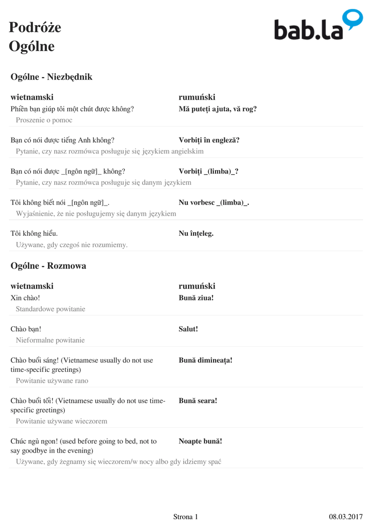 Podróże Ogólne Ogólne - Niezbędnik wietnamski rumuński Phiền bạn giúp tôi một chút được không? Proszenie o pomoc Mă puteți ajuta, vă rog? Bạn có nói được tiếng Anh không? Vorbiți în engleză? Pytanie, czy nasz rozmówca posługuje się językiem angielskim Bạn có nói được _[ngôn ngữ]_ không? Vorbiți _(limba)_? Pytanie, czy nasz rozmówca posługuje się danym językiem Tôi không biết nói _[ngôn ngữ]_. Nu vorbesc _(limba)_. Wyjaśnienie, że nie posługujemy się danym językiem Tôi không hiểu. Używane, gdy czegoś nie rozumiemy. Nu înțeleg. Ogólne - Rozmowa wietnamski rumuński Xin chào! Standardowe powitanie Bună ziua! Chào bạn! Nieformalne powitanie Salut! Chào buổi sáng! (Vietnamese usually do not use time-specific greetings) Powitanie używane rano Bună dimineața! Chào buổi tối! (Vietnamese usually do not use timespecific greetings) Powitanie używane wieczorem Bună seara! Chúc ngủ ngon! (used before going to bed, not to Noapte bună! say goodbye in the evening) Używane, gdy żegnamy się wieczorem/w nocy albo gdy idziemy spać Strona 1 08.03.2017 Podróże Ogólne Bạn có khỏe không? Uprzejme zapytanie o samopoczucie rozmówcy Ce mai faci? Tôi khỏe, còn bạn? Uprzejma odpowiedź na pytanie o samopoczucie Bine, mulțumesc. Tên bạn là gì? / Bạn tên là gì? Pytanie o imię (i nazwisko) rozmówcy Cum te numești? Tên tôi là ___. / Tôi tên là ___. Informowanie rozmówcy, jak się nazywamy Mă numesc ___. Bạn đến từ đâu? Pytanie o pochodzenie rozmówcy De unde ești? Tôi đến từ ___. Informowanie rozmówcy, skąd pochodzimy Sunt din ___. Bạn bao nhiêu tuổi? Pytanie o wiek rozmówcy Câți ani ai? Tôi ___ tuổi. Informowanie rozmówcy, ile mamy lat Am __ ani. Có / Vâng / Rồi... (usage depends on contexts) Odpowiedź twierdząca Da Không / Chưa... (usage depends on contexts) Odpowiedź przecząca Nu Làm ơn Słowo dodające zdaniu uprzejmości Vă rog Của bạn đây / Đây Używane, gdy (po)dajemy coś komuś Poftim! Cảm ơn (bạn). Podziękowanie Mulțumesc Strona 2 08.03.2017 Podróże Ogólne Cảm ơn (bạn) rất nhiều. Bardzo uprzejme podziękowanie Mulțumesc mult Không có gì (đâu). Uprzejma odpowiedź na podziękowanie Cu plăcere Tôi xin lỗi. Przeprosiny za coś Îmi pare rău (Làm ơn) cho hỏi. Zwracanie czyjejś uwagi Mă scuzați Không sao (đâu). Odpowiedź na przeprosiny, które przyjęliśmy Nu face nimic Không có gì. Odpowiedź na przeprosiny, które przyjęliśmy Nici o problemă Coi chừng! / Cẩn thận! Ostrzeżenie przed niebezpieczeństwem Ai grijă! Tôi đói. Używane, gdy jesteśmy głodni Mi-e foame Tôi khát (nước). Używane, gdy jesteśmy spragnieni Mi-e sete Tôi mệt. Używane, gdy jesteśmy zmęczeni Sunt obosit Tôi bị ốm. /Tôi thấy không được khỏe. Używane, gdy źle się czujemy Mă simt rău Tôi không biết. Nu știu Używane, gdy nie znamy odpowiedzi na zadane pytanie Rất vui được gặp bạn. Uprzejme pożegnanie po pierwszym spotkaniu Mi-a făcut plăcere să te cunosc Strona 3 08.03.2017 Podróże Ogólne Tạm biệt / Chào bạn! Pożegnanie La revedere! Ogólne - Skargi wietnamski rumuński Tôi muốn phản ánh một sự việc / điều đáng phàn nàn. Uprzejmy sposób rozpoczęcia skargi Aș dori să fac o reclamație Ở đây ai là người chịu trách nhiệm? Pytanie o osobę zarządzającą Cine este responsabil aici? Thật không thể chấp nhận được! Wyrażanie swojego niezadowolenia Este complet inacceptabil! Tôi muốn được hoàn lại tiền! Żądanie zwrotu pieniędzy Îmi vreau banii înapoi! Chúng tôi ngồi đợi hơn một tiếng đồng hồ rồi. Skarga na długi czas oczekiwania Așteptăm de mai mult de o ora. Ogólne - Przekleństwa wietnamski rumuński Đồ ăn như dở hơi! Mâncarea asta are un gust de rahat! Niegrzeczny sposób wyrażania niezadowolenia z jedzenia Đồ uống như dở hơi! Această băutură are gust de pișat! Niegrzeczny sposób wyrażania niezadowolenia z podanego napoju Chỗ này / Quán này như cứt! Locul ăsta este o cocină! Niegrzeczny sposób wyrażania niezadowolenia z miejsca/lokalu Cái xe (ô tô) này là đồ bỏ! Mașina asta este o epavă! Niegrzeczny sposób wyrażania niezadowolenia z samochodu Strona 4 08.03.2017 Podróże Ogólne Dịch vụ dở ẹc! Serviciul e de rahat! Niegrzeczny sposób wyrażania niezadowolenia z obsługi Giá gì mà cắt cổ! Niegrzeczny sposób narzekania na wysokie ceny Asta e jecmăneală totală! Vớ vẩn! E o prostie! Niegrzeczny sposób wyrażania niedowierzania w coś, co ktoś powiedział Đồ ngu! Ești un prost imbecil! Obrażanie osoby poprzez krytykę jego/jej inteligencji Mày biết cái quái gì (mà nói)! / Mày biết cái đếch gì (mà nói)! Obrażanie osoby poprzez krytykę jego/jej wiedzy Nu știi nici pe dracu! Biến đi! / Cút đi! Cară-te! Używane, gdy chcemy, żeby ktoś sobie poszedł natychmiast Tao với mày ra ngoài kia tính sổ! "Propozycja" bójki poza lokalem Hai să rezolvăm asta afară! Strona 5 Powered by TCPDF (www.tcpdf.org) 08.03.2017