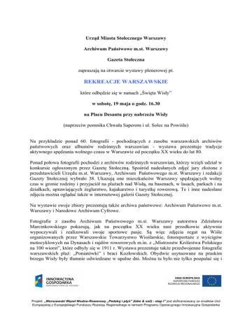 Urząd Miasta Stołecznego Warszawy Archiwum Państwowe m.st. Warszawy Gazeta Stołeczna zapraszają na otwarcie wystawy plenerowej pt. REKREACJE WARSZAWSKIE które odbędzie się w ramach „Święta Wisły” w sobotę, 19 maja o godz. 16.30 na Placu Desantu przy nabrzeżu Wisły (naprzeciw pomnika Chwała Saperom i ul. Solec na Powiślu) Na przykładzie ponad 60. fotografii - pochodzących z zasobu warszawskich archiwów państwowych oraz albumów rodzinnych warszawian - wystawa prezentuje tradycje aktywnego spędzania wolnego czasu w Warszawie od początku XX wieku do lat 80. Ponad połowa fotografii pochodzi z archiwów rodzinnych warszawian, którzy wzięli udział w konkursie ogłoszonym przez Gazetę Stołeczną. Spośród nadesłanych zdjęć jury złożone z przedstawicieli Urzędu m.st. Warszawy, Archiwum Państwowego m.st. Warszawy i redakcji Gazety Stołecznej wybrało 38. Ukazują one mieszkańców Warszawy spędzających wolny czas w gronie rodziny i przyjaciół na plażach nad Wisłą, na basenach, w lasach, parkach i na działkach; uprawiających żeglarstwo, kajakarstwo i turystkę rowerową. Te i inne nadesłane zdjęcia można oglądać także w internetowej galerii Gazety Stołecznej. Na wystawie swoje zbiory prezentują także archiwa państwowe: Archiwum Państwowe m.st. Warszawy i Narodowe Archiwum Cyfrowe. Fotografie z zasobu Archiwum Państwowego m.st. Warszawy autorstwa Zdzisława Marcinkowskiego pokazują, jak na początku XX wieku nasi przodkowie aktywnie wypoczywali i realizowali swoje sportowe pasje. Są więc zdjęcia regat na Wiśle organizowanych przez Warszawskie Towarzystwo Wioślarskie, fotoreportaże z wyścigów motocyklowych na Dynasach i rajdów rowerowych m.in. z „Mistrzostw Królestwa Polskiego na 100 wiorst”, które odbyły się w 1911 r. Wystawa prezentuje także przedwojenne fotografie warszawskich plaż: „Poniatówki” i braci Kozłowskich. Obydwie usytuowane na praskim brzegu Wisły były tłumnie odwiedzane w upalne dni. Można tu było nie tylko poopalać się i Projekt: „Warszawski Węzeł Wodno-Rowerowy „Pedałuj i płyń” (bike & sail) - etap I” jest dofinansowany ze środków Unii Europejskiej z Europejskiego Funduszu Rozwoju Regionalnego w ramach Programu Operacyjnego Innowacyjna Gospodarka pokąpać w rzece, ale także zagrać w piłkę siatkową, uprawiać zapasy, zjeść obiad w restauracji i potańczyć. Na wystawie można także zapoznać się z zasadami gry w piłkę nożną wydanymi w 1917 r. przez Klub Sportowy „Polonia”. Pierwsi kibice tego sportu mogli dowiedzieć się z nich między innymi, że „gra zaczyna się kopnięciem piłki ustawionej na środku boiska, a zadaniem każdej partji jest przeprowadzenie jej jak najwięcej razy przez bramkę przeciwnika”. Wystawa odsłania także tajniki fotografii sportowej. Jak radziło w 1929 r. pismo Światowid zdjęcie meczu piłkarskiego „musi zawsze zawierać osoby w ruchu i piłkę, ponieważ bez tej ostatniej najlepsze zdjęcie wygląda martwo i nieciekawie”. Prezentowane są także zdjęcia autorstwa Zbyszka Siemaszki z lat 50., 60. i 70. XX w. pochodzące z zasobu Narodowego Archiwum Cyfrowego: chłopców grających w „zośkę” przed Sejmem na ul. Jana Matejki, plażowiczów nad Wisłą, narciarzy wodnych i żeglarzy korzystających z uroków rzeki na tle warszawskich mostów i górującego nad miastem Pałacu Kultury i Nauki. Wystawę można będzie oglądać do 20 maja, następnie w najbliższym czasie 2 czerwca na III Warszawskim Pikniku Archiwalnym w Pałacu Staszica, a także podczas lata w wielu miejscach Warszawy. Projekt: „Warszawski Węzeł Wodno-Rowerowy „Pedałuj i płyń” (bike & sail) - etap I” jest dofinansowany ze środków Unii Europejskiej z Europejskiego Funduszu Rozwoju Regionalnego w ramach Programu Operacyjnego Innowacyjna Gospodarka