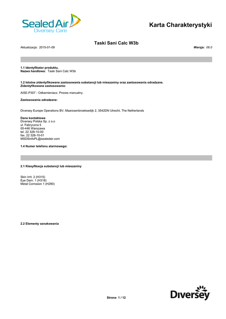 Karta Charakterystyki Taski Sani Calc W3b Wersja: 06.0 Aktualizacja: 2015-01-09 1.1 Identyfikator produktu. Nazwa handlowa: Taski Sani Calc W3b 1.2 Istotne zidentyfikowane zastosowania substancji lub mieszaniny oraz zastosowania odradzane. Zidentyfikowane zastosowania: AISE-P307 - Odkamieniacz. Proces manualny. Zastosowania odradzane: Diversey Europe Operations BV, Maarssenbroeksedijk 2, 3542DN Utrecht, The Netherlands Dane kontaktowe Diversey Polska Sp. z o.o ul. Fabryczna 5 00-446 Warszawa tel. 22 328-10-00 fax. 22 328-10-01 [email protected] 1.4 Numer telefonu alarmowego: 2.1 Klasyfikacja substancji lub mieszaniny Skin Irrit. 2 (H315) Eye Dam. 1 (H318) Metal Corrosion 1 (H290) 2.2 Elementy oznakowania Strona 1 / 12 KARTA CHARAKTERYSTYKI Taski Sani Calc W3b XIII. 3.2 Mieszaniny kwas fosforowy(V) Numer WE Numer CAS Numer REACH 231-633-2 7664-38-2 01-2119485924-24 Polymer* 69011-36-5 [4] powierzchniowo czynne (alkohol (C13) etoksylowany (8-9EO)) * Polimer. Wdychanie Kontakt z oczami: pierwszej pomocy: Wdychanie: Kontakt z oczami: substancji, patrz sekcja 11. alkoholu. Strona 2 / 12 Klasyfikacja zgodna z (WE) 1272/2008 Skin Corr. 1B (H314) Metal Corrosion 1 (H290) Acute Tox. 4 (H302) Eye Dam. 1 (H318) Klasyfikacja C;R34 Xn;R22 Xi;R41 Uwagi Procent wagowy 10-20 3-10 KARTA CHARAKTERYSTYKI Taski Sani Calc W3b 6.4 Odniesienia do innych sekcji pojemniku. kwas fosforowy(V) dopuszczalne dopuszczalne 1 mg/m3 (NDSCh) 2 mg/m3 Zalecane procedury monitorowania: krótkoterminowe skutki miejscowe kwas fosforowy(V) - krótkoterminowe skutki ogólnoustrojowe - etoksylowany (8-9EO)) danych danych krótkoterminowe skutki miejscowe krótkoterminowe skutki ogólnoustrojowe (mg / kg mc) - kwas fosforowy(V) danych etoksylowany (8-9EO)) danych krótkoterminowe skutki miejscowe krótkoterminowe skutki ogólnoustrojowe (mg / kg mc) - Strona 3 / 12 - skutki ogólnoustrojowe - danych danych skutki miejscowe skutki ogólnoustrojowe (mg / kg mc) - danych danych kwas fosforowy(V) skutki miejscowe danych danych skutki miejscowe skutki ogólnoustrojowe (mg / kg mc) - KARTA CHARAKTERYSTYKI Taski Sani Calc W3b danych etoksylowany (8-9EO)) danych danych danych krótkoterminowe skutki miejscowe danych danych skutki miejscowe 2.92 skutki ogólnoustrojowe - danych danych skutki miejscowe 0.73 skutki ogólnoustrojowe - danych danych Okresowe (mg / l) Oczyszczalnia 3) kwas fosforowy(V) - krótkoterminowe skutki ogólnoustrojowe - etoksylowany (8-9EO)) danych danych krótkoterminowe skutki miejscowe 3) kwas fosforowy(V) - krótkoterminowe skutki ogólnoustrojowe - etoksylowany (8-9EO)) danych danych Wody powierzchniowe, (mg / l) kwas fosforowy(V) - - - - etoksylowany (8-9EO)) danych danych danych danych W powietrzu (mg/m3) kwas fosforowy(V) Osady morskie (mg / kg) - Gleba (mg / kg) (mg / kg) - - - etoksylowany (8-9EO)) danych danych danych danych produktu: Okulary ochronne lub gogle (EN166). Ochrona oczu / twarzy: Czas przebicia >= 480 min Czas przebicia >= 30 min Ochrona dróg oddechowych: wód powierzchniowych i wód gruntowych. roztworem roboczym produktu: 20 Strona 4 / 12 KARTA CHARAKTERYSTYKI Taski Sani Calc W3b Ochrona oczu / twarzy: konieczna. Ochrona dróg oddechowych: Metoda / uwaga Barwa: Przejrzysty, Czerwony Zapach: Lekko perfumowany Próg zapachu Nie dotyczy pH: < 2 Nie Dane dla substancji, temperatura wrzenia: Metoda (°C) kwas fosforowy(V) 158 > 200 Metody nie podano Metody nie podano atmosferyczne (hPa) 1013 Metoda / uwaga Nie dotyczy. Podtrzymuje palenie: Nie dotyczy. Metoda / uwaga Metoda (Pa) 4 Zaniedbywalnie kwas fosforowy(V) Metody nie podano Metody nie podano Temperatura (°C) 20 20-25 Metoda / uwaga 1.11 g/cm³ (20 °C) Metoda Temperatura (°C) Metody nie podano 20 (g/l) Rozpuszczalny. kwas fosforowy(V) Rozpuszczalny. Metoda / uwaga 9.2. Inne informacje Strona 5 / 12 KARTA CHARAKTERYSTYKI Taski Sani Calc W3b Korozja metali: siarczyny. SEKCJA 11: Informacje toksykologiczne Dane mieszaniny: >2000 Punkt Gatunek: (mg / kg) kwas fosforowy(V) LD 50 LD 50 2600 > 300 - 2000 Szczur Szczur Metoda Czas ekspozycji (h) OECD 423 (EU B.1 tris) OECD 423 (EU B.1 tris) (8-9EO)) Punkt Gatunek: Metoda Królik Królik Metody nie podano Metody nie podano Gatunek: Metoda Szczur Metody nie podano (mg / kg) kwas fosforowy(V) LD 50 LD 50 2740 > 2000 Czas ekspozycji (h) - (8-9EO)) Punkt (mg / l) kwas fosforowy(V) LC 50 850 Brak Czas ekspozycji (h) 2 (8-9EO)) danych Wynik kwas fosforowy(V) Gatunek Królik Metoda OECD 404 (EU B.4) Królik OECD 404 (EU B.4) Gatunek Królik Metoda Metody nie podano Czas ekspozycji (8-9EO)) Wynik kwas fosforowy(V) uszkodzenie. Strona 6 / 12 Czas ekspozycji KARTA CHARAKTERYSTYKI Taski Sani Calc W3b (8-9EO)) Królik Metody nie podano Gatunek Metoda Czas ekspozycji Gatunek Metoda Czas ekspozycji (h) - uszkodzenie. Wynik kwas fosforowy(V) danych. (8-9EO)) danych. Wynik kwas fosforowy(V) Nie uczulajacy. ludziach Metody nie podano Nie uczulajacy. (8-9EO)) Wynik Gatunek Metoda Czas ekspozycji - kwas fosforowy(V) danych (8-9EO)) danych Wynik (in vitro) Metoda Wynik (in vivo) (in vitro) OECD 471 (EU B.12/13) OECD 473 OECD 476 (Mouse lymphoma) Metody nie podano genotoksycznego, negatywne wyniki kwas fosforowy(V) (alkohol (C13) etoksylowany (8-9EO)) genotoksycznego, negatywne wyniki Metoda (in vivo) Metody nie podano Zmiana kwas fosforowy(V) Punkt kwas fosforowy(V) Specyficzny efekt Gatunek Metoda NOAEL (mg / kg mc / d) 410 Szczur OECD 422, oral NOAEL > 50 Szczur Nie wiadomo Czas ekspozycji inne skutki Nie stwierdzono szkodliwego powierzchniowo czynne (alkohol (C13) etoksylowany (8-9EO)) Punkt Gatunek Metoda Szczur OECD 422, oral Gatunek Metoda Czas ekspozycji (dni) - Gatunek Metoda Czas ekspozycji (dni) (mg/kg bw/d) kwas fosforowy(V) NOAEL 250 Czas ekspozycji (dni) - Brak etoksylowany (8-9EO)) danych Punkt (mg/kg bw/d) kwas fosforowy(V) Brak danych Brak etoksylowany (8-9EO)) danych Punkt (mg/kg bw/d) Strona 7 / 12 KARTA CHARAKTERYSTYKI Taski Sani Calc W3b kwas fosforowy(V) Brak - danych Brak etoksylowany (8-9EO)) 