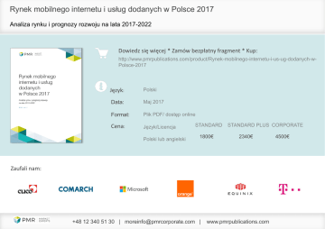 Rynek mobilnego internetu i usług dodanych w Polsce 2017 Analiza rynku i prognozy rozwoju na lata 2017-2022 Dowiedz się więcej * Zamów bezpłatny fragment * Kup: http://www.pmrpublications.com/product/Rynek-mobilnego-internetu-i-us-ug-dodanych-wPolsce-2017 Język: Polski Data: Maj 2017 Format: Plik PDF/ dostęp online Cena: Język/Licencja Polski lub angielski STANDARD 1800€ STANDARD PLUS CORPORATE 2340€ Zaufali nam: +48 12 340 51 30 | [email protected] | www.pmrpublications.com 4500€ Rynek mobilnego internetu i usług dodanych w Polsce 2017 Analiza rynku i prognozy rozwoju na lata 2017-2022 Jakie informacje zawiera ten raport? Kto m. in. skorzysta z tej analizy? Firmy działające na rynku telekomunikacyjnym w Polsce, a przede wszystkim rozwijające bądź chcące rozwijać usługi mobilnego internetu i usługi typu VAS Wartość i dynamika rynku mobilnego internetu Liczba abonentów mobilnego internetu w Polsce ogółem i w podziale na post-paid i pre-paid; penetracja usługami w telefonie i dedykowanymi kartami do transmisji danych; sprzedaż smartfonów Udziały ilościowe poszczególnych graczy w rynku mobilnego internetu w Polsce; liczba kart SIM w sieciach MVNO Identyfikacja najważniejszych trendów globalnych i porównanie rynku polskiego do innych krajów Operatorzy telekomunikacyjni Sieci telewizji kablowej i lokalni ISP Dostawcy sprzętu telekomunikacyjnego i sieciowego . Dlaczego warto kupić ten raport? Poziom cen mobilnego internetu i oferta operatorów Struktura rynku VAS według poszczególnych segmentów (mikropłatności, interaktywność w mediach, gry, aplikacje, muzyka, marketing mobilny) Prognozy rozwoju poszczególnych segmentów rynku VAS Udział poszczególnych dostawców w rynku numerów typu premium. Mobilny internet to jeden z nielicznych, nadal rosnących segmentów rynku telekomunikacyjnego w Polsce W ostatnich pięciu latach liczba abonentów mobilnego internetu korzystających z dedykowanych rozwiązań wzrosła o ok. 4 mln, podczas gdy w tym samym czasie wzrost liczby abonentów stacjonarnych usług dostępowych wyniósł ok. 1 mln Na wzrost popularności i znaczenia mobilnego internetu wpływa pozytywnie stale rosnąca penetracja smartfonów Inwestycje operatorów w rozwój sieci LTE +48 12 340 51 30 | [email protected] | www.pmrpublications.com