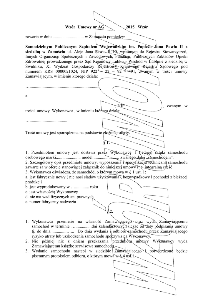Wzór Umowy nr AG. 2015 Wzór zawarta w dniu ............................. w Zamościu pomiędzy: Samodzielnym Publicznym Szpitalem Wojewódzkim im. Papieża Jana Pawła II z siedzibą w Zamościu ul. Aleje Jana Pawła II 10, wpisanym do Rejestru Stowarzyszeń, Innych Organizacji Społecznych i Zawodowych, Fundacji, Publicznych Zakładów Opieki Zdrowotnej prowadzonego przez Sąd Rejonowy Lublin - Wschód w Lublinie z siedzibą w Świdniku, XI Wydział Gospodarczy Rejestrowy Krajowego Rejestru Sądowego pod numerem KRS 0000021024, NIP 922 – 22 – 92 - 491, zwanym w treści umowy Zamawiającym, w imieniu którego działa: …................................................................. a ….............................................................................. , NIP.................................. , zwanym w treści umowy Wykonawca , w imieniu którego działa: …................................... Treść umowy jest sporządzona na podstawie złożonej oferty. § 1. 1. Przedmiotem umowy jest dostawa przez Wykonawcę 1 (jednej) sztuki samochodu osobowego marki....................... model........................, zwanego dalej „samochodem”. 2. Szczegółowy opis przedmiotu umowy, wyposażenia i specyfikacja techniczna samochodu zawarte są w ofercie stanowiącej załącznik do niniejszej umowy i jej integralną część 3. Wykonawca oświadcza, że samochód, o którym mowa w § 1 ust. 1: a. jest fabrycznie nowy ( nie nosi śladów użytkowania), bezwypadkowy i pochodzi z bieżącej produkcji b. jest wyprodukowany w …............. roku c. jest własnością Wykonawcy d. nie ma wad fizycznych ani prawnych e. numer fabryczny nadwozia § 2. 1. Wykonawca przeniesie na własność Zamawiającego oraz wyda Zamawiającemu samochód w terminie …...............dni kalendarzowych licząc od daty podpisania umowy tj. do dnia...............…... Do dnia wydania i odbioru samochodu przez Zamawiającego ryzyko utraty lub uszkodzenia samochodu spoczywa na Wykonawcy. 2. Nie później niż z dniem przekazania przedmiotu umowy Wykonawcy wyda Zamawiającemu książkę serwisową samochodu. 3. Wydanie samochodu nastąpi w siedzibie Zamawiającego i potwierdzone będzie pisemnym protokołem odbioru, o którym mowa w § 4 ust.1. § 3. 1. Płatność za wykonaną dostawę Zamawiający będzie regulował przelewem w ciągu 30 (trzydzieści) dni od daty otrzymania faktury VAT na konto Wykonawcy podane w fakturze (rachunku) w: ....................................................................................................................................................... 2. Jako datę zapłaty przyjmuje się datę złożenia w banku przez Zamawiającego dokumentu „polecenie przelewu” § 4. 1. Za termin wykonania umowy uważa się dzień podpisania przez obie strony bez zastrzeżeń protokołu odbioru samochodu. 2. Odbiór samochodu zostanie poprzedzony jego przetestowaniem oraz sprawdzeniem poprawności działania przy udziale przedstawiciela Wykonawcy i Zamawiającego. 3. W przypadku stwierdzenia podczas odbioru samochodu wad, Zamawiający nie dokona odbioru samochodu. 4. Dzień odbioru samochodu po usunięciu wad jest terminem wykonania umowy. 5. Wykonawca przyjmie pełną odpowiedzialność za transport samochodu do miejsca dostawy, jego uruchomienie i przetestowanie oraz ubezpieczenie od ryzyka utraty lub uszkodzenia. 6. Wykonawca zobowiązany jest dołączyć do samochodu komplet dokumentów: karta pojazdu, karta gwarancyjna, instrukcja obsługi w języku polskim oraz inne wymagane prawem dokumenty pojazdu (wyciąg ze świadectwa homologacji pojazdu, sporządzony w języku polskim, dokument potwierdzający spełnienie norm emisji spalin). §5 1. Za dostawę przedmiotu umowy stosowana będzie cena taka jak w złożonej ofercie cenowej Wykonawcy tj. określone poniżej lub w załączniku do niniejszej umowy …............................ Cenę netto (bez podatku VAT) za całość przedmiotu umowy ustala się w wysokości …...............................................................,zł słownie..................................................złotych …...............groszy. Cenę brutto ( z podatkiem VAT) za całość przedmiotu umowy ustala się w wysokości...................................zł, słownie................…........................................ złotych …....................groszy. 2. Cena brutto obejmuje w szczególności wartość samochodu, koszty transportu krajowego i zagranicznego, ubezpieczenie samochodu w kraju i zagranicą, oraz podatek VAT. §6 1. Za zwłokę Wykonawcy w wykonaniu przedmiotu umowy Zamawiającemu należą się od niego kary umowne w wysokości 0,2% całkowitej ceny (brutto), określonej w § 5 ust. 1 za każdy dzień zwłoki, ponad termin określony w § 2 ust. 1. 2. Za zwłokę w naprawie samochodu w okresie gwarancji Zamawiającemu należą się od Wykonawcy kary umowne w wysokości 0,2% całkowitej ceny (brutto) określonej w § 5 ust. 1 , za każdy dzień zwłoki w stosunku do terminu wynikającego z § 8 ust. 6. 3. W przypadku odstąpienia od umowy przez Zamawiającego lub Wykonawcę z przyczyn leżących po stronie Wykonawcy należy się Zamawiającemu od Wykonawcy kara umowna w wysokości 5% całkowitej ceny (brutto) określonej w § 5 ust. 1. 4. Odstąpienie od umowy przez Zamawiającego lub Wykonawcę nie powoduje wygaśnięcia obowiązku Wykonawcy zapłaty ewentualnych kar umownych powstałych i obliczonych zgodnie z regulacją ust. 1 lub 2. 5. Zamawiający zastrzega sobie prawo do odszkodowania uzupełniającego przenoszącego wysokość zastrzeżonych w niniejszej umowie kar umownych. §7 1. Zamawiający może odstąpić od umowy w przypadku niedotrzymania terminu dostawy przedmiotu umowy, tj. nie zachowania terminu, o którym mowa w § 2 ust.1 niniejszej umowy. 2. W razie niewłaściwego wykonania przedmiotu umowy stwierdzonego w protokole odbioru, Zamawiający zastrzega sobie prawo do odstąpienia od umowy