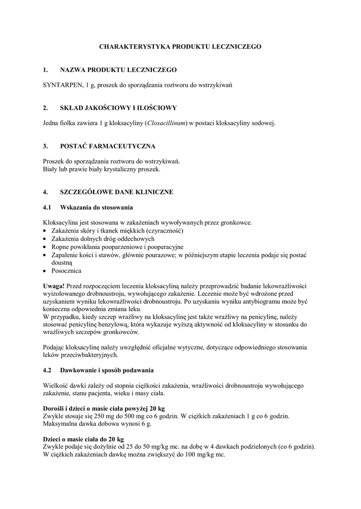 CHARAKTERYSTYKA PRODUKTU LECZNICZEGO 1. NAZWA PRODUKTU LECZNICZEGO SYNTARPEN, 1 g, proszek do sporządzania roztworu do wstrzykiwań 2. SKŁAD JAKOŚCIOWY I ILOŚCIOWY Jedna fiolka zawiera 1 g kloksacyliny (Cloxacillinum) w postaci kloksacyliny sodowej. 3. POSTAĆ FARMACEUTYCZNA Proszek do sporządzania roztworu do wstrzykiwań. Biały lub prawie biały krystaliczny proszek. 4. SZCZEGÓŁOWE DANE KLINICZNE 4.1 Wskazania do stosowania Kloksacylina jest stosowana w zakażeniach wywoływanych przez gronkowce. Zakażenia skóry i tkanek miękkich (czyraczność) Zakażenia dolnych dróg oddechowych Ropne powikłania pooparzeniowe i pooperacyjne Zapalenie kości i stawów, głównie pourazowe; w późniejszym etapie leczenia podaje się postać doustną Posocznica Uwaga! Przed rozpoczęciem leczenia kloksacyliną należy przeprowadzić badanie lekowrażliwości wyizolowanego drobnoustroju, wywołującego zakażenie. Leczenie może być wdrożone przed uzyskaniem wyniku lekowrażliwości drobnoustroju. Po uzyskaniu wyniku antybiogramu może być konieczna odpowiednia zmiana leku. W przypadku, kiedy szczep wrażliwy na kloksacylinę jest także wrażliwy na penicylinę, należy stosować penicylinę benzylową, która wykazuje wyższą aktywność od kloksacyliny w stosunku do wrażliwych szczepów gronkowców. Podając kloksacylinę należy uwzględnić oficjalne wytyczne, dotyczące odpowiedniego stosowania leków przeciwbakteryjnych. 4.2 Dawkowanie i sposób podawania Wielkość dawki zależy od stopnia ciężkości zakażenia, wrażliwości drobnoustroju wywołującego zakażenie, stanu pacjenta, wieku i masy ciała. Dorośli i dzieci o masie ciała powyżej 20 kg Zwykle stosuje się 250 mg do 500 mg co 6 godzin. W ciężkich zakażeniach 1 g co 6 godzin. Maksymalna dawka dobowa wynosi 6 g. Dzieci o masie ciała do 20 kg Zwykle podaje się dożylnie od 25 do 50 mg/kg mc. na dobę w 4 dawkach podzielonych (co 6 godzin). W ciężkich zakażeniach dawkę można zwiększyć do 100 mg/kg mc. Dawkowanie u pacjentów z niewydolnością nerek Należy zachować ostrożność stosując antybiotyk u pacjentów z niewydolnością nerek. Może być konieczne zmniejszenie dawki leku lub wydłużenie odstępu pomiędzy kolejnymi dawkami. Czas leczenia Czas leczenia zależy od ciężkości i rodzaju zakażenia. Antybiotyk należy podawać jeszcze przez 2 do 4 dni po ustąpieniu objawów. Sposób podawania Kloksacylinę można podawać we wstrzyknięciach domięśniowych lub dożylnych, w infuzji dożylnej lub w postaci wstrzyknięć do jamy opłucnej. Roztwory należy przygotowywać tuż przed podaniem. Sposób przygotowania roztworów, patrz punkt 6.6. 4.3 Przeciwwskazania Nadwrażliwość na antybiotyki beta-laktamowe. 4.4 Specjalne ostrzeżenia i środki ostrożności dotyczące stosowania Przed podaniem kloksacyliny należy przeprowadzić dokładny wywiad z pacjentem odnośnie występowania w przeszłości nadwrażliwości na penicyliny, cefalosporyny lub inne leki. Bardzo rzadko w czasie leczenia kloksacyliną mogą wystąpić ciężkie objawy nadwrażliwości w postaci reakcji anafilaktycznej. Większe prawdopodobieństwo takiej reakcji występuje po podaniu antybiotyku drogą parenteralną. Prawdopodobieństwo reakcji nadwrażliwości jest większe u osób ze skłonnością do reakcji alergicznych na wiele różnych substancji. Reakcje takie opisywano u osób z alergią na penicylinę. Jeśli wystąpi wstrząs anafilaktyczny lub obrzęk naczynioruchowy, w pierwszej kolejności należy podać adrenalinę, następnie lek przeciwhistaminowy, a jako ostatni - kortykosteroid. Należy również monitorować podstawowe czynności życiowe (oddech, tętno, ciśnienie tętnicze krwi). W trakcie długotrwałego stosowania kloksacyliny należy okresowo kontrolować czynność nerek, wątroby oraz morfologię krwi obwodowej. Przedłużone stosowanie kloksacyliny, może sporadycznie powodować nadmierny wzrost opornych bakterii lub drożdżaków. Należy uważnie obserwować, czy u pacjenta nie występują objawy nadkażenia. Jeśli wystąpi ciężka, uporczywa biegunka, należy wziąć pod uwagę możliwość rzekomobłoniastego zapalenia okrężnicy (w większości przypadków wywołanego przez Clostridium difficile). W takim przypadku należy przerwać stosowanie kloksacyliny i rozpocząć odpowiednie leczenie. Podawanie środków hamujących perystaltykę jest przeciwwskazane. 4.5 Interakcje z innymi lekami i inne rodzaje interakcji Pacjenci uczuleni na cefalosporyny mogą wykazywać nadwrażliwość również na kloksacylinę (tak zwana krzyżowa alergia). Probenecyd zwiększa stężenie kloksacyliny w surowicy oraz wydłuża jej okres półtrwania. Leki przeciwzakrzepowe: kloksacylina nasila działanie doustnych leków przeciwzakrzepowych. Metotreksat: kloksacylina może powodować zwolnienie eliminacji metotreksatu przez kanaliki nerkowe, co prowadzi do wzrostu toksyczności metotreksatu. 2 Doustne środki antykoncepcyjne: kloksacylina może zmniejszać skuteczność doustnych hormonalnych środków antykoncepcyjnych zawierających estrogeny. Zaleca się stosowanie dodatkowo niehormonalnych metod antykoncepcji u pacjentek otrzymujących ten antybiotyk. Ampicylina i kwasem fusydynowy: kloksacylina wykazuje synergizm z ampicyliną i kwasem fusydynowym. Erytromycyna, tetracykliny, chloramfenikol wraz z kloksacyliną działają antagonistycznie. Stosowanie kloksacyliny wpływa na wyniki oznaczeń 17-oksosteroidów i oksogennych steroidów w moczu oraz może powodować fałszywie dodatnie wyniki oznaczania glukozy w moczu metodami redukcyjnymi. 4.6 Wpływ na płodność, ciążę i laktację Ciąża Ponieważ brak jest odpowiednio liczebnych, dobrze kontrolowanych badań u kobiet ciężarnych, oraz ponieważ wyniki badań nad rozmnażaniem u zwierząt nie zawsze w pełni odzwierciedlają działanie leku na płód u ludzi, kloksacylinę można podawać kobietom w ciąży jedynie w przypadku zdecydowanej koniecz