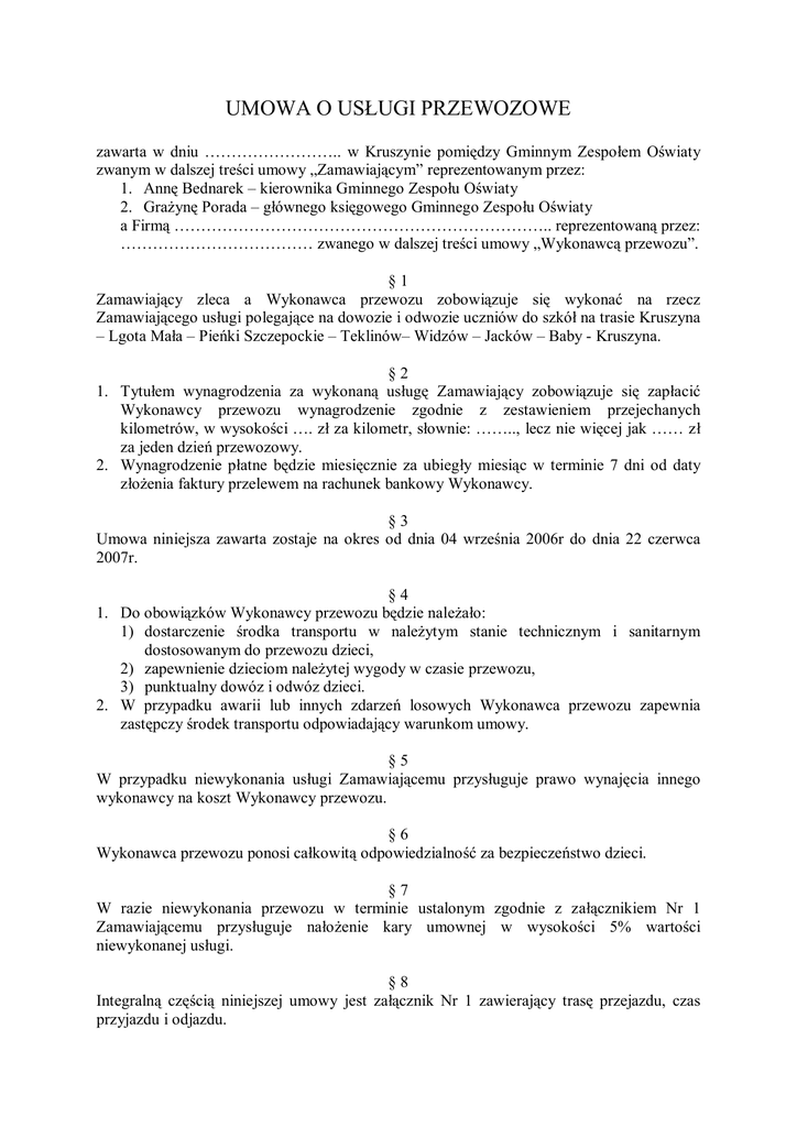 UMOWA O USŁUGI PRZEWOZOWE zawarta w dniu …………………….. w Kruszynie pomiędzy Gminnym Zespołem Oświaty zwanym w dalszej treści umowy „Zamawiającym” reprezentowanym przez: 1. Annę Bednarek – kierownika Gminnego Zespołu Oświaty 2. Grażynę Porada – głównego księgowego Gminnego Zespołu Oświaty a Firmą …………………………………………………………….. reprezentowaną przez: ……………………………… zwanego w dalszej treści umowy „Wykonawcą przewozu”. §1 Zamawiający zleca a Wykonawca przewozu zobowiązuje się wykonać na rzecz Zamawiającego usługi polegające na dowozie i odwozie uczniów do szkół na trasie Kruszyna – Lgota Mała – Pieńki Szczepockie – Teklinów– Widzów – Jacków – Baby - Kruszyna. §2 1. Tytułem wynagrodzenia za wykonaną usługę Zamawiający zobowiązuje się zapłacić Wykonawcy przewozu wynagrodzenie zgodnie z zestawieniem przejechanych kilometrów, w wysokości …. zł za kilometr, słownie: …….., lecz nie więcej jak …… zł za jeden dzień przewozowy. 2. Wynagrodzenie płatne będzie miesięcznie za ubiegły miesiąc w terminie 7 dni od daty złożenia faktury przelewem na rachunek bankowy Wykonawcy. §3 Umowa niniejsza zawarta zostaje na okres od dnia 04 września 2006r do dnia 22 czerwca 2007r. §4 1. Do obowiązków Wykonawcy przewozu będzie należało: 1) dostarczenie środka transportu w należytym stanie technicznym i sanitarnym dostosowanym do przewozu dzieci, 2) zapewnienie dzieciom należytej wygody w czasie przewozu, 3) punktualny dowóz i odwóz dzieci. 2. W przypadku awarii lub innych zdarzeń losowych Wykonawca przewozu zapewnia zastępczy środek transportu odpowiadający warunkom umowy. §5 W przypadku niewykonania usługi Zamawiającemu przysługuje prawo wynajęcia innego wykonawcy na koszt Wykonawcy przewozu. §6 Wykonawca przewozu ponosi całkowitą odpowiedzialność za bezpieczeństwo dzieci. §7 W razie niewykonania przewozu w terminie ustalonym zgodnie z załącznikiem Nr 1 Zamawiającemu przysługuje nałożenie kary umownej w wysokości 5% wartości niewykonanej usługi. §8 Integralną częścią niniejszej umowy jest załącznik Nr 1 zawierający trasę przejazdu, czas przyjazdu i odjazdu. -2- §9 Wszelkie zmiany niniejszej umowy wymagają dla swej ważności zachowania formy pisemnej. § 10 W sprawach nieuregulowanych postanowieniami niniejszej umowy będą miały zastosowanie przepisy Kodeksu cywilnego. § 11 Spory mogące wyniknąć z realizacji postanowień niniejszej umowy strony poddają pod rozstrzygnięcie właściwego miejscowo sądu. § 12 Umowę sporządzono w dwóch jednobrzmiących egzemplarzach, po jednym dla każdej ze stron. Zamawiający: Wykonawca przewozu: