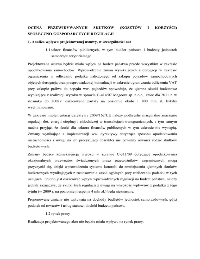 OCENA PRZEWIDYWANYCH SKUTKÓW (KOSZTÓW I KORZYŚCI) SPOŁECZNO-GOSPODARCZYCH REGULACJI 1. Analiza wpływu projektowanej ustawy, w szczególności na: 1.1 sektor finansów publicznych, w tym budŜet państwa i budŜety jednostek samorządu terytorialnego Projektowana ustawa będzie miała wpływ na budŜet państwa przede wszystkim w zakresie opodatkowania samochodów. Wprowadzenie zmian wynikających z derogacji w zakresie ograniczenia w odliczaniu podatku naliczonego od zakupu pojazdów samochodowych objętych derogacją oraz przeprowadzonej konsultacji w zakresie ograniczania odliczenia VAT przy zakupie paliwa do napędu ww. pojazdów spowoduje, Ŝe ujemne skutki budŜetowe wynikające z realizacji wyroku w sprawie C-414/07 Magoora sp. z o.o., które dla 2011 r. w stosunku do 2008 r. oszacowane zostały na poziomie około 1 800 mln zł, byłyby wyeliminowane. W zakresie implementacji dyrektywy 2009/162/UE naleŜy podkreślić marginalne znaczenie regulacji dot. energii cieplnej i chłodniczej w transakcjach transgranicznych, a tym samym moŜna przyjąć, Ŝe skutki dla sektora finansów publicznych w tym zakresie nie wystąpią. Zmiany wynikające z implementacji ww. dyrektywy dotyczące sposobu opodatkowania nieruchomości z uwagi na ich precyzujący charakter nie powinny równieŜ rodzić skutków budŜetowych. Zmiany będące konsekwencją wyroku w sprawie C-311/09 dotyczące opodatkowania okazjonalnych przewozów świadczonych przez przewoźników zagranicznych mogą przyczynić się, dzięki wprowadzeniu systemu kontroli, do zmniejszenia ujemnych skutków budŜetowych wynikających z zastosowania zasad ogólnych przy rozliczaniu podatku w tych usługach. Trudno jest oszacować wpływ wprowadzanych regulacji na budŜet państwa, naleŜy jednak zaznaczyć, Ŝe skutki tych regulacji z uwagi na wysokość wpływów z podatku z tego tytułu (w 2009 r. na poziomie niespełna 4 mln zł.) będą nieznaczne. Proponowane zmiany nie wpływają na dochody budŜetów jednostek samorządowych, gdyŜ podatek od towarów i usług stanowi dochód budŜetu państwa. 1.2 rynek pracy Realizacja projektowanego aktu nie będzie miała wpływu na rynek pracy. 1.3 konkurencyjność gospodarki i przedsiębiorczość, w tym na funkcjonowanie przedsiębiorstw Z uwagi na przede wszystkim doprecyzowujący charakter zmian przepisów ustawy nie przewiduje się wpływu projektu na konkurencyjność gospodarki i przedsiębiorczość, w tym na funkcjonowanie przedsiębiorstw, z wyjątkiem przepisów w zakresie opodatkowania samochodów. Przewiduje się, iŜ proponowane rozwiązania w zakresie samochodów mogą wpływać na konkurencyjność gospodarki i przedsiębiorczość. Charakter proponowanych zmian dotyczących wprowadzenia ograniczenia w zakresie odliczania podatku naliczonego od zakupu pojazdów samochodowych oraz paliwa do ich napędu moŜe wpływać na funkcjonowanie przedsiębiorstw, gdyŜ bez niej moŜe dojść do zakłóceń na rynku sprzedaŜy nowych samochodów z uwagi na niepoŜądane zróŜnicowanie pod względem podatkowym samochodów. Trudno jest natomiast określić wpływ proponowanej regulacji na krajowy rynek motoryzacyjny, tj. ewentualne zmniejszenie liczby kupowanych samochodów objętych obecnie preferencjami podatkowymi, bowiem na wszelkie decyzje dotyczące prowadzonej działalności gospodarczej ewentualnych nabywców samochodów wpływ ma równieŜ szereg, innych niŜ moŜliwość pełnego odliczania podatku VAT, czynników, takich jak aktualne potrzeby przedsiębiorcy, koniunktura na rynku, moŜliwości rozwoju itp. Ponadto, wprowadzenie ograniczenia odliczania podatku VAT zwiększy koszty prowadzenia działalności przedsiębiorstw, które posiadają samochody z „kratką”. Zrównana zostanie ich sytuacja na rynku z przedsiębiorstwami posiadającymi samochody osobowe. Wprowadzenie zmian w zakresie prawa do odliczenia podatku naliczonego od zakupu pojazdów samochodowych oraz paliwa do ich napędu moŜe wpłynąć na wzrost zainteresowania w przed wejściem w Ŝycie projektowanych zmian kupnem samochodów dla których zgodnie z projektem wprowadza się ograniczenia od 1 stycznia 2011 r. Biorąc pod uwagę, Ŝe obecnie w ustawie o podatku od towarów i usług obowiązuje szeroka, obejmująca zarówno sieć dystrybucyjną jak i przesyłową, definicja systemu gazowego i elektrycznego oraz uwzględniając marginalne znaczenie regulacji dot. energii cieplnej i chłodniczej w transakcjach transgranicznych i precyzujący charakter zmian związanych z nieruchomościami, implementacja dyrektywy 2009/162/UE będzie miała ograniczony wpływ na konkurencyjność gospodarki i przedsiębiorczość, w tym na funkcjonowanie przedsiębiorstw. Podobnie, zmiany dotyczące opodatkowania okazjonalnych przewozów świadczonych przez przewoźników zagranicznych nie powinny spowodować skutków mających istotny wpływ na funkcjonowanie przedsiębiorstw świadczących takie przewozy, gdyŜ mają one przede wszystkim dyscyplinować zainteresowane przedsiębiorstwa przewozowe do prawidłowego wywiązywania się z obowiązków podatkowych. 1.4 sytuację i rozwój regionalny Projektowana ustawa nie wpłynie na zmianę sytuacji i rozwój regionów. 2. Wyniki przeprowadzonych konsultacji Projekt załoŜeń do przedmiotowego projektu został równolegle z uzgodnieniami zewnętrznymi został poddany konsultacjom społecznym. Uwagi do projektu zgłosiły następujące organizacje: Polski Związek Przemysłu Motoryzacyjnego, Krajowa Rada Doradców Podatkowych, Pracodawcy RP, Związek Dealerów Samochodowych, Związek Rzemiosła Polskiego, Izba Gospodarcza Gazownictwa. Większość uwag dotyczyła zaniechania wprowadzenia przepisów ograniczających moŜliwość odliczania podatku VAT od samochodów uŜywanych w działalności gospodarczej. Ponadto zgłoszono propozycję objęcia pełnym prawem do odliczania podatku naliczonego samochodów osobowych (w stosunku do których obecnie funkcjonują ograniczenia w o