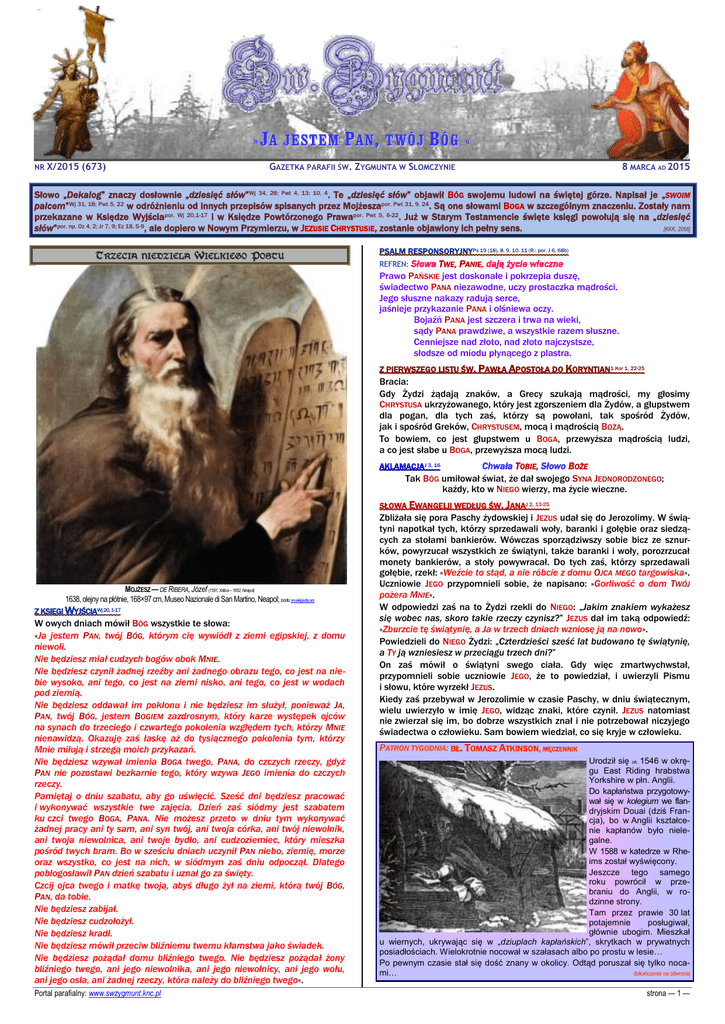 » NR X/2015 (673) JA JESTEM PAN, TWÓJ BÓG « … GAZETKA PARAFII ŚW. ZYGMUNTA W SŁOMCZYNIE 8 MARCA AD 2015 Słowo „Dekalog” znaczy dosłownie „dziesięć słów”Wj 34, 28; Pwt 4, 13; 10, 4. Te „dziesięć słów” objawił BÓG swojemu ludowi na świętej górze. Napisał je „SWOIM palcem”Wj 31, 18; Pwt 5, 22 w odróżnieniu od innych przepisów spisanych przez Mojżeszapor. Pwt 31, 9. 24. Są one słowami BOGA w szczególnym znaczeniu. Zostały nam przekazane w Księdze Wyjściapor. Wj 20,1-17 i w Księdze Powtórzonego Prawapor. Pwt 5, 6-22. Już w Starym Testamencie święte księgi powołują się na „dziesięć słów”por. np. Oz 4, 2; Jr 7, 9; Ez 18, 5-9, ale dopiero w Nowym Przymierzu, w JEZUSIE CHRYSTUSIE, zostanie objawiony ich pełny sens. [KKK, 2056] TRZECIA NIEDZIELA WIELKIEGO POSTU PSALM RESPONSORYJNYPs 19 (18), 8. 9. 10. 11 (R.: por. J 6, 68b) Słowa TWE, PANIE, dają życie wieczne Prawo PAŃSKIE jest doskonałe i pokrzepia duszę, świadectwo PANA niezawodne, uczy prostaczka mądrości. Jego słuszne nakazy radują serce, jaśnieje przykazanie PANA i olśniewa oczy. Bojaźń PANA jest szczera i trwa na wieki, sądy PANA prawdziwe, a wszystkie razem słuszne. Cenniejsze nad złoto, nad złoto najczystsze, słodsze od miodu płynącego z plastra. REFREN: Z PIERWSZEGO LISTU ŚW. PAWŁA APOSTOŁA DO KORYNTIAN1 Kor 1, 22-25 Bracia: Gdy Żydzi żądają znaków, a Grecy szukają mądrości, my głosimy CHRYSTUSA ukrzyżowanego, który jest zgorszeniem dla Żydów, a głupstwem dla pogan, dla tych zaś, którzy są powołani, tak spośród Żydów, jak i spośród Greków, CHRYSTUSEM, mocą i mądrością BOŻĄ. To bowiem, co jest głupstwem u BOGA, przewyższa mądrością ludzi, a co jest słabe u BOGA, przewyższa mocą ludzi. Chwała TOBIE, Słowo BOŻE Tak BÓG umiłował świat, że dał swojego SYNA JEDNORODZONEGO; każdy, kto w NIEGO wierzy, ma życie wieczne. AKLAMACJAJ 3, 16 SŁOWA EWANGELII WEDŁUG ŚW. JANAJ 2, 13-25 MOJŻESZ — DE RIBERA, Józef (1591, Xàtiva – 1652, Neapol) 1638, olejny na płótnie, 168×97 cm, Museo Nazionale di San Martino, Neapol; źródło: en.wikipedia.org Z KSIĘGI WYJŚCIAWj 20, 1-17 W owych dniach mówił BÓG wszystkie te słowa: »Ja jestem PAN, twój BÓG, którym cię wywiódł z ziemi egipskiej, z domu niewoli. Nie będziesz miał cudzych bogów obok MNIE. Nie będziesz czynił żadnej rzeźby ani żadnego obrazu tego, co jest na niebie wysoko, ani tego, co jest na ziemi nisko, ani tego, co jest w wodach pod ziemią. Nie będziesz oddawał im pokłonu i nie będziesz im służył, ponieważ JA, PAN, twój BÓG, jestem BOGIEM zazdrosnym, który karze występek ojców na synach do trzeciego i czwartego pokolenia względem tych, którzy MNIE nienawidzą. Okazuję zaś łaskę aż do tysiącznego pokolenia tym, którzy Mnie miłują i strzegą moich przykazań. Nie będziesz wzywał imienia BOGA twego, PANA, do czczych rzeczy, gdyż PAN nie pozostawi bezkarnie tego, który wzywa JEGO imienia do czczych rzeczy. Pamiętaj o dniu szabatu, aby go uświęcić. Sześć dni będziesz pracować i wykonywać wszystkie twe zajęcia. Dzień zaś siódmy jest szabatem ku czci twego BOGA, PANA. Nie możesz przeto w dniu tym wykonywać żadnej pracy ani ty sam, ani syn twój, ani twoja córka, ani twój niewolnik, ani twoja niewolnica, ani twoje bydło, ani cudzoziemiec, który mieszka pośród twych bram. Bo w sześciu dniach uczynił PAN niebo, ziemię, morze oraz wszystko, co jest na nich, w siódmym zaś dniu odpoczął. Dlatego pobłogosławił PAN dzień szabatu i uznał go za święty. Czcij ojca twego i matkę twoją, abyś długo żył na ziemi, którą twój BÓG, PAN, da tobie. Nie będziesz zabijał. Nie będziesz cudzołożył. Nie będziesz kradł. Nie będziesz mówił przeciw bliźniemu twemu kłamstwa jako świadek. Nie będziesz pożądał domu bliźniego twego. Nie będziesz pożądał żony bliźniego twego, ani jego niewolnika, ani jego niewolnicy, ani jego wołu, ani jego osła, ani żadnej rzeczy, która należy do bliźniego twego«. Portal parafialny: www.swzygmunt.knc.pl Zbliżała się pora Paschy żydowskiej i JEZUS udał się do Jerozolimy. W świątyni napotkał tych, którzy sprzedawali woły, baranki i gołębie oraz siedzących za stołami bankierów. Wówczas sporządziwszy sobie bicz ze sznurków, powyrzucał wszystkich ze świątyni, także baranki i woły, porozrzucał monety bankierów, a stoły powywracał. Do tych zaś, którzy sprzedawali gołębie, rzekł: »Weźcie to stąd, a nie róbcie z domu OJCA MEGO targowiska«. Uczniowie JEGO przypomnieli sobie, że napisano: »Gorliwość o dom TWÓJ pożera MNIE«. W odpowiedzi zaś na to Żydzi rzekli do NIEGO: „Jakim znakiem wykażesz się wobec nas, skoro takie rzeczy czynisz?” JEZUS dał im taką odpowiedź: »Zburzcie tę świątynię, a Ja w trzech dniach wzniosę ją na nowo«. Powiedzieli do NIEGO Żydzi: „Czterdzieści sześć lat budowano tę świątynię, a TY ją wzniesiesz w przeciągu trzech dni?” On zaś mówił o świątyni swego ciała. Gdy więc zmartwychwstał, przypomnieli sobie uczniowie JEGO, że to powiedział, i uwierzyli Pismu i słowu, które wyrzekł JEZUS. Kiedy zaś przebywał w Jerozolimie w czasie Paschy, w dniu świątecznym, wielu uwierzyło w imię JEGO, widząc znaki, które czynił. JEZUS natomiast nie zwierzał się im, bo dobrze wszystkich znał i nie potrzebował niczyjego świadectwa o człowieku. Sam bowiem wiedział, co się kryje w człowieku. PATRON TYGODNIA: BŁ. TOMASZ ATKINSON, MĘCZENNIK Urodził się ok. 1546 w okręgu East Riding hrabstwa Yorkshire w płn. Anglii. Do kapłaństwa przygotowywał się w kolegium we flandryjskim Douai (dziś Francja), bo w Anglii kształcenie kapłanów było nielegalne. W 1588 w katedrze w Rheims został wyświęcony. Jeszcze tego samego roku powrócił w przebraniu do Anglii, w rodzinne strony. Tam przez prawie 30 lat potajemnie posługiwał, głów