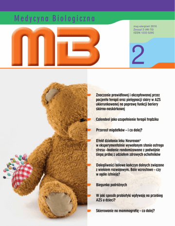 Medycyna Biologiczna maj-sierpień 2016 Zeszyt 2 (46-70) ISSN 1232-5295 2 Znaczenie prawidłowej i akceptowanej przez pacjenta terapii oraz pielęgnacji skóry w AZS ukierunkowanej na poprawę funkcji bariery skórno-naskórkowej Calendeel jako uzupełnienie terapii trądziku Przerost migdałków – i co dalej? Efekt działania leku Neurexan® w eksperymentalnie wywołanym stanie ostrego stresu –badanie randomizowane z podwójnie ślepą próbą z udziałem zdrowych ochotników Dolegliwości bólowe kończyn dolnych związane z wiekiem rozwojowym. Bóle wzrostowe – czy w ogóle istnieją? Biegunka podróżnych W jaki sposób probiotyki wpływają na przebieg AZS u dzieci? Skierowanie na mammografię – co dalej? Nagroda H.-H. Reckeweg’a 2016 Hans-Heinrich Reckeweg Clinical Case Award 2016 Najciekawsze Przypadki Kliniczne Warunki udziału 1 Informacje wstępne Dzięki ustanowieniu tej nagrody Biologische Heilmittel Heel GmbH wspiera rozwój medycyny bioregulacyjnej. 2 Nagroda Nagroda H.-H.Reckewega 2016 – Najciekawsze Przypadki Kliniczne – jest przeznaczona dla wybitnie interesującego przypadku klinicznego w dziedzinie medycyny bioregulacyjnej. Nagroda ta była wcześniej przyznawana za badania naukowe. Nagroda jest sponsorowana przez Biologische Heilmittel Heel GmbH i przyznawana pod auspicjami międzynarodowego panelu ekspertów. Hans-Heinrich Reckeweg Clinical Case Award 2016 – Najciekawsze Przypadki Kliniczne – to nagroda pieniężna w wysokości 10.000 € za pierwszą lokatę oraz nagrody w wysokości 5000 € za kolejną lokatę. 3 Kryteria przyznawania nagrody Nagroda przyznawana jest w oparciu o następujące kryteria: 1. Kliniczne raportowanie zgodne z międzynarodowymi wytycznymi sprawozdawczości CARE CASE (care-statement.org) sprawia, że opisany przypadek kliniczny kwalifikuje się do publikacji naukowej w recenzowanym czasopiśmie. 2. Opis przypadku klinicznego szczegółowo analizuje ocenę bieżącego stanu zdrowia pacjenta oraz uzasadnienie stosowania medycyny bioregulacyjnej. 3. Opis przypadku klinicznego powinien tłumaczyć, w jaki sposób spostrzeżenia zawarte w prezentowanym przypadku mogą przyczynić się do wzbogacenia istniejącej bazy dowodowej w dziedzinie medycyny bioregulacyjnej. 4 Kto może aplikować? Aplikacja jest dostępna dla wszystkich licencjonowanych pracowników służby zdrowia na całym świecie (dla lekarzy medycyny i dla weterynarzy). Dyrektorzy, kierownicy i wszyscy inni pracownicy Biologische Heilmittel Heel GmbH nie są uprawnieni do uczestnictwa. 5 Składanie aplikacji W aplikacji należy wypełnić załączony formularz zgłoszeniowy, zarówno na dysku twardym, jak i w formie elektronicznej (np. na płycie CD lub przenośnym urządzeniu typu pendrive). Formularz zgłoszeniowy należy wypełnić w języku angielskim. Każdy wniosek musi zawierać podpisanie Deklaracji Zgody Opisu Przypadku Klinicznego oraz formularz świadomej zgody pacjenta. 6 Kryteria oceny aplikacji Każda złożona aplikacja będzie wstępnie oceniana pod kątem zgodności z kryteriami akceptacji przed wysłaniem jej do członków międzynarodowego komitetu. Tylko te aplikacje, które: a) są kompletne (wszystkie sekcje są wypełnione), b) nie budzą podejrzeń etycznych (formularz świadomej zgody pacjenta jest podpisany i dołączony), c) zawierają kompletne informacje na temat autora, będą brane pod uwagę w procesie oceny. Autorzy zostaną powiadomieni w osobnym e-mailu, czy ich zgłoszenie zostało przyjęte, czy też nie. 7 Termin zgłoszeń Termin składania aplikacji przypada na 29 lipca 2016 roku. Praca winna zostać złożona przed upływem terminu na adres mailowy [email protected]. oraz na adres korespondencyjny: Dr. Konstantin Cesnulevicius Department of Medicine Biologische Heilmittel Heel GmbH Dr.–Reckeweg-Str. 2-4 76532 Baden-Baden Germany Liczy się data nadania. Prace, złożone po tym terminie, zostaną odesłane do autora i mogą być złożone ponownie w następnym roku, w kolejnej edycji nagrody. 8 Komitet Kontroli Nagrody Nadesłane prace są oceniane przez międzynarodowy panel ekspertów zgodnie z kryteriami nagrody (patrz punkt §3). Po zamknięciu okresu nadsyłania prac, Komitet Kontroli Nagrody sporządzi krótką listę potencjalnych zwycięzców i podejmie finalną decyzję do października 2016 r. Spis treści Ciekawe przypadki kliniczne Znaczenie prawidłowej i akceptowanej przez pacjenta terapii oraz pielęgnacji skóry w AZS ukierunkowanej na poprawę funkcji bariery skórno-naskórkowej 46 Dr n. med. Barbara Sieradzka, Warszawski Uniwersytet Medyczny, Zakład Profilaktyki Zagrożeń Środowiskowych i Alergologii Obserwacje własne Calendeel jako uzupełnienie terapii trądziku Dr n. med. Dorota Nowicka, Klinika Dermatologii Uniwersytetu Warszawskiego, Szpital Kliniczny Dzieciątka Jezus 56 Repetitio mater studiorum est Przerost migdałków – i co dalej? 59 Opracowano przez lek. med. Anita Bania na podstawie: prof. dr hab. n. med. Danuta Gryczyńska, Migdałki – odwieczny dylemat laryngologów i pediatrów; MB 2/2013 Co nowego w badaniach klinicznych Efekt działania leku Neurexan® w eksperymentalnie wywołanym stanie ostrego stresu – badanie randomizowane z podwójnie ślepą próbą z udziałem zdrowych ochotników 64 Opracowano przez lek. med. Anita Bania na podstawie: B.K. Doering i wsp., Life Sci 2016 Feb 1; 146: 139-47, doi: 10.1016/j.lfs.2015.12.058, Epub 2016 Jan 7 Schorzenia narządu ruchu Dolegliwości bólowe kończyn dolnych związane z wiekiem rozwojowym. Bóle wzrostowe – czy w ogóle istnieją? 66 Dr n. med. Hanna Kocoń, Centrum Medycyny Sportowej w Warszawie Doniesienia naukowe Biegunka podróżnych 68 Opracowano przez lek. med. Anita Bania na podstawie: R. Steffen i wsp., Traveler’s Diarrhea A Clinical Review, JAMA 2015; 313: 71 W jaki sposób probiotyki wpływają na przebieg AZS u dzieci? 69 Opracowano przez lek. med. Anita Bania na podstawie: I. Wang i wsp., Children with atopic d