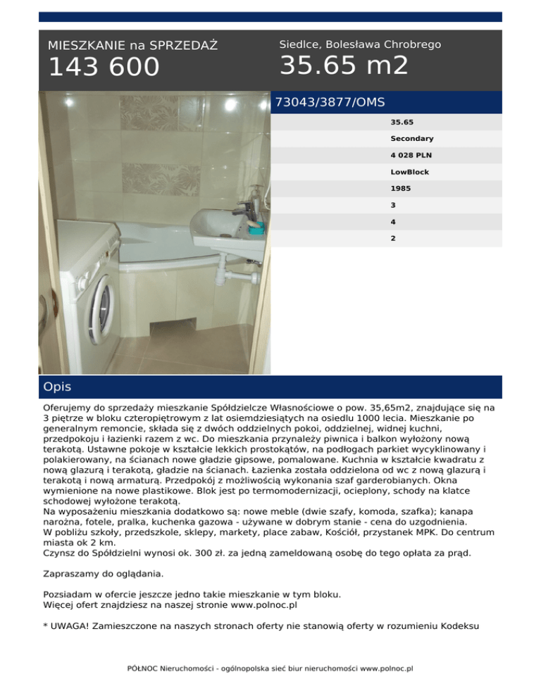 MIESZKANIE na SPRZEDAŻ 143 600 Siedlce, Bolesława Chrobrego 35.65 m2 73043/3877/OMS 35.65 Secondary 4 028 PLN LowBlock 1985 3 4 2 Opis Oferujemy do sprzedaży mieszkanie Spółdzielcze Własnościowe o pow. 35,65m2, znajdujące się na 3 piętrze w bloku czteropiętrowym z lat osiemdziesiątych na osiedlu 1000 lecia. Mieszkanie po generalnym remoncie, składa się z dwóch oddzielnych pokoi, oddzielnej, widnej kuchni, przedpokoju i łazienki razem z wc. Do mieszkania przynależy piwnica i balkon wyłożony nową terakotą. Ustawne pokoje w kształcie lekkich prostokątów, na podłogach parkiet wycyklinowany i polakierowany, na ścianach nowe gładzie gipsowe, pomalowane. Kuchnia w kształcie kwadratu z nową glazurą i terakotą, gładzie na ścianach. Łazienka została oddzielona od wc z nową glazurą i terakotą i nową armaturą. Przedpokój z możliwością wykonania szaf garderobianych. Okna wymienione na nowe plastikowe. Blok jest po termomodernizacji, ocieplony, schody na klatce schodowej wyłożone terakotą. Na wyposażeniu mieszkania dodatkowo są: nowe meble (dwie szafy, komoda, szafka); kanapa narożna, fotele, pralka, kuchenka gazowa - używane w dobrym stanie - cena do uzgodnienia. W pobliżu szkoły, przedszkole, sklepy, markety, place zabaw, Kościół, przystanek MPK. Do centrum miasta ok 2 km. Czynsz do Spółdzielni wynosi ok. 300 zł. za jedną zameldowaną osobę do tego opłata za prąd. Zapraszamy do oglądania. Pozsiadam w ofercie jeszcze jedno takie mieszkanie w tym bloku. Więcej ofert znajdziesz na naszej stronie www.polnoc.pl * UWAGA! Zamieszczone na naszych stronach oferty nie stanowią oferty w rozumieniu Kodeksu PÓŁNOC Nieruchomości - ogólnopolska sieć biur nieruchomości www.polnoc.pl Cywilnego, a dane w nich zawarte mają jedynie charakter informacyjny. Katarzyna Kucharek tel. 531-707-096 email: [email protected] PÓŁNOC Nieruchomości - ogólnopolska sieć biur nieruchomości www.polnoc.pl Powered by TCPDF (www.tcpdf.org)