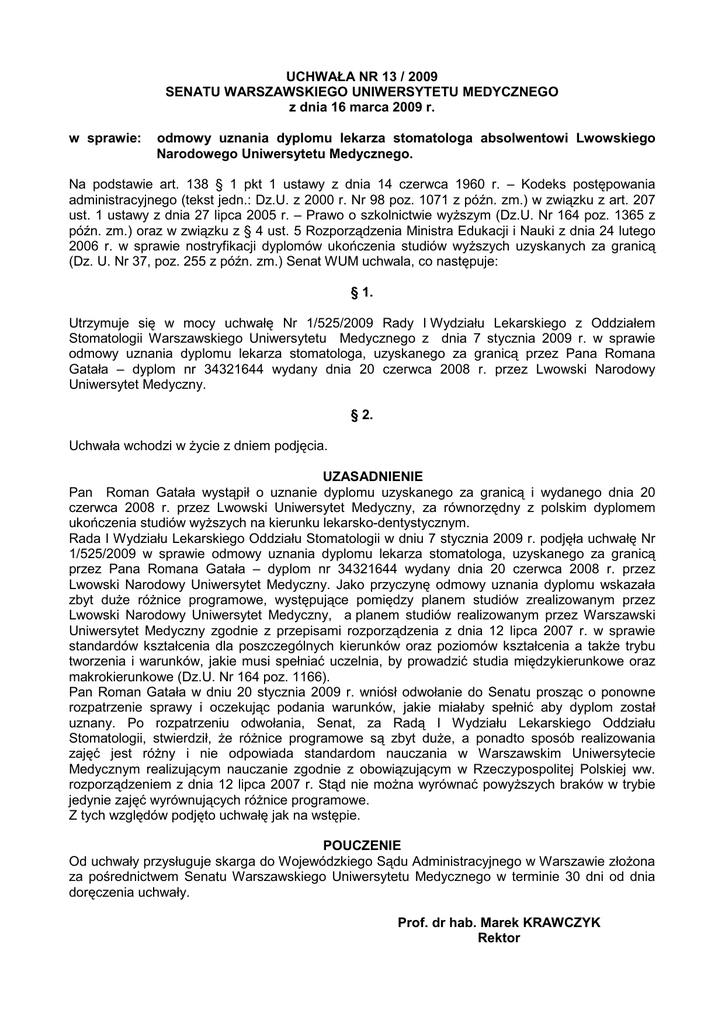 UCHWAŁA NR 13 / 2009 SENATU WARSZAWSKIEGO UNIWERSYTETU MEDYCZNEGO z dnia 16 marca 2009 r. w sprawie: odmowy uznania dyplomu lekarza stomatologa absolwentowi Lwowskiego Narodowego Uniwersytetu Medycznego. Na podstawie art. 138 § 1 pkt 1 ustawy z dnia 14 czerwca 1960 r. – Kodeks postępowania administracyjnego (tekst jedn.: Dz.U. z 2000 r. Nr 98 poz. 1071 z późn. zm.) w związku z art. 207 ust. 1 ustawy z dnia 27 lipca 2005 r. – Prawo o szkolnictwie wyŜszym (Dz.U. Nr 164 poz. 1365 z późn. zm.) oraz w związku z § 4 ust. 5 Rozporządzenia Ministra Edukacji i Nauki z dnia 24 lutego 2006 r. w sprawie nostryfikacji dyplomów ukończenia studiów wyŜszych uzyskanych za granicą (Dz. U. Nr 37, poz. 255 z późn. zm.) Senat WUM uchwala, co następuje: § 1. Utrzymuje się w mocy uchwałę Nr 1/525/2009 Rady I Wydziału Lekarskiego z Oddziałem Stomatologii Warszawskiego Uniwersytetu Medycznego z dnia 7 stycznia 2009 r. w sprawie odmowy uznania dyplomu lekarza stomatologa, uzyskanego za granicą przez Pana Romana Gatała – dyplom nr 34321644 wydany dnia 20 czerwca 2008 r. przez Lwowski Narodowy Uniwersytet Medyczny. § 2. Uchwała wchodzi w Ŝycie z dniem podjęcia. UZASADNIENIE Pan Roman Gatała wystąpił o uznanie dyplomu uzyskanego za granicą i wydanego dnia 20 czerwca 2008 r. przez Lwowski Uniwersytet Medyczny, za równorzędny z polskim dyplomem ukończenia studiów wyŜszych na kierunku lekarsko-dentystycznym. Rada I Wydziału Lekarskiego Oddziału Stomatologii w dniu 7 stycznia 2009 r. podjęła uchwałę Nr 1/525/2009 w sprawie odmowy uznania dyplomu lekarza stomatologa, uzyskanego za granicą przez Pana Romana Gatała – dyplom nr 34321644 wydany dnia 20 czerwca 2008 r. przez Lwowski Narodowy Uniwersytet Medyczny. Jako przyczynę odmowy uznania dyplomu wskazała zbyt duŜe róŜnice programowe, występujące pomiędzy planem studiów zrealizowanym przez Lwowski Narodowy Uniwersytet Medyczny, a planem studiów realizowanym przez Warszawski Uniwersytet Medyczny zgodnie z przepisami rozporządzenia z dnia 12 lipca 2007 r. w sprawie standardów kształcenia dla poszczególnych kierunków oraz poziomów kształcenia a takŜe trybu tworzenia i warunków, jakie musi spełniać uczelnia, by prowadzić studia międzykierunkowe oraz makrokierunkowe (Dz.U. Nr 164 poz. 1166). Pan Roman Gatała w dniu 20 stycznia 2009 r. wniósł odwołanie do Senatu prosząc o ponowne rozpatrzenie sprawy i oczekując podania warunków, jakie miałaby spełnić aby dyplom został uznany. Po rozpatrzeniu odwołania, Senat, za Radą I Wydziału Lekarskiego Oddziału Stomatologii, stwierdził, Ŝe róŜnice programowe są zbyt duŜe, a ponadto sposób realizowania zajęć jest róŜny i nie odpowiada standardom nauczania w Warszawskim Uniwersytecie Medycznym realizującym nauczanie zgodnie z obowiązującym w Rzeczypospolitej Polskiej ww. rozporządzeniem z dnia 12 lipca 2007 r. Stąd nie moŜna wyrównać powyŜszych braków w trybie jedynie zajęć wyrównujących róŜnice programowe. Z tych względów podjęto uchwałę jak na wstępie. POUCZENIE Od uchwały przysługuje skarga do Wojewódzkiego Sądu Administracyjnego w Warszawie złoŜona za pośrednictwem Senatu Warszawskiego Uniwersytetu Medycznego w terminie 30 dni od dnia doręczenia uchwały. Prof. dr hab. Marek KRAWCZYK Rektor