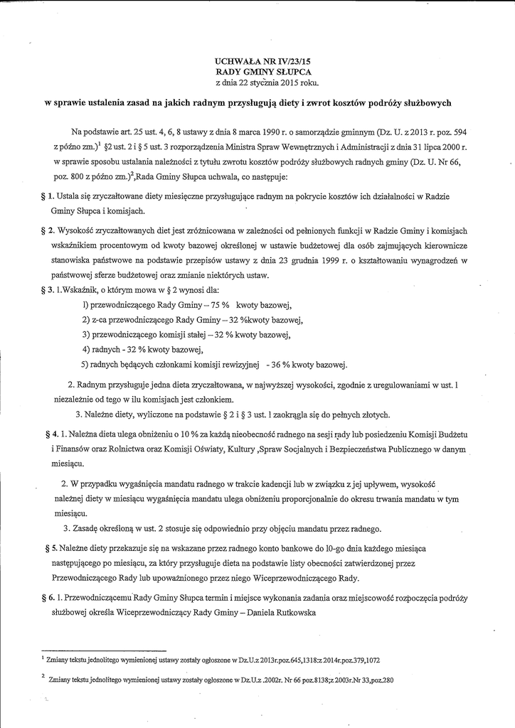 UCHWAiA NR IV/23/15 RADY GMINY SLUPCA z dnia 22 stycznia 2015 roku. w sprawie ustalenia zasad na jakich radnym przysluguj^ diety i zwrot kosztow podrozy sluzbowych Na podstawie art. 25 ust. 4, 6, 8 ustawy z dnia 8 marca 1990 r. o samorz^dzie gmionym (Dz. U. z2013 r. poz. 594 z poino zm.)^ §2 ust. 2 i § 5 ust 3 rozporz^dzenia Ministra Spraw Wewn§trznych i Administracji z dnia 31 lipca2000 r. w sprawie sposobu ustalania nalezaosci z tytuhi zwrotu kosztow podrozy siuzbowych radnych gminy (Dz. U. Nr 66, poz. 800 z pozno ztn.)",Rada Gminy Slupca ucbwala, co nast?puje: § 1. Ustala si? zryczaltowane diety miesi^czne przysluguj^ce radnym na pokrycie kosztow ich dzialalnosci w Radzie Gminy Slupca i komisjach. § 2. Wysokosc zryczaltowanych diet jest zroznicowana w zaleznosci od peMonych funkcji w Radzie Gminy i komisjach wskaznikiem procentowym od kwoty bazowej okreslonej w ustawie budzetowej dla osob zajmuj^cych kierownicze stanowiska panstwowe na podstawie przepisow ustawy z dnia 23 gmdnia 1999 r. o ksztaitowaniu wynagrodzen w panstwowej sferze budzetowej oraz zmianie niektorych ustaw. § 3. l.Wskazruk, o ktorym mowa w § 2 wynosi dla: 1) przewodnicz^cego Rady Gminy - 75 % kwoty bazowej, 2) z-ca przewodnicz^cego Rady Gminy - 32 %kwoty bazowej, 3) przewodnicz^cego komisji stalej - 32 % kwoty bazowej, 4) radnych - 32 % kwoty bazowej, 5) radnych b^d^cych czlonkami komisji rewizyjnej - 3 6 % kwoty bazowej. 2. Radnym przyshiguje jedna dieta zryczaitowana, w najwyzszej wysokosci, zgodnie z uregulowaniami w ust. 1 niezaleznie od tego w ilu komisjach jest czlonkiem. 3. Nalezne diety, wyliczone na podstawie § 2 i § 3 ust. 1 zaokr^la si? do pelnych ziotych. § 4.1. Nalezna dieta ulega obnizeniu o 10 % za kazd^ nieobecnosc radnego na sesji rady lub posiedzeniu Komisji Budzetu i Finansow oraz Rolnictwa oraz Komisji Oswiaty, Kultury ,Spraw Socjakiych i Bezpieczehstwa PubUcznego w danym miesi^cu. 2. W przypadku wygasni^cia mandatu radnego w trakcie kadencji lub w zwiqzku z jej uplywem, wysokosd nale^ej diety w miesi^cu wyga^ni?cia mandatu ulega obnizeniu proporcjonalnie do okresu trwania mandatu w tym miesi^cu. 3. Zasad? okre^lon^ w ust. 2 stosuje si? odpowiednio przy obj?ciu mandatu pizez radnego. § 5. Nalezne diety przekazuje sie na wskazane przez radnego konto bankowe do 10-go dnia kazdego miesi^ca nast?puj^cego po miesi^cu, za ktory przyshiguje dieta na podstawie hsty obecnosci zatwierdzonej przez Przewodnicz^cego Rady lub upowaznionego przez niego Wiceprzewodniczqcego Rady. § 6.1. Przewodnicz^cemu Rady Gminy Shipca termin i miejsce wykonania zadania oraz miejscowosc rozpocz?cia podrozy sluzbowej okreSla Wiceprzewodnicz^cy Rady Gminy — Daniela Rutkowska ' Zmiany tekstujednoUtegowymienionej ustawyzostJ^og}oszonewDz.U.z20I3r.poz.645,1318:z2014r.po2L3 ^ Zmiany tekstujednolitego wymienionej ustawy zostaJy ogloszone w Dz.U.z .2002r. Nr 66 poz.8138;z 2003r.Nr 33,pozJ280 2. Radnym Gminy tennin i miejsce wykonania zadanla-oraz miejscowosc rozpocz^cia i zakonczenia podrozy sluzbowej 'okresla Przewodnicz^cy Rady Gminy lub upowazniony przez niego jeden z Wiceprzewodnicz^cych Rady Gminy 3. Wprzypadkuprzejazdow w podrozy sluzbowej pojazdem samochodowym nieb^d^cym wlasnosci^ Gminy radnemu przyshiguje zwrot kosztow przejazdu wg maksymahiych stawek ustalonych na podstawie Zarz^dzeniaNr 40/2013 Wojta Gminy Slupca z dnia 20 maja 2013 r. w sprawie:. Ustalenia wysokosci stawek za jeden kilometr przebiegu samochodu osobowego, motocykla i motoroweru nieb§d^cyoh wlasnosci^ pracodawcy dla pracownikow Urz?du Gminy w Slupcy 4. Radny zobowi^ny jest przedlozyc delegacj? do rozJiczenia do Referatu Finansowo-Ksi^gowego Urz?du Gminy w Slupcy w terminie 14 dni od dnia zakonczenia podrozy shg^^owej. § 7. Traci moc uchwala Nr rV/19/1 IRady Gminy Shipca z dnia 20 stycznia 2011 roku w sprawie zmiany ustalenia zasad i wysokosci diet radnych Rady Gminy Shipca. § 8. Wykonanie uehwaly powierza si? Przewodnicz^cemu Rady Gminy Shipca oraz Wojtowi Gminy Shipca § 9. Uchwala wchodzi w zycie z dniempodj?cia i z mocq, obowi^j^c^ od 1 stycznia 2015 r.