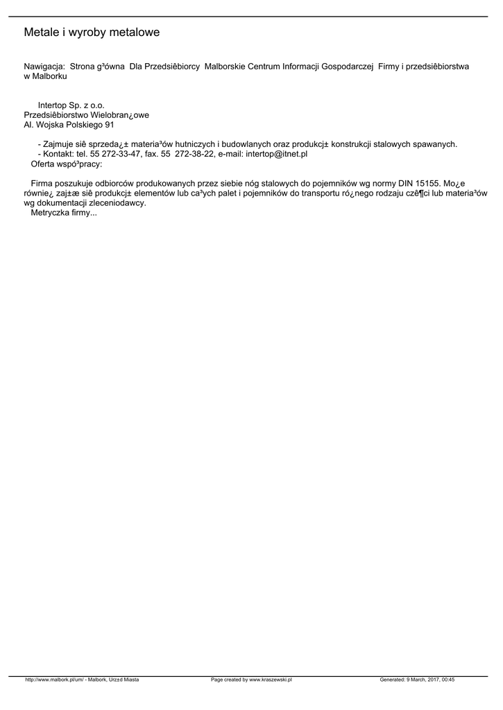 Metale i wyroby metalowe Nawigacja: Strona g³ówna Dla Przedsiêbiorcy Malborskie Centrum Informacji Gospodarczej Firmy i przedsiêbiorstwa w Malborku Intertop Sp. z o.o. Przedsiêbiorstwo Wielobran¿owe Al. Wojska Polskiego 91 - Zajmuje siê sprzeda¿± materia³ów hutniczych i budowlanych oraz produkcj± konstrukcji stalowych spawanych. - Kontakt: tel. 55 272-33-47, fax. 55 272-38-22, e-mail: [email protected] Oferta wspó³pracy: Firma poszukuje odbiorców produkowanych przez siebie nóg stalowych do pojemników wg normy DIN 15155. Mo¿e równie¿ zaj±æ siê produkcj± elementów lub ca³ych palet i pojemników do transportu ró¿nego rodzaju czê¶ci lub materia³ów wg dokumentacji zleceniodawcy. Metryczka firmy... http://www.malbork.pl/um/ - Malbork, Urz±d Miasta Page created by www.kraszewski.pl Generated: 9 March, 2017, 00:45