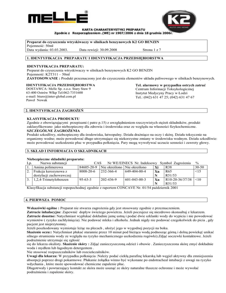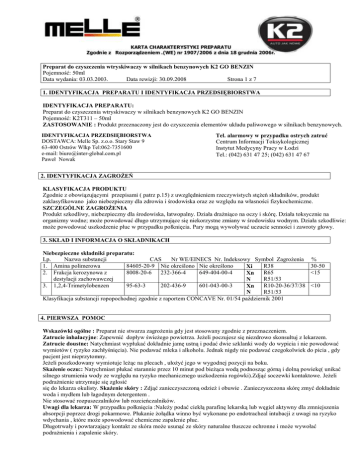 Preparat do czyszczenia wtryskiwaczy w silnikach benzynowych K2 GO BENZIN Pojemność: 50ml Data wydania: 03.03.2003. Data rewizji: 30.09.2008 Strona 1 z 7 1. IDENTYFIKACJA PREPARATU I IDENTYFIKACJA PRZEDSIĘBIORSTWA IDENTYFIKACJA PREPARATU: Preparat do czyszczenia wtryskiwaczy w silnikach benzynowych K2 GO BENZIN Pojemność: K2T311 – 50ml ZASTOSOWANIE : Produkt przeznaczony jest do czyszczenia elementów układu paliwowego w silnikach benzynowych. IDENTYFIKACJA PRZEDSIĘBIORSTWA DOSTAWCA: Melle Sp. z.o.o. Stary Staw 9 63-400 Ostrów Wlkp Tel:062-7351600 e-mail: [email protected] Paweł Nowak Tel. alarmowy w przypadku ostrych zatruć Centrum Informacji Toksykologicznej Instytut Medycyny Pracy w Łodzi Tel.: (042) 631 47 25; (042) 631 47 67 2. IDENTYFIKACJA ZAGROśEŃ KLASYFIKACJA PRODUKTU Zgodnie z obowiązującymi przepisami ( patrz p.15) z uwzględnieniem rzeczywistych stęŜeń składników, produkt zaklasyfikowano jako niebezpieczny dla zdrowia i środowiska oraz ze względu na własności fizykochemiczne. SZCZEGÓLNE ZAGROśENIA Produkt szkodliwy, niebezpieczny dla środowiska, łatwopalny. Działa draŜniąco na oczy i skórę. Działa toksycznie na organizmy wodne; moŜe powodować długo utrzymujące się niekorzystne zmiany w środowisku wodnym. Działa szkodliwie: moŜe powodować uszkodzenie płuc w przypadku połknięcia. Pary mogą wywoływać uczucie senności i zawroty głowy. 3. SKŁAD I INFORMACJA O SKŁADNIKACH Niebezpieczne składniki preparatu: Lp. Nazwa substancji CAS Nr WE/EINECS Nr. Indeksowy Symbol ZagroŜenia % 1. Amina polimerowa 84605-20-9 Nie określono Nie określono R38 30-50 Xi 2. Frakcja kerozynowa z 8008-20-6 232-366-4 649-404-00-4 R65 <15 Xn destylacji zachowawczej R51/53 N 3. 1,2,4-Trimetylobenzen 95-63-3 202-436-9 601-043-00-3 R10-20-36/37/38 <10 Xn R51/53 N Klasyfikacja substancji ropopochodnej zgodnie z raportem CONCAVE Nr. 01/54 październik 2001 4. PIERWSZA POMOC Wskazówki ogólne : Preparat nie stwarza zagroŜenia gdy jest stosowany zgodnie z przeznaczeniem. Zatrucie inhalacyjne: Zapewnić dopływ świeŜego powietrza. JeŜeli poczujesz się niezdrowo skonsultuj z lekarzem. Zatrucie doustne: Natychmiast wypłukać dokładnie jamę ustną i podać dwie szklanki wody do wypicia i nie powodować wymiotów ( ryzyko zachłyśnięcia). Nie podawać mleka i alkoholu. Jednak nigdy nie podawać czegokolwiek do picia , gdy pacjent jest nieprzytomny. JeŜeli poszkodowany wymiotuje leŜąc na plecach , ułoŜyć jego w wygodnej pozycji na boku. SkaŜenie oczu:: Natychmiast płukać starannie przez 10 minut pod bieŜąca wodą podnosząc górną i dolną powiekę( unikać silnego strumienia wody ze względu na ryzyko mechanicznego uszkodzenia rogówki).Zdjąć soczewki kontaktowe. JeŜeli podraŜnienie utrzymuje się zgłosić się do lekarza okulisty. SkaŜenie skóry : Zdjąć zanieczyszczoną odzieŜ i obuwie . Zanieczyszczona skórę zmyć dokładnie woda i mydłem lub łagodnym detergentem . Nie stosować rozpuszczalników lub rozcieńczalników. Uwagi dla lekarza: W przypadku połknięcia :NaleŜy podać ciekłą parafinę lekarską lub węgiel aktywny dla zmniejszenia absorpcji poprzez drogi pokarmowe. Płukanie Ŝołądka winno być wykonane po endotracheal intubacji z uwagi na ryzyko wdychania , które moŜe spowodować chemiczne zapalenie płuc. Długotrwały i powtarzający kontakt ze skóra moŜe usunąć ze skóry naturalne tłuszcze ochronne i moŜe wywołać podraŜnienia i zapalenie skóry. Preparat do czyszczenia wtryskiwaczy w silnikach benzynowych K2 GO BENZIN Pojemność: 50ml strona 2 z 7 5. POSTĘPOWANIE W PRZYPADKU POśARU Odpowiednie środki gaśnicze: Woda metodą natryskową , suche środki gaśnicze, piana odporna na działanie alkoholu, dwutlenek węgla .Chłodzić preparaty znajdujące się w okolicy poŜaru prysznicem wodnym lub usunąć je z obszaru zagroŜonego. Środki gaśnicze , których nie wolno uŜywać ze względów bezpieczeństwa: Gaszenie pełnym strumieniem wody. Środki ochrony indywidualnej dla straŜaków: UŜywać zabezpieczeń dla górnych dróg oddechowych , sprzęt ochronny dróg oddechowych –taki jak na wyposaŜeniu straŜaków oraz ubranie ochronne. ZagroŜenia związane ze spalaniem: Substancja łatwopalna .W czasie poŜaru uwalniać się mogą : gazy/ opary wdychanie ich jest bardzo niebezpieczne. Nie oddychać dymem. Inne: W przypadku poŜaru nie przebywać w strefie zagroŜenia bez ubrania ognioodpornego i aparatu tlenowego. ZagroŜenia związane ze spalaniem: Brak niebezpiecznych produktów rozkładu. Inne wskazówki: Zanieczyszczoną wodę zebrać do zbiorników. Nie moŜna jej usuwać do kanalizacji. 6. POSTĘPOWANIE W PRZYPADKU NIEZAMIERZONEGO UWOLNIENIA DO ŚRODOWISKA Środki ochrony indywidualnej: Przy duŜych uwolnieniach wentylować przestrzeń Otworzyć drzwi i okna. Nie wdychać par. Unikać zanieczyszczenia substancją. Środki ostroŜności w zakresie ochrony środowiska: Zapobiec przedostaniu się do wód bez uprzedniej neutralizacji w oczyszczalni ścieków. W przypadku zanieczyszczenia produktem rzek , jezior , gruntu lub kanalizacji zawiadomić o tym odpowiednie władze. Metody oczyszczania: Absorbować materiałem pochłaniającym ciecze i unieszkodliwić. ( piasek , ziemia okrzemkowa, uniwersalne środki wiąŜące , trociny) Małe ilości rozlanej cieczy przysypać materiałem chłonnym i zebrać do zamykanego pojemnika ; zanieczyszczoną powierzchnię spłukać wodą , wodę zebrać do pojemników. Większe ilości substancji zebrać do szczelnie zamkniętych pojemników. Jeśli to moŜliwe zlikwidować wyciek ( uszkodzone opakowanie umieścić w opakowaniu ochronnym lub zawartość przelać do innego opakowania ) 7. POSTĘPOWANIE Z PREPARATEM I ICH MAGAZYNOWANIE Wskazówki odnośnie bezpiecznego obchodzenia się z produktem: -W przypadku stosowania produktu zgodnie z przeznaczeniem nie są wymagane Ŝadne szczególne działania. Nie są wymagane Ŝadne szczególne działania odn