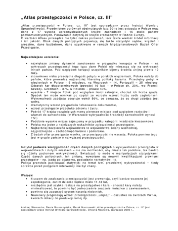 „Atlas przest pczo ci w Polsce, cz. III” „ At l as pr zes t p c zo c i w Po ls c e, c z. I I I ” je s t s p or z d zan y pr ze z I nst yt u t W ym iar u S pr aw ie dl iw o c i. P r ze dm i ot e m por ówn a ob e jm u j c yc h lat a 9 0-t e j est s yt ua c ja w Po l s c e or a z da ne z 17 w ys ok o upr ze m ys łow io n yc h k r ajów zac h o dni c h i 16 st ol ic pa stw po s tk om u ni st yc zn yc h . P or ów nan ia do t yc z 3 0 k r a jów zr z es zo n yc h w Ra d zie E ur op y. O w ar to c i At l a su pr z es d za n i e t ylk o zak r e s p or ów n a , l ec z t ak e w ie lo r ód eł inf or ma c ji i ich jak o . O bok d an yc h p oli c yjn yc h po jaw iaj si t ak e st a t ys t yk i s dów , w i zi e i ar e s zt ów , da n e bud et owe , da n e uz y sk iw ane w r a m a ch M i d z yn ar o d ow yc h B ad a O fiar Pr ze s t ps tw . Na jw a n i e jsz e u st al e nia: • • • • • • • • • • na jw i k s ze zm ia n y d yn am ik i za no t ow a no w pr z ypa dk u k or up c ja w P o ls c e - na w yk r e s ac h pr ze s t p c z o c i t eg o t yp u dan e P olsk i n ie m i e s zc z s i n a w yk r e s a c h i nn yc h p a s tw . P od w zg l dem k or u pc j i ur z dn ik ów b ij em y r ed n ia un ijn p raw ie 1 0 r a z y. st o s u nk ow o n isk a pr ze c i t na dł ugo pob yt u w p ol sk ich w i zie n ia c h, P ol sk a nale y d o pa s tw , k tór e pr ow a d z n ajb ar d zie j li ber a ln po lit yk k ar a n ia . Pr zec i t n y p ob yt w w i zi en ia ch w Po ls c e - 9 m ie s i c y, n a W gr ze c h – 14 , Por t ug a lii – 2 5 m i es i c y. O d s et ek k ar dług ot er m in ow yc h ( pow y e j 10 l a t) – w P o ls ce ok . 2 0%, w e Fr an c ji, S zw e c ji, C ze c ha c h – 3- %, w Ho lan dii – pr aw ie 40 %, w ys ok ie - 7 m ie js ce P ol sk i po d w zgl de m ilo c i za bó jst w, c hoc i a ic h li c zb a s pad a. S pa d ek ten m o e w ynik a p o c z c i ze w zr o s tu w zr ost li c zb y o sób za g in ion yc h . W yk r yw al n o za b ój st w os c yl uj e w ok ół 5 0%, c o o zna c za , e c o dr ug i za b ój c a je s t w oln y. dr a m at yc zn y w zr o st pr z ypa dk ów f ał s zow an ia d ok um ent ów , w zr o s t pr ze s t p stw pr ze c iwk o zd r owi u i yc iu. P o r ó d 17 k r a jów r ozw i ni t yc h m am y pi erw s z e m ie js c e p od w zg l d em r ozb o jów i w łam a d o sam och o dów ( w W ars zaw ie w yk r yw alno k rad zie y s a mo c h od ów w yno s i 1 %! ) P od o bn ie w ys ok ie m i ej s c za jmu j em y w pr z yp adk u k ate gor ii: k r adzi e e k ies zo nk ow e. P ol sk a m a je de n z naj ni s z yc h w sk a n ik ów zg ła s za ln o c i pr zes t p stw . Na jba r dzi ej bezp ie c zn e w oj ew ó d ztw a t o w o jew ó dzt wa c ian y w s c h odn iej , na jgr o n ie j s ze – za c h od n iop om or sk i e i pom or sk ie. Z b ada of iar pr ze s t p stw w yn ik a , ze pr zes t p c zo ni e w zr a st a . P o lsk a p o m im o t eg o j est w gr u pie pa stw o n ajw y s zej pr ze s t p c zo c i . c z ci da n yc h p ol ic yjn yc h o w yk r yw al no ci pr ze s t p s t w w In s t yt ut p o dw a a w iaryg od no w ojew ód ztw a c h i du y c h m ia s t a ch – n ie m a mo liw o c i, ab y m ia s t a tak p o do b ne, t ak bar d zo si r ó n ił y p ozi om em w yk r yw al no c i . w ia d c z y to m o e o m an ip u la c ja c h s ta t ys t yk am i. Cz d an yc h po l ic yjn yc h , i ch zm i an y, w yw ołan e s n ow ym i k w alif ik a c ja m i pr aw n ym i pr ze s t p s tw – np. ja zd a p o pija nem u, po s i ad ani e nar k ot yk ów, itd . P ol ic ja pr ze s t a ła p ubl ik ow a s ta t ys t yk i na t e ma t t zw . pr aw d ziw e j w yk r yw a lno c i – k ied y s pr aw c a pr ze d p o dj c iem int er w e ncj i n ie b ył zn a n y. Wn i o ski • k luc ze m do zw alc za n i a pr ze s t p c zo c i je s t pr ew en c ja, c z yli bar d z o w c zes n e je j za p ob ieg ani e, zan i m d zie ck o b d zie mi ał o 11, 1 2 lat , • n ie zb dn a je st s z ybk a re ak c ja na pr ze s t ps t wo i k ara - ch o c ia k ar y na le y m in im al izow a , t o p ow inn o b y j edn oc ze n ie zn a c zni e m n iej k ar z zaw i e s zen iem , • pow in no s i za o s tr z y s ys t e m k ar ani a n ie let n ic h, • Na uk ow c y pr o gn o zuj w zro s t pr ze s t p c zo c i „ un ijn ej” – o s zus t wa n a zw r ot a ch V A T- u, k w otac h dot a c ji do pr oduk c ji r ol nej it p. A n d r z e j S i e m a s z k o , B e a t a G r u s z c z y s k a , M a r e k M a r c z e ws k i „ A t l a s p r z e s t p c zo c i w P o l s c e , c z. I I I ” j e s t s p o r z d z a n y p r z e z I n s t y t u t W y m i a r u S p r a wi e d l i wo c i , O f i c y n a N a u k o w a , W a r s z a w a 2 0 0 3 r . ,