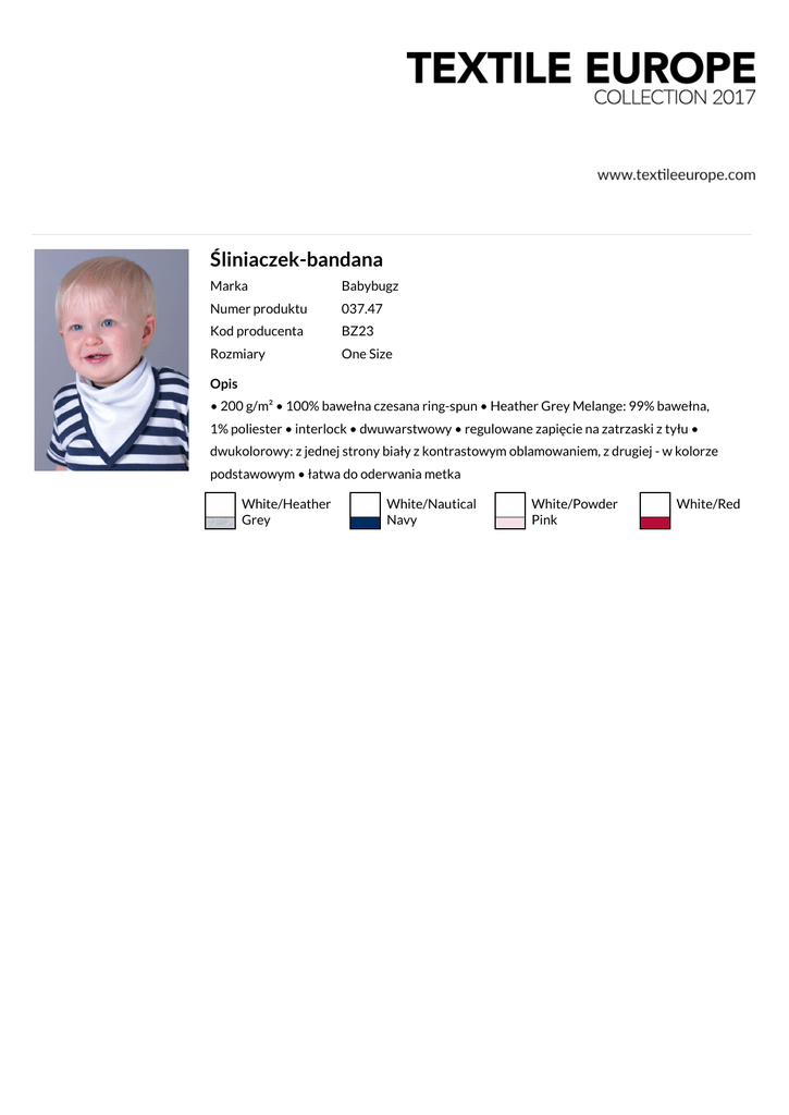 Śliniaczek-bandana Marka Babybugz Numer produktu 037.47 Kod producenta BZ23 Rozmiary One Size Opis • 200 g/m² • 100% bawełna czesana ring-spun • Heather Grey Melange: 99% bawełna, 1% poliester • interlock • dwuwarstwowy • regulowane zapięcie na zatrzaski z tyłu • dwukolorowy: z jednej strony biały z kontrastowym oblamowaniem, z drugiej - w kolorze podstawowym • łatwa do oderwania metka White/Heather Grey White/Nautical Navy White/Powder Pink White/Red